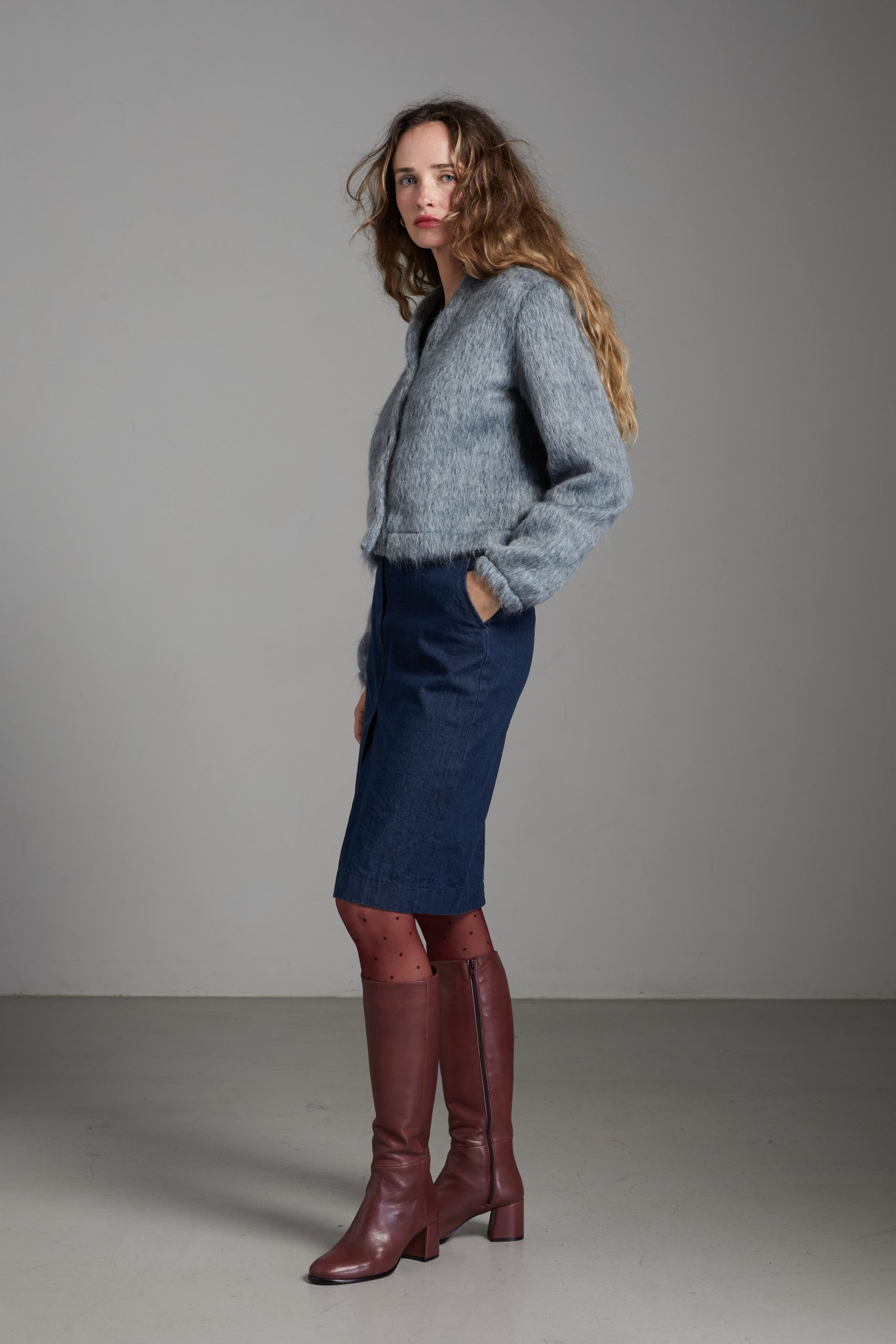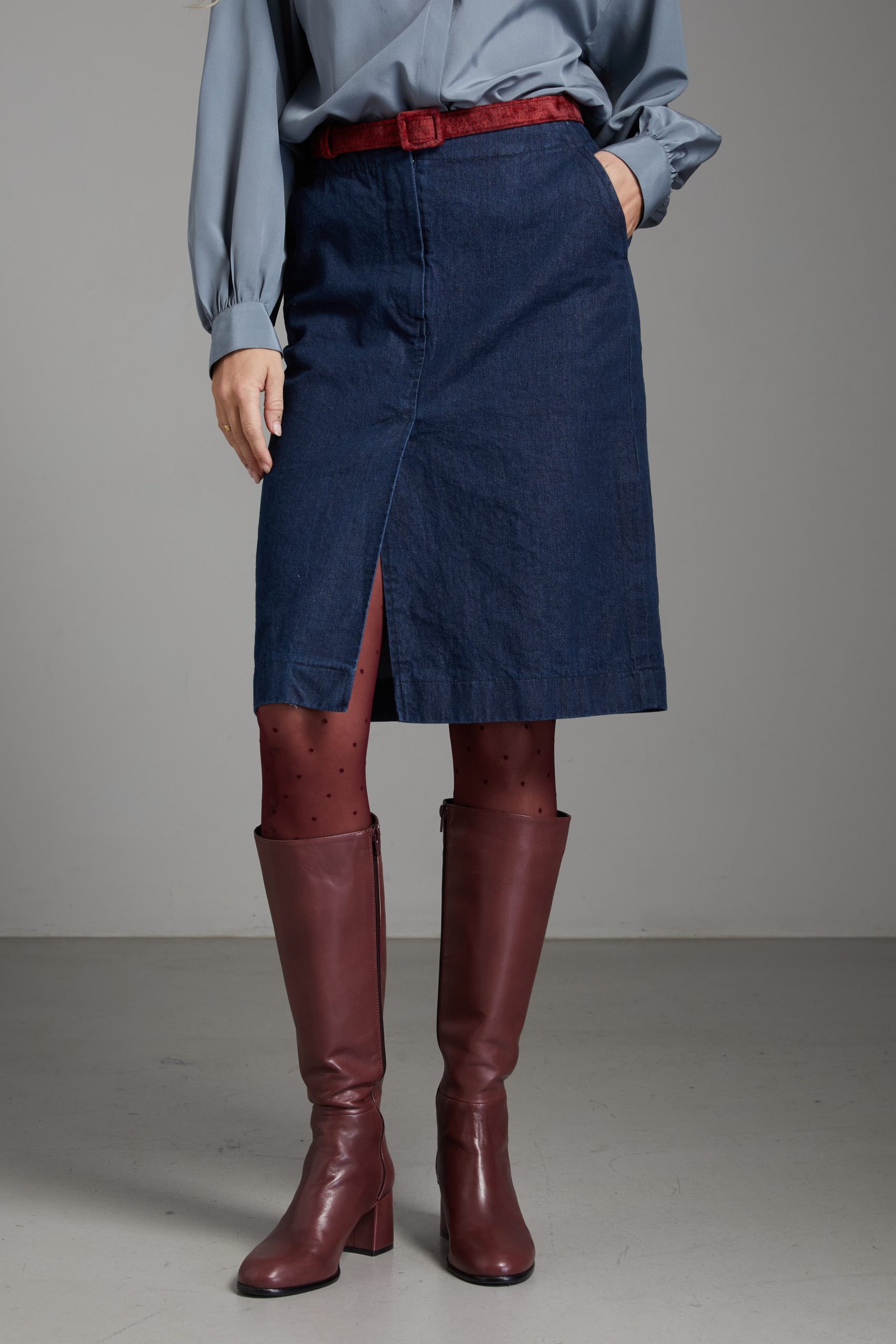 Gonna Virna di Carla Saibene, al ginocchio dalla linea dritta, con spacco centrale frontale, con dettagli ispirati ai pantaloni maschili, tasche laterali e patta centrale in denim blu.