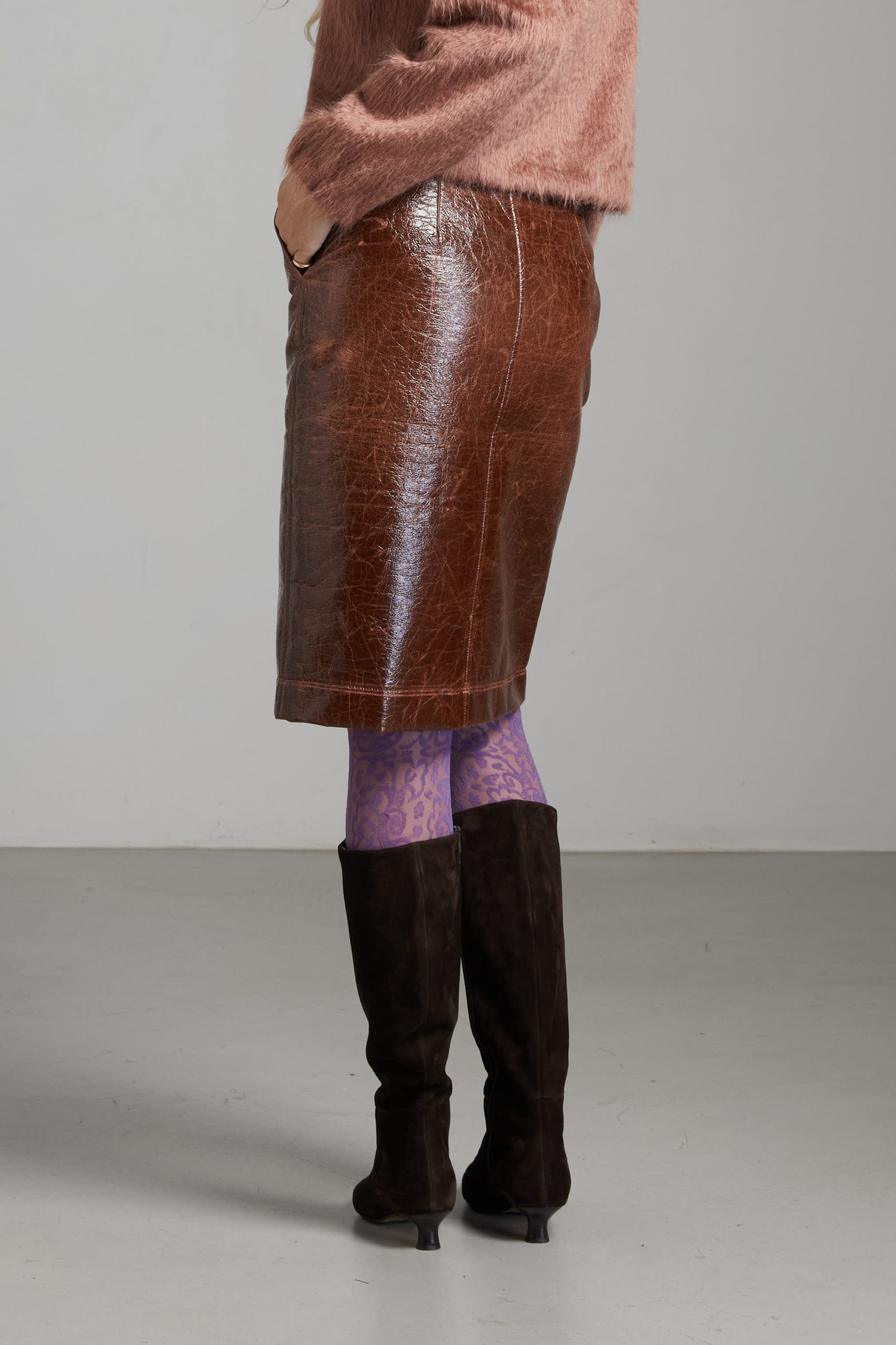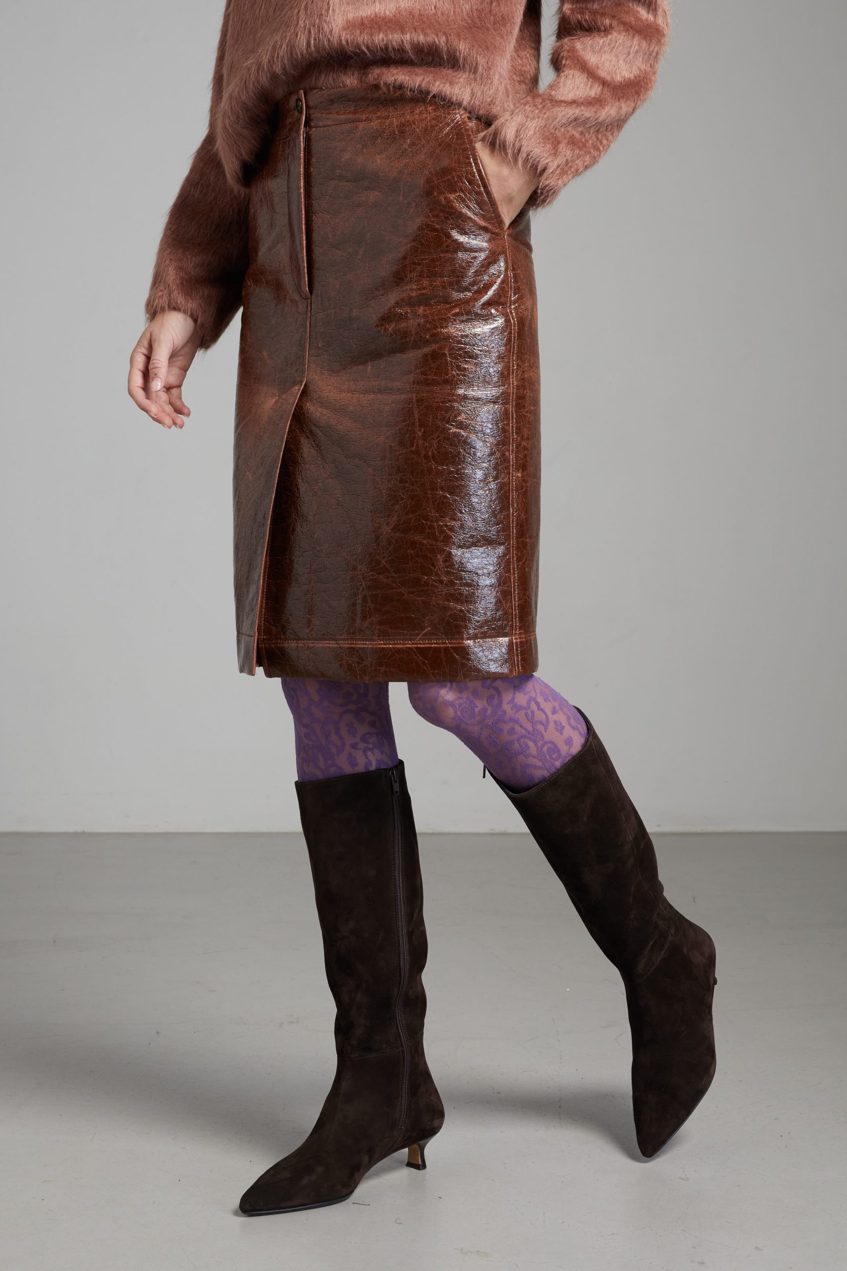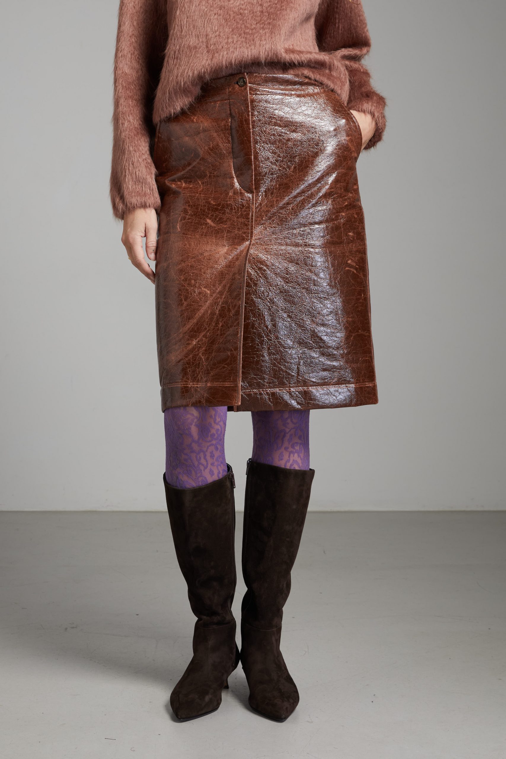 Gonna Virna di Carla Saibene, al ginocchio, dalla linea dritta, con spacco centrale frontale, con dettagli ispirati ai pantaloni maschili, tasche laterali e patta centrale in ecopelle marrone cognac effetto craclé invecchiato