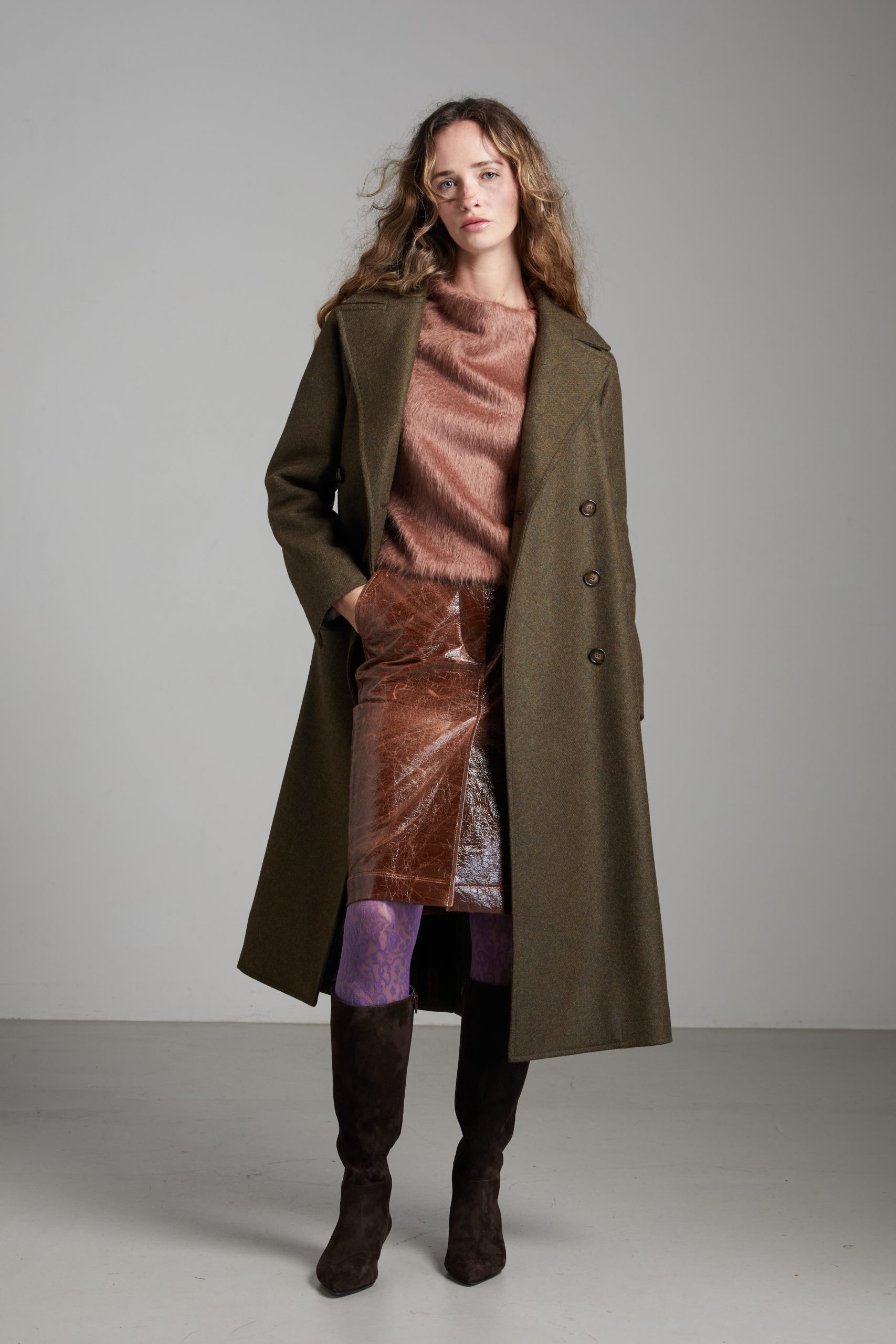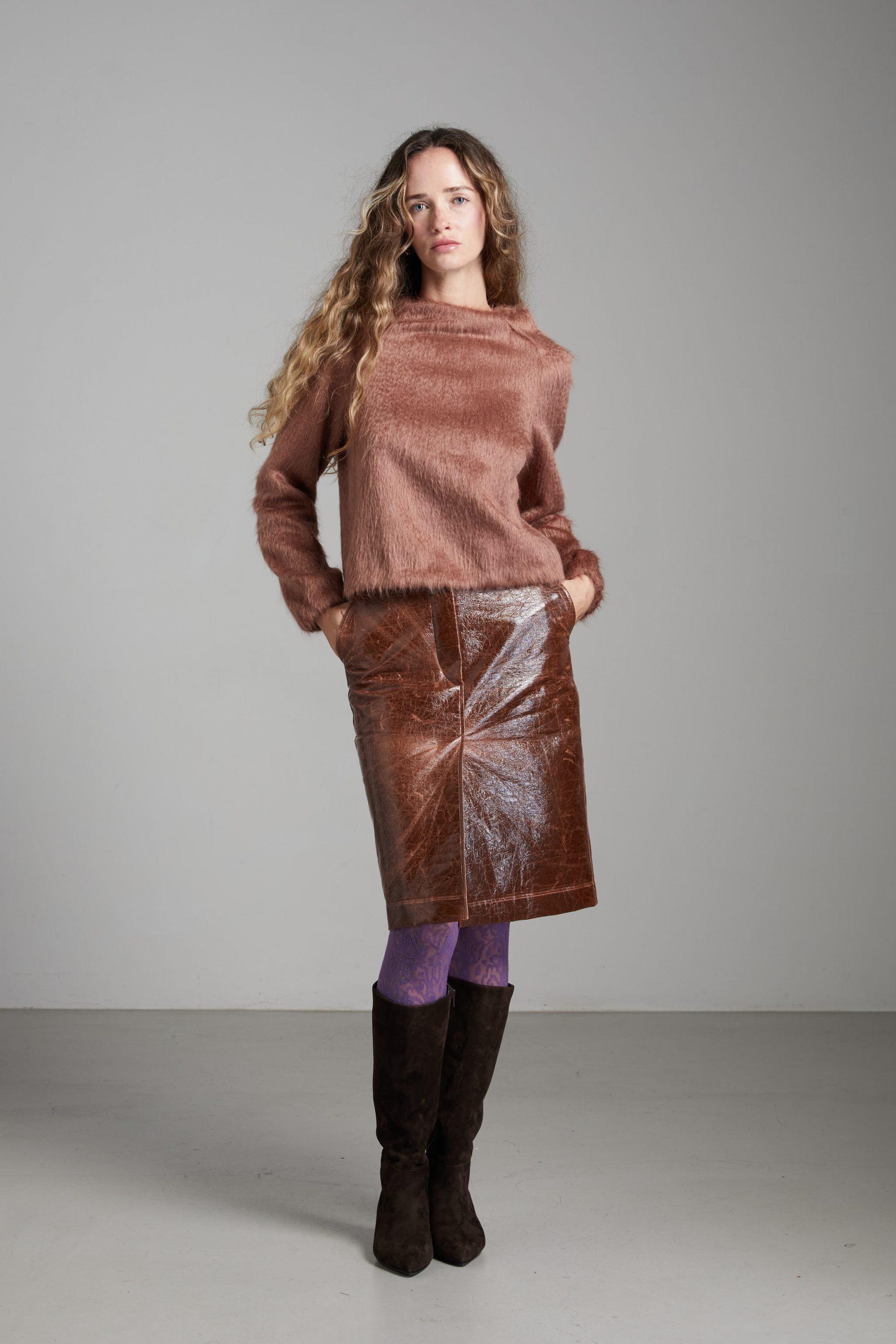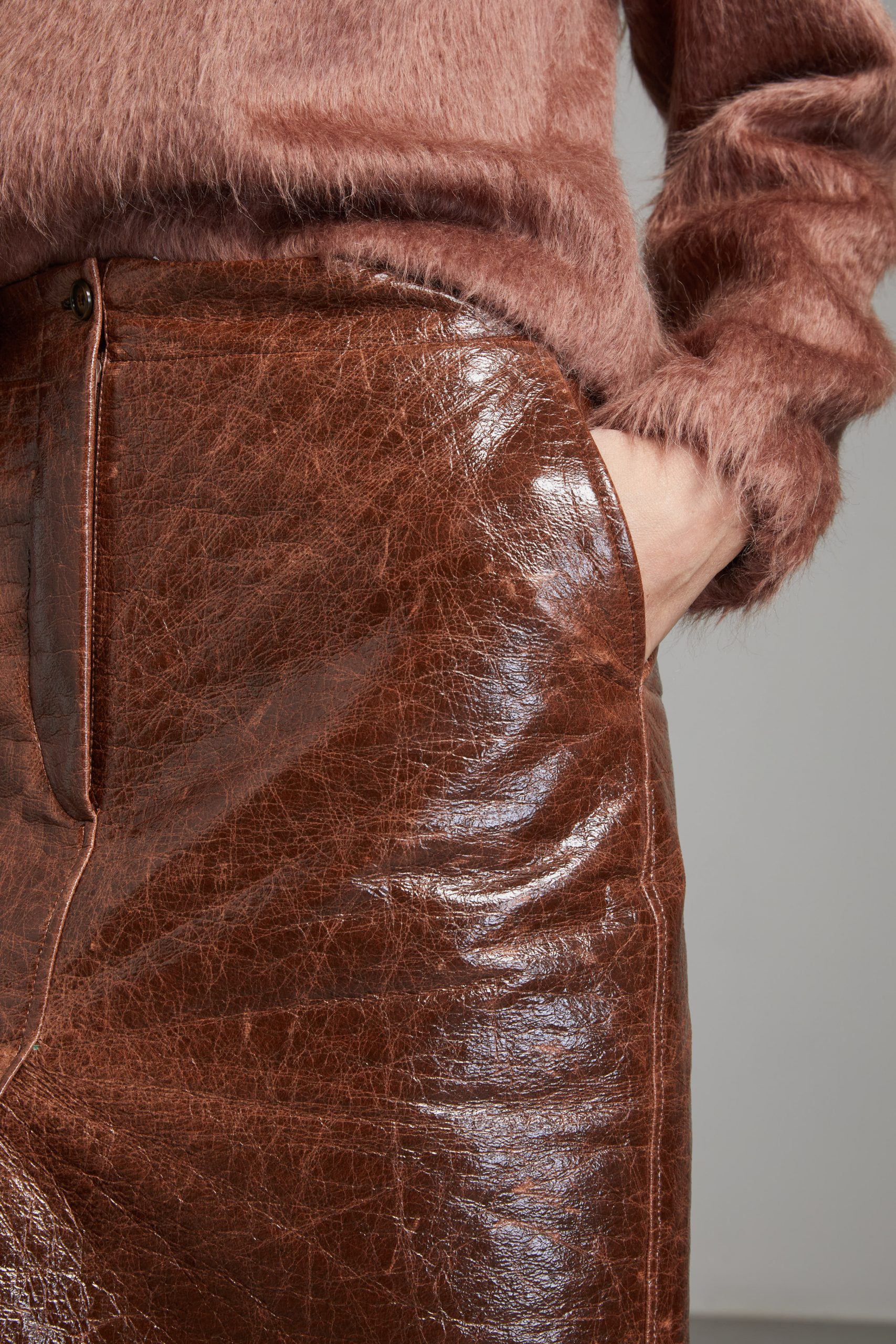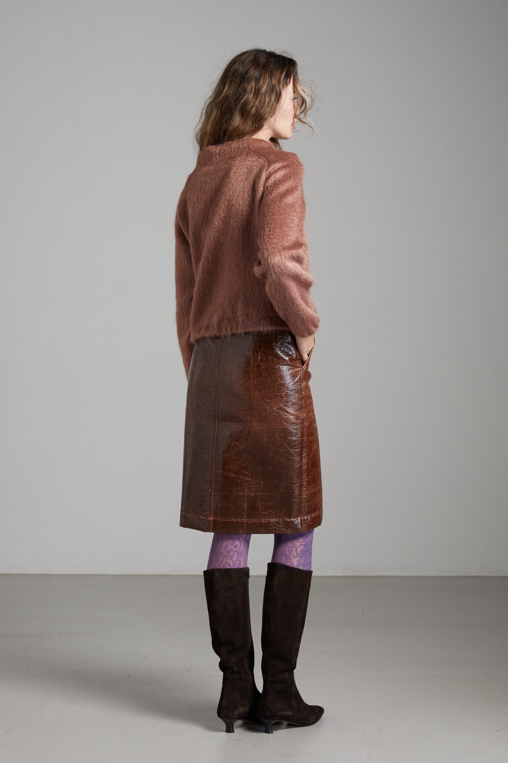 Gonna Virna di Carla Saibene, al ginocchio, dalla linea dritta, con spacco centrale frontale, con dettagli ispirati ai pantaloni maschili, tasche laterali e patta centrale in ecopelle marrone cognac effetto craclé invecchiato