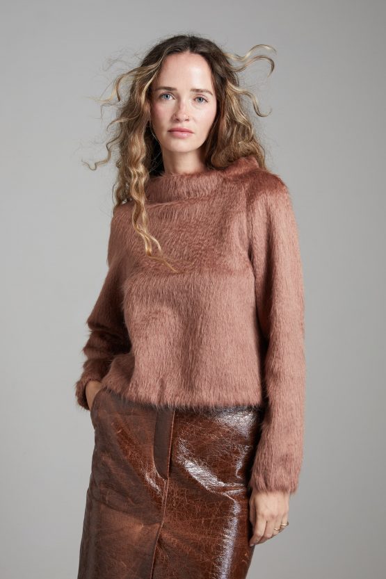Gonna Virna di Carla Saibene, al ginocchio, dalla linea dritta, con spacco centrale frontale, con dettagli ispirati ai pantaloni maschili, tasche laterali e patta centrale in ecopelle marrone cognac effetto craclé invecchiato