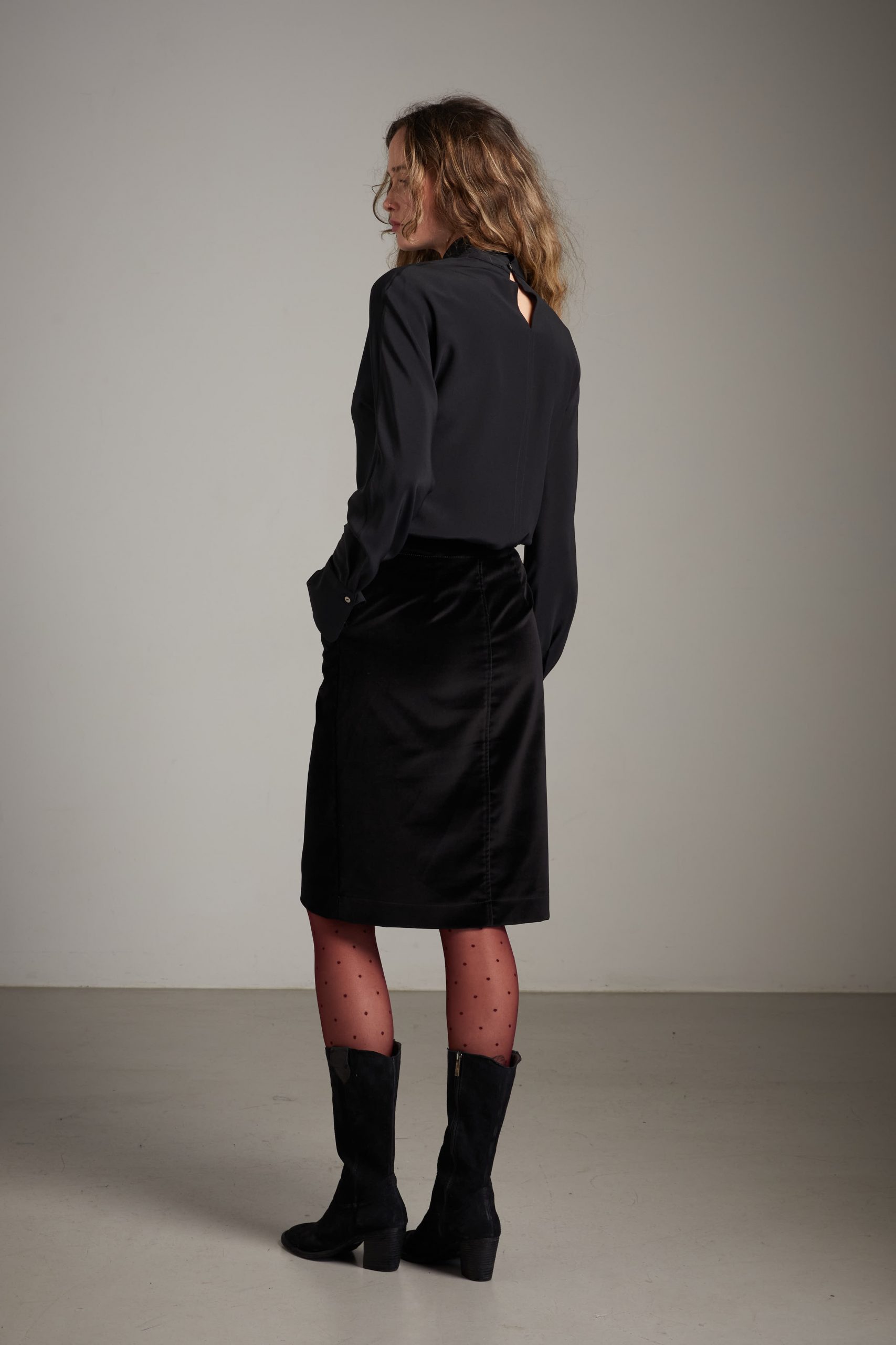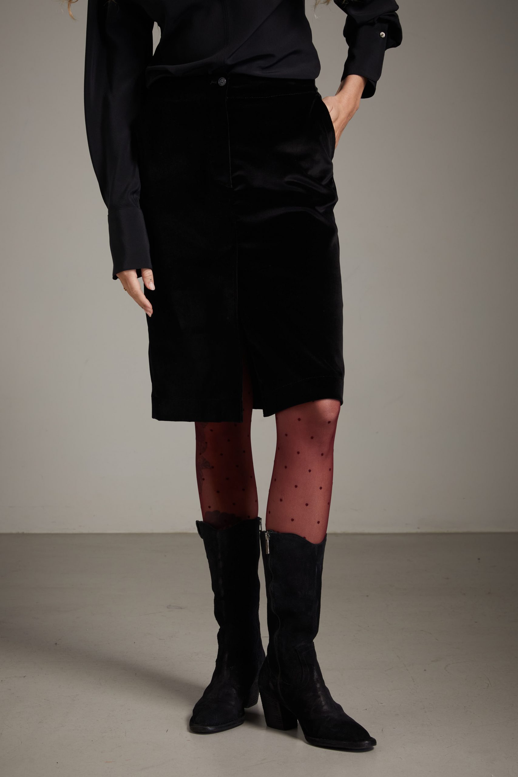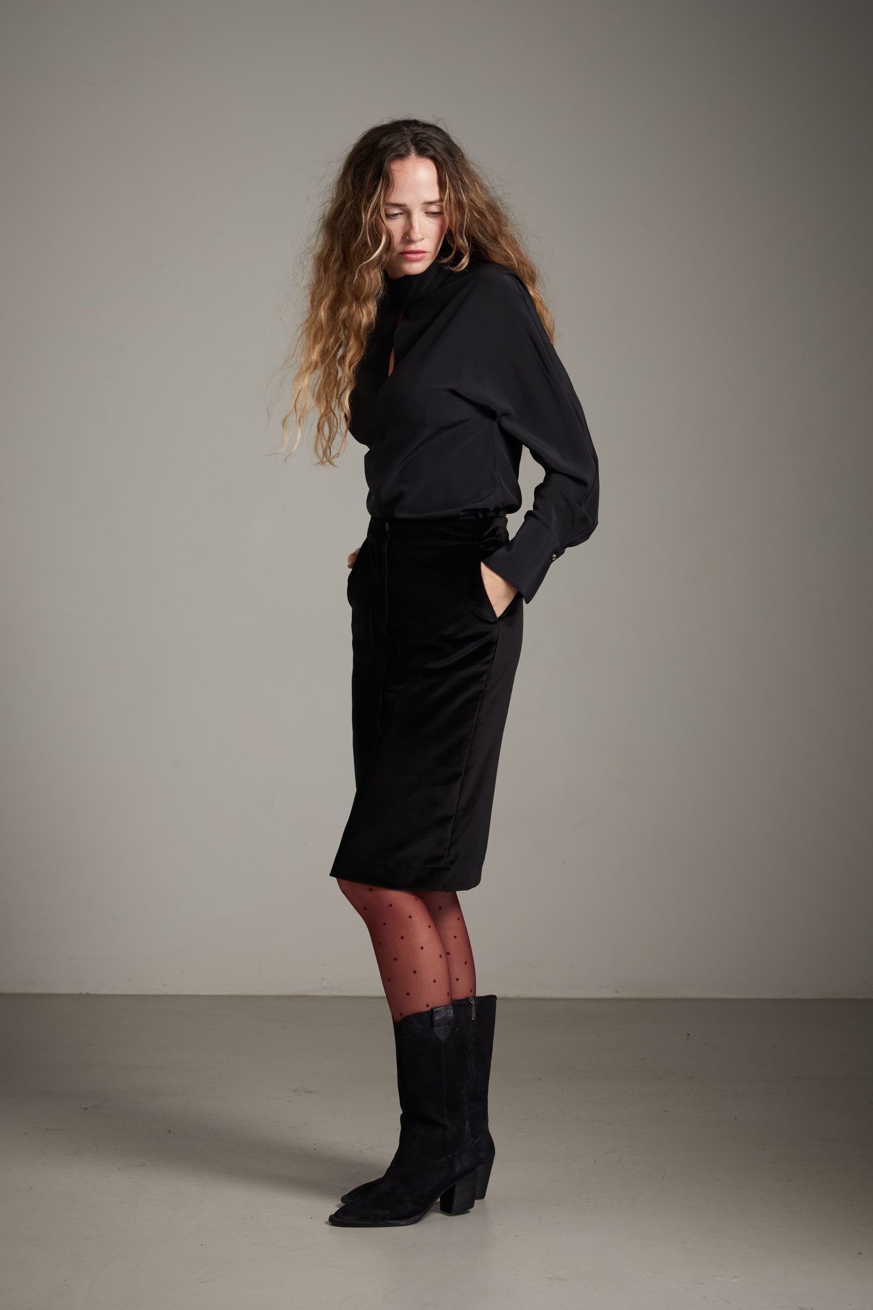 Gonna Virna di Carla Saibene, al ginocchio, dalla linea dritta, con spacco centrale frontale, con dettagli ispirati ai pantaloni maschili, tasche laterali e patta centrale in velluto a costine bordeaux