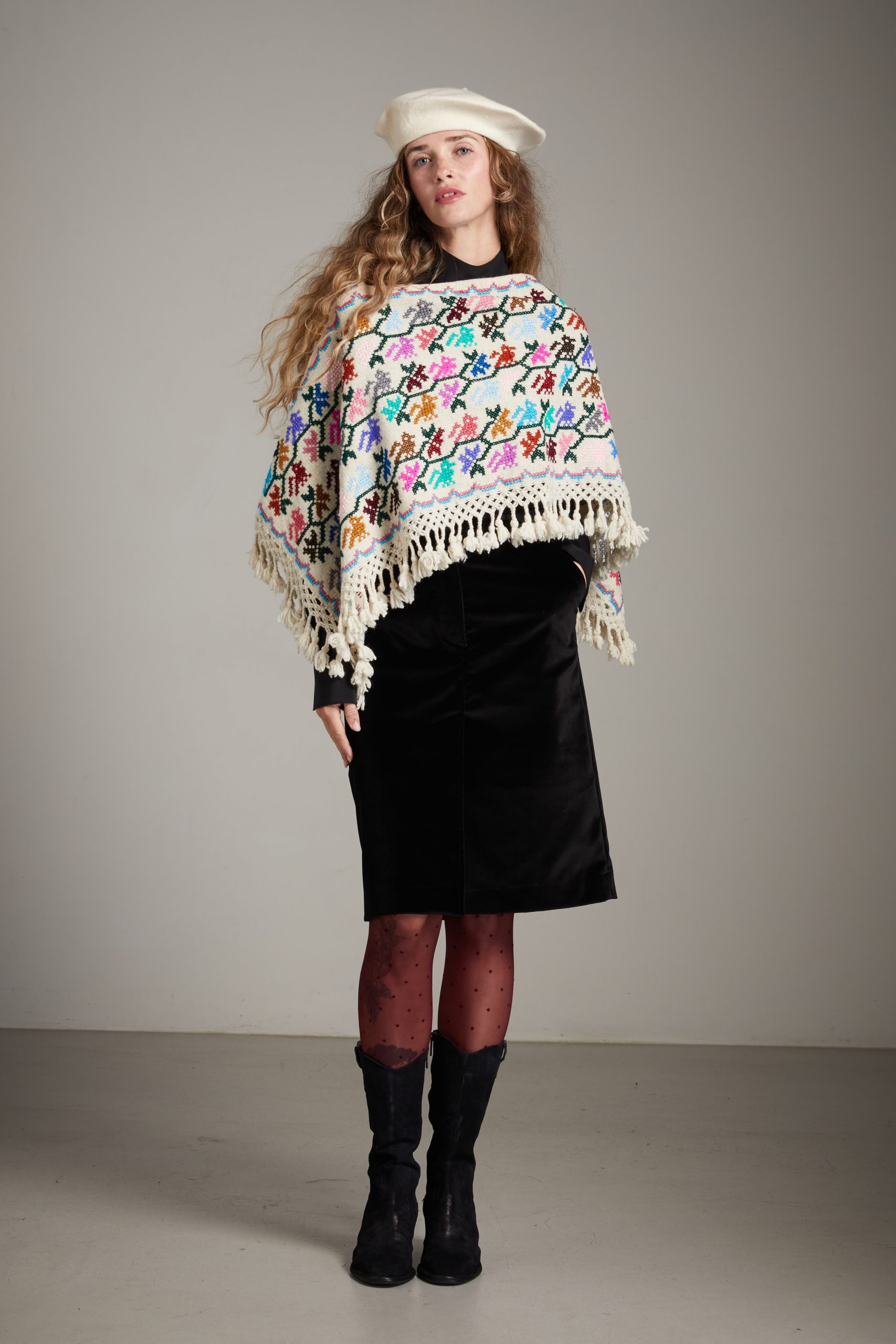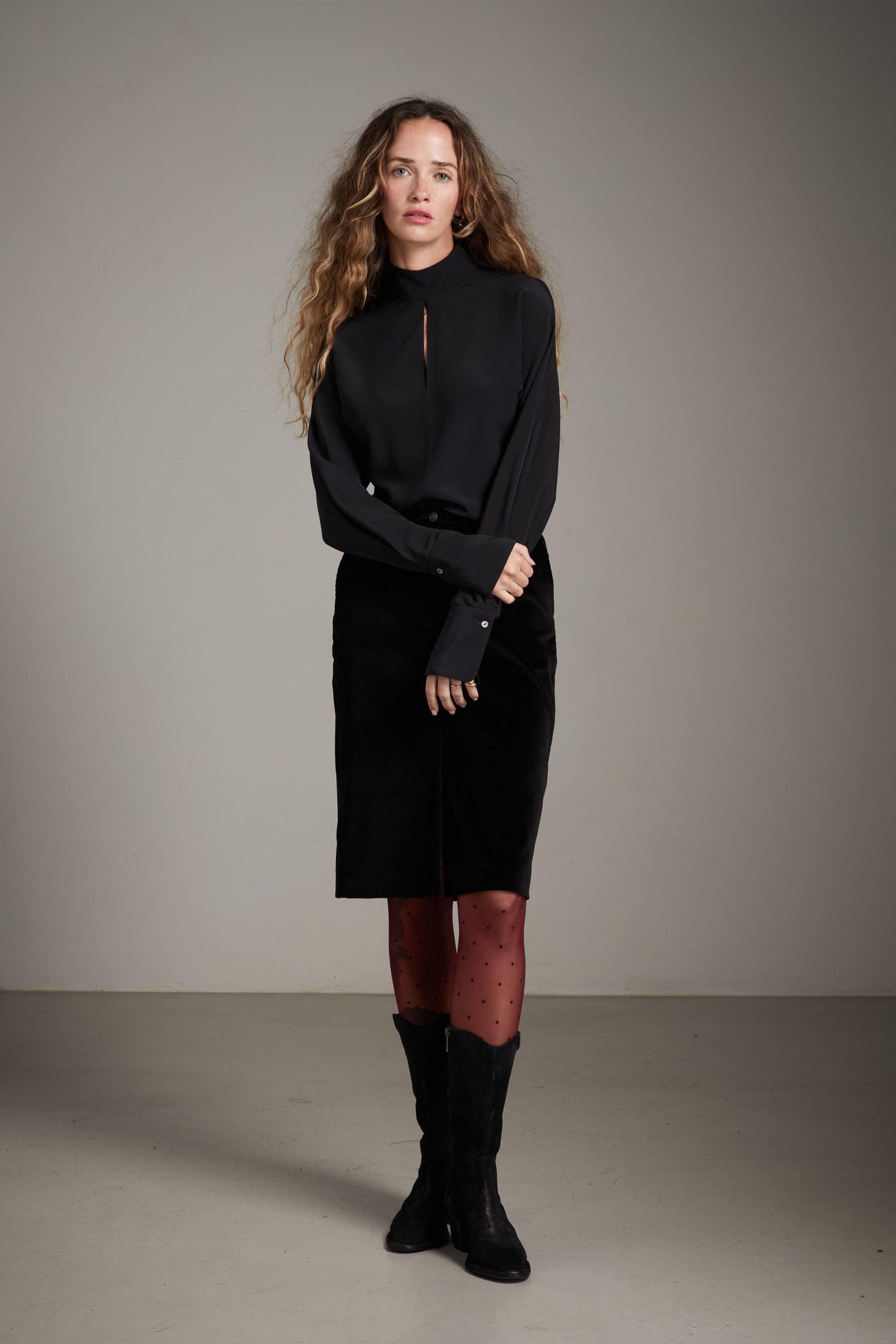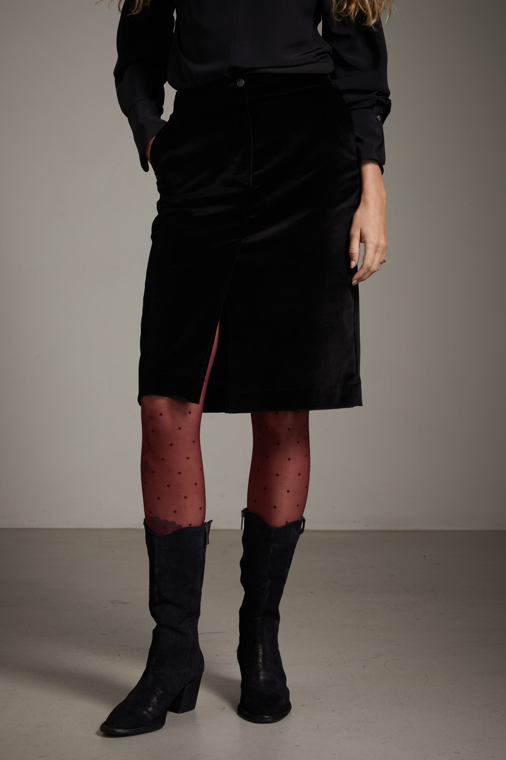 Gonna Virna di Carla Saibene, al ginocchio, dalla linea dritta, con spacco centrale frontale, con dettagli ispirati ai pantaloni maschili, tasche laterali e patta centrale in velluto a costine bordeaux