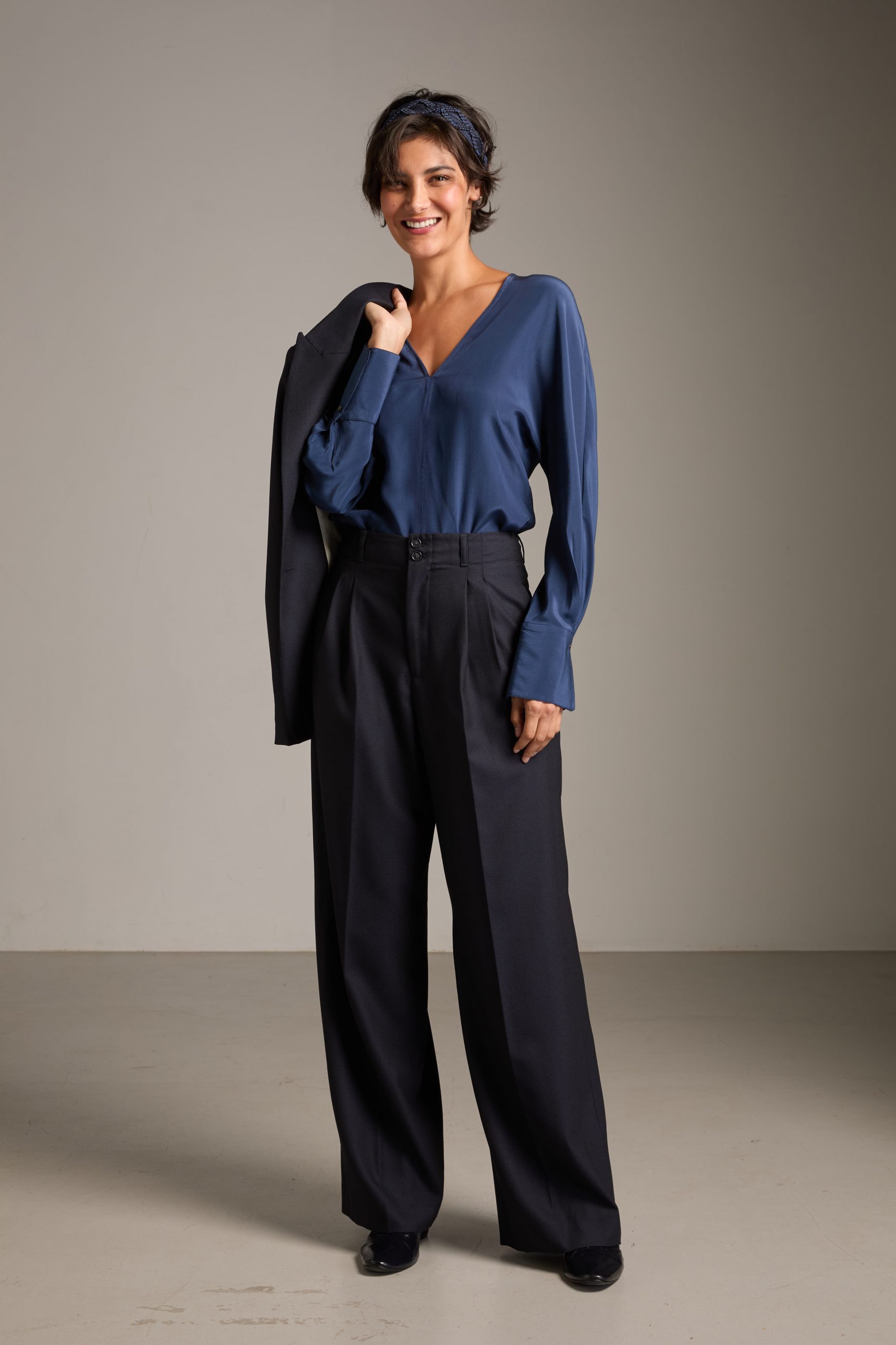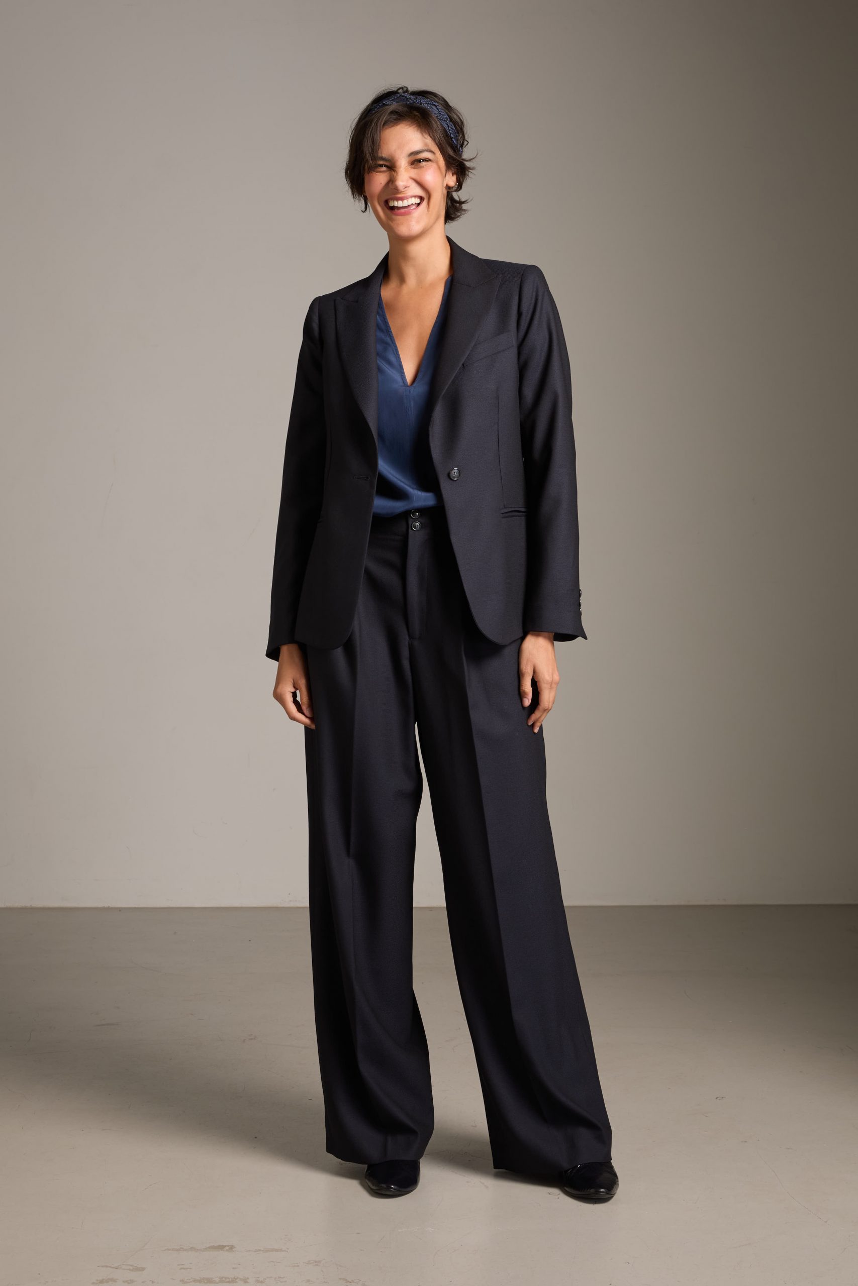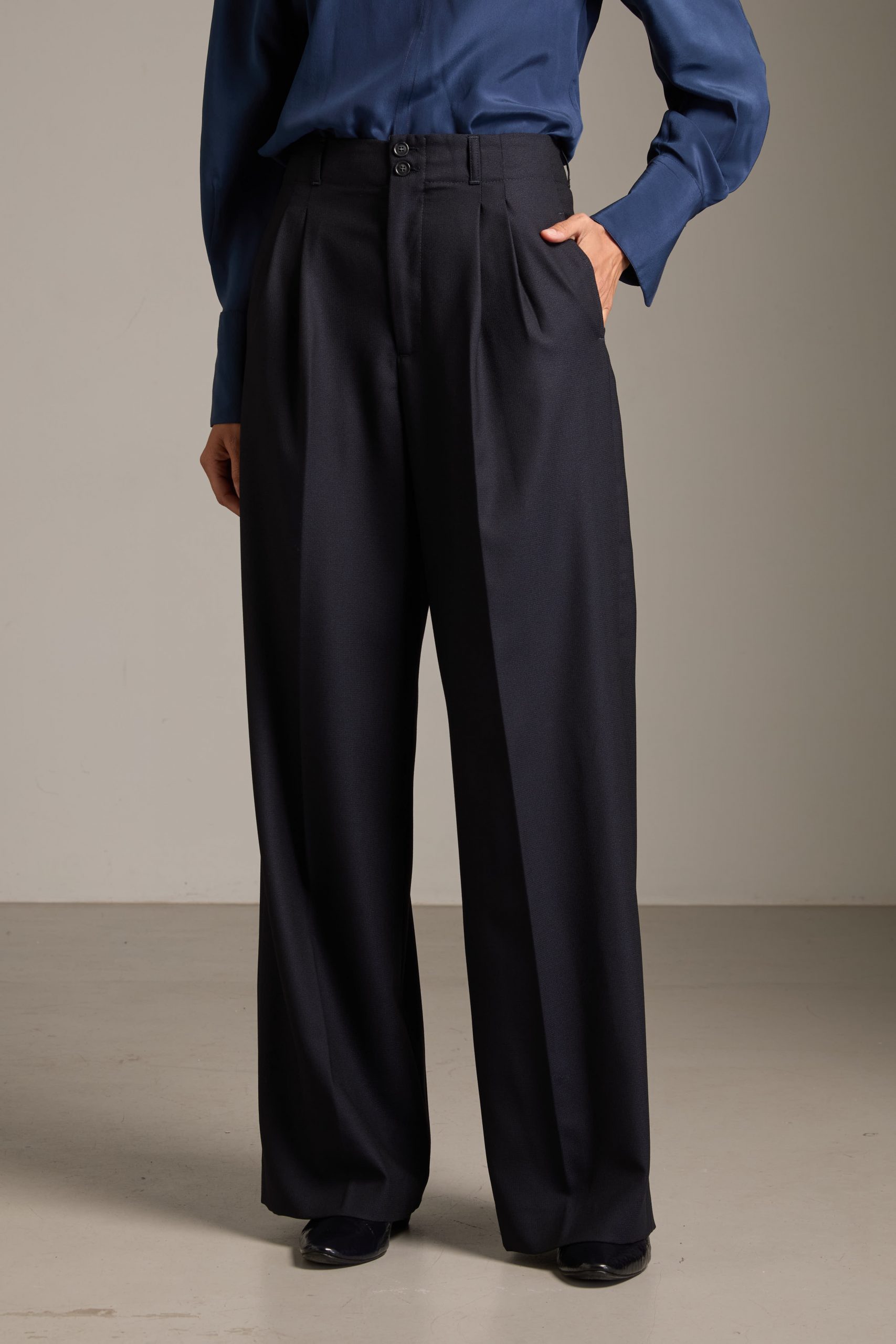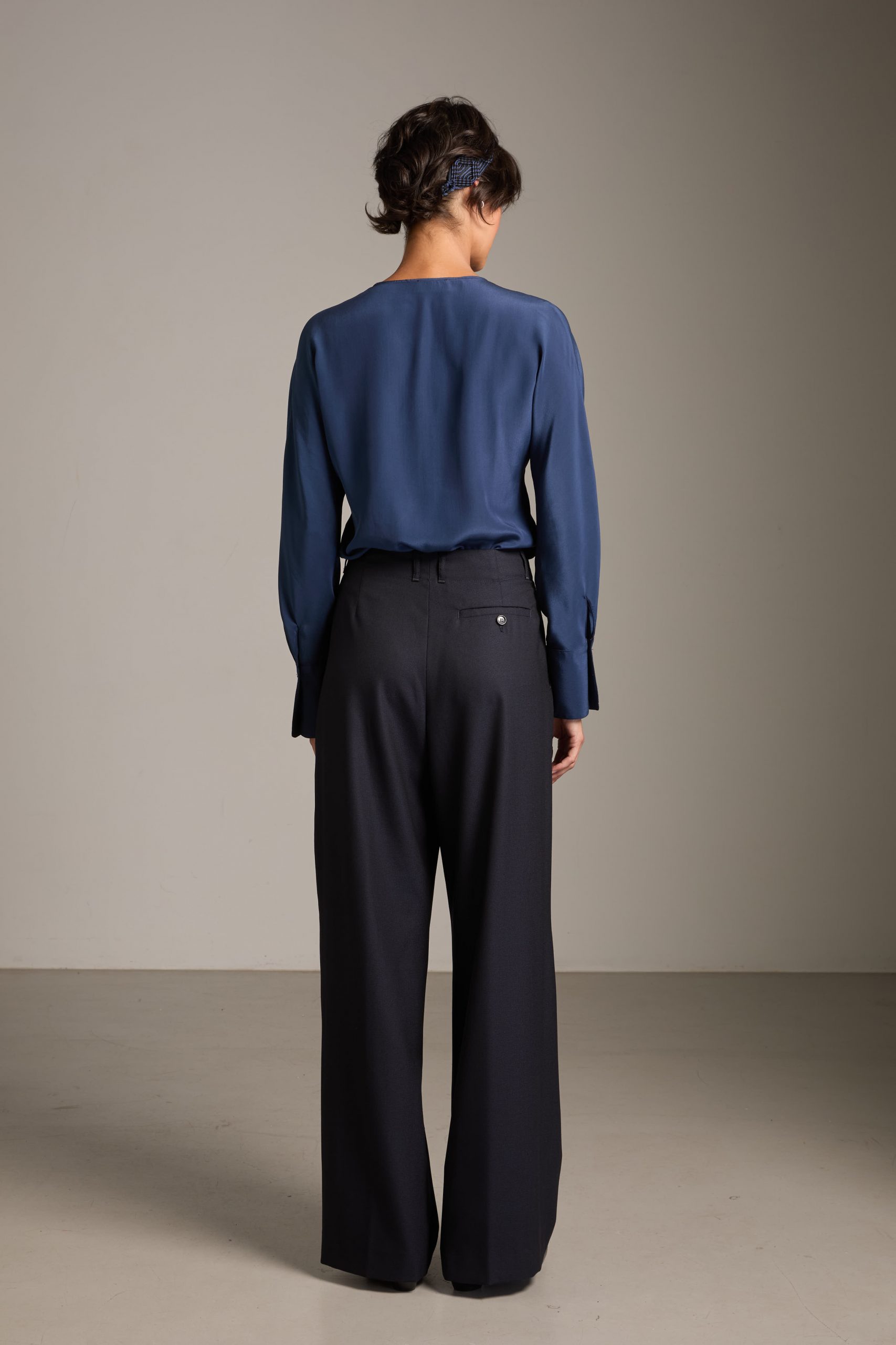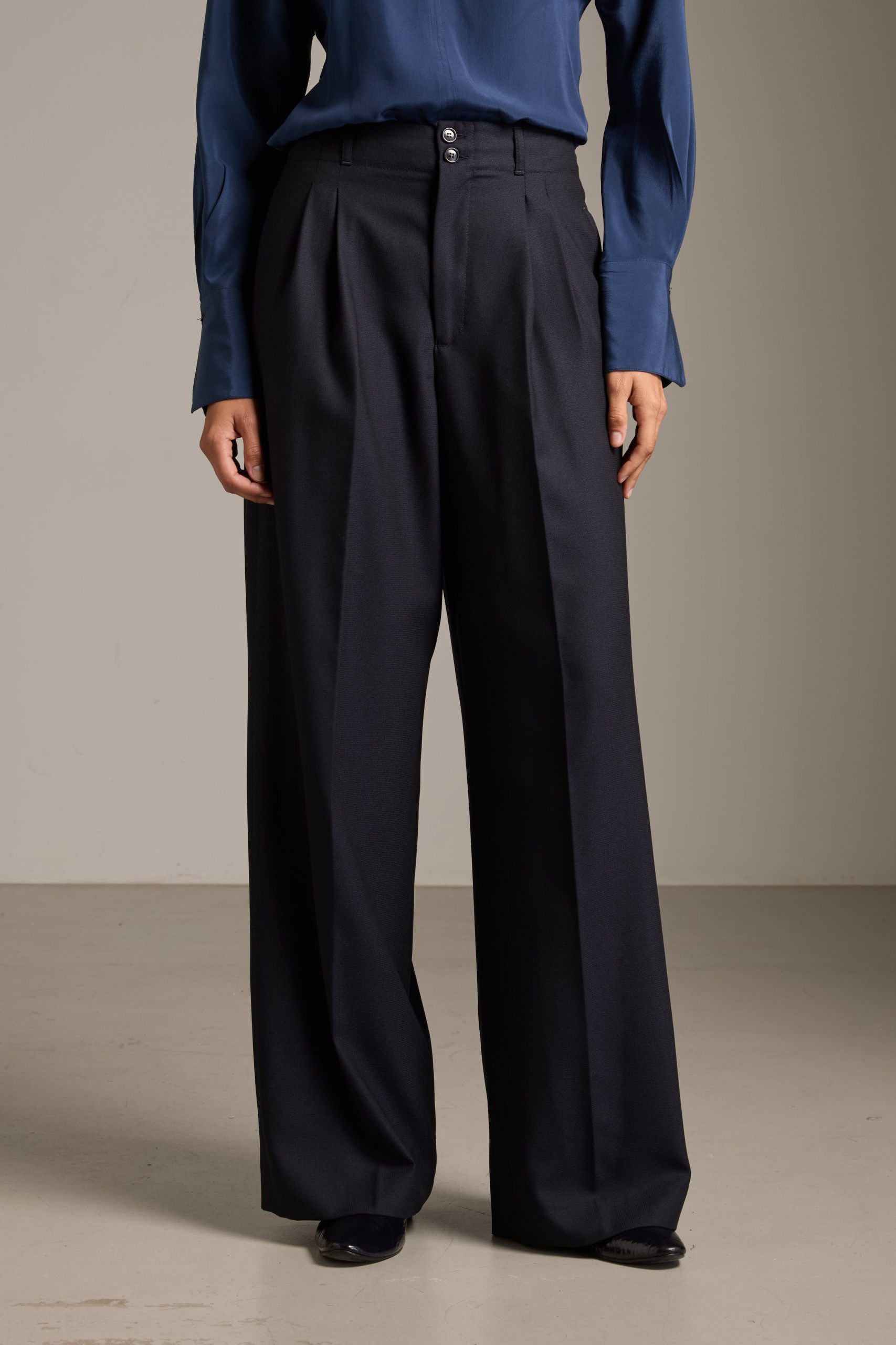 Pantaloni Kate di Carla Saibene increpe di lana leggera nera e blu, dal taglio maschile e ampio, con doppia pince, tasche sul fianco e chiusi da doppio bottone effetto corno.