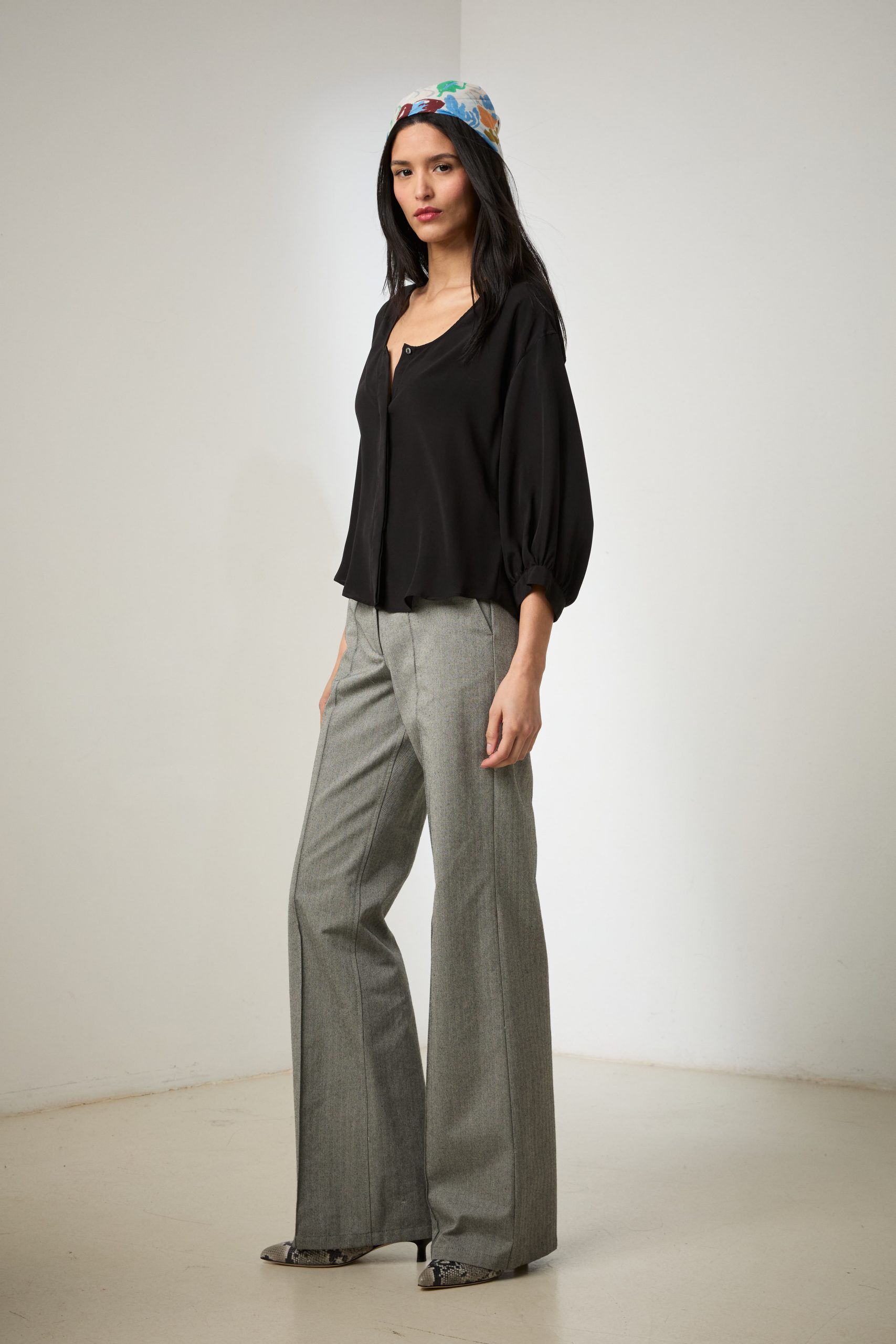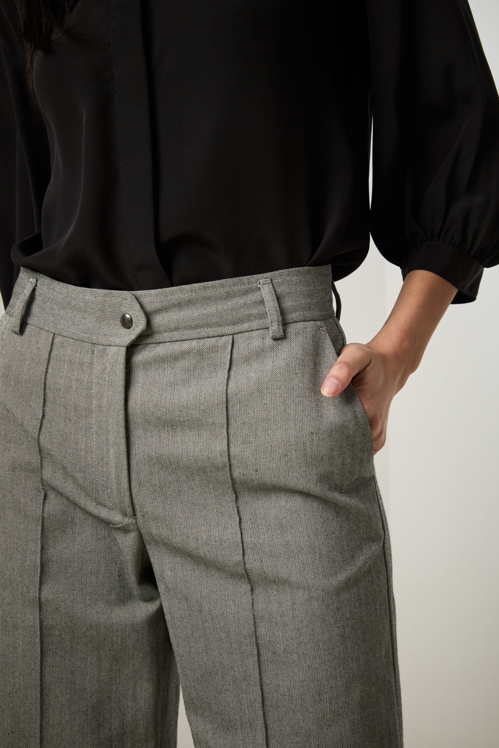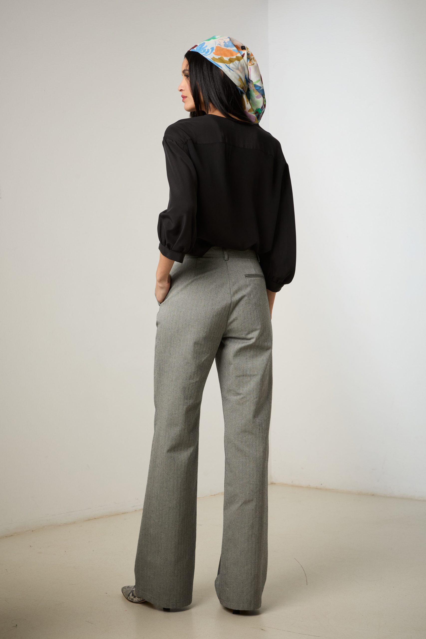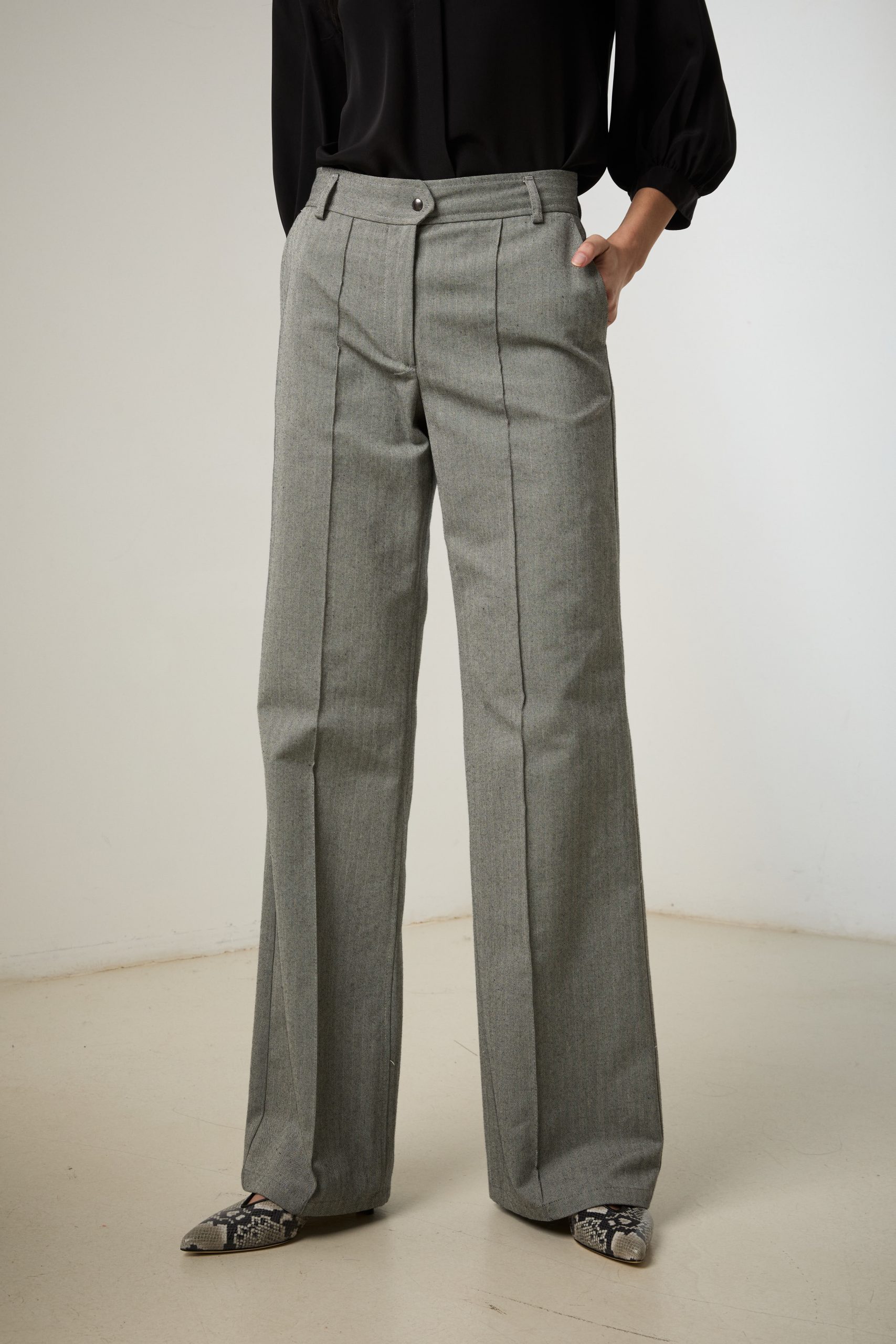 Pantaloni Alina di Carla Saibene, in cotone spigato grigio, sagomati su vita e fianchi, con impuntura sulla gamba, leggermente svasati sul fondo con silhouette anni ‘70.
