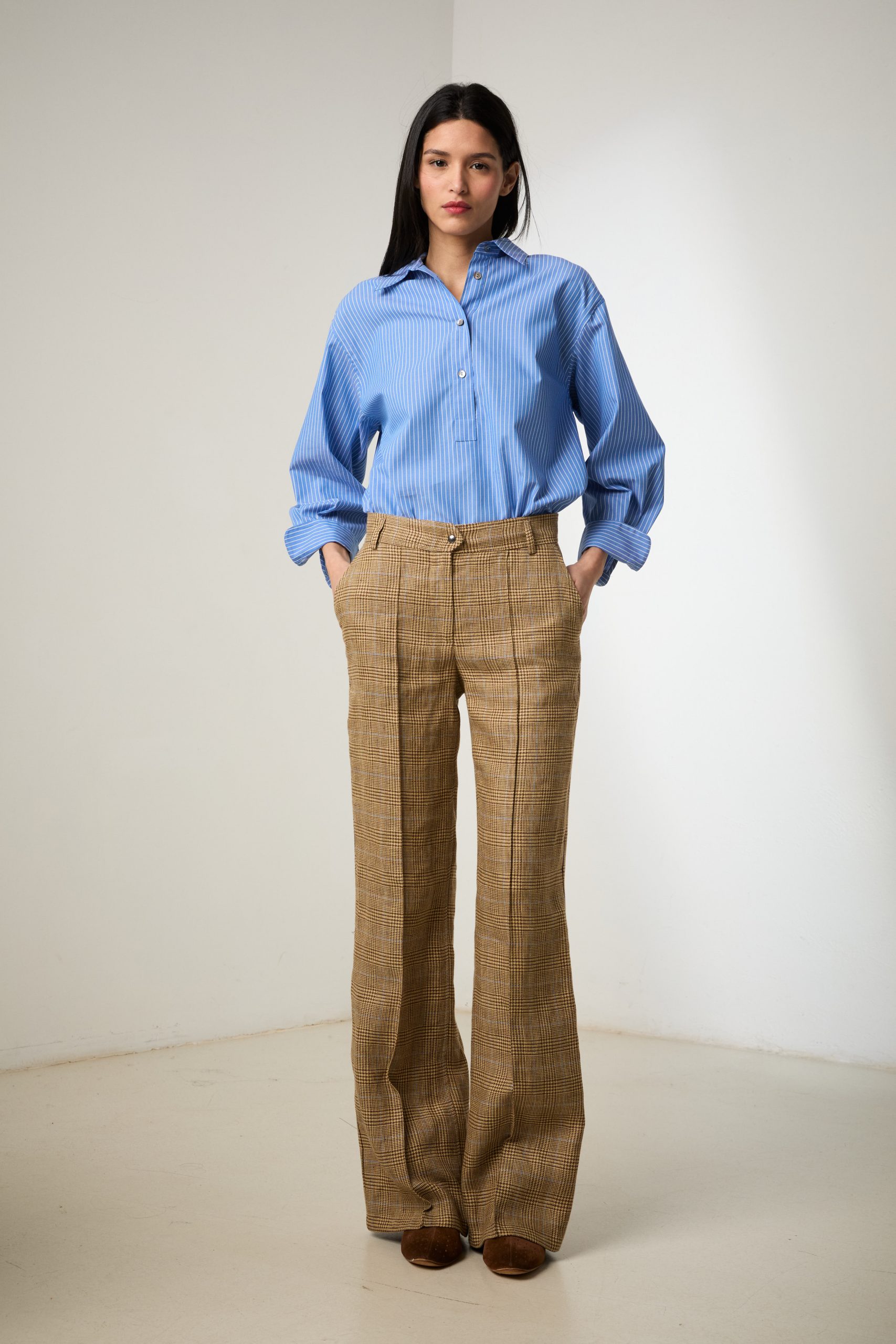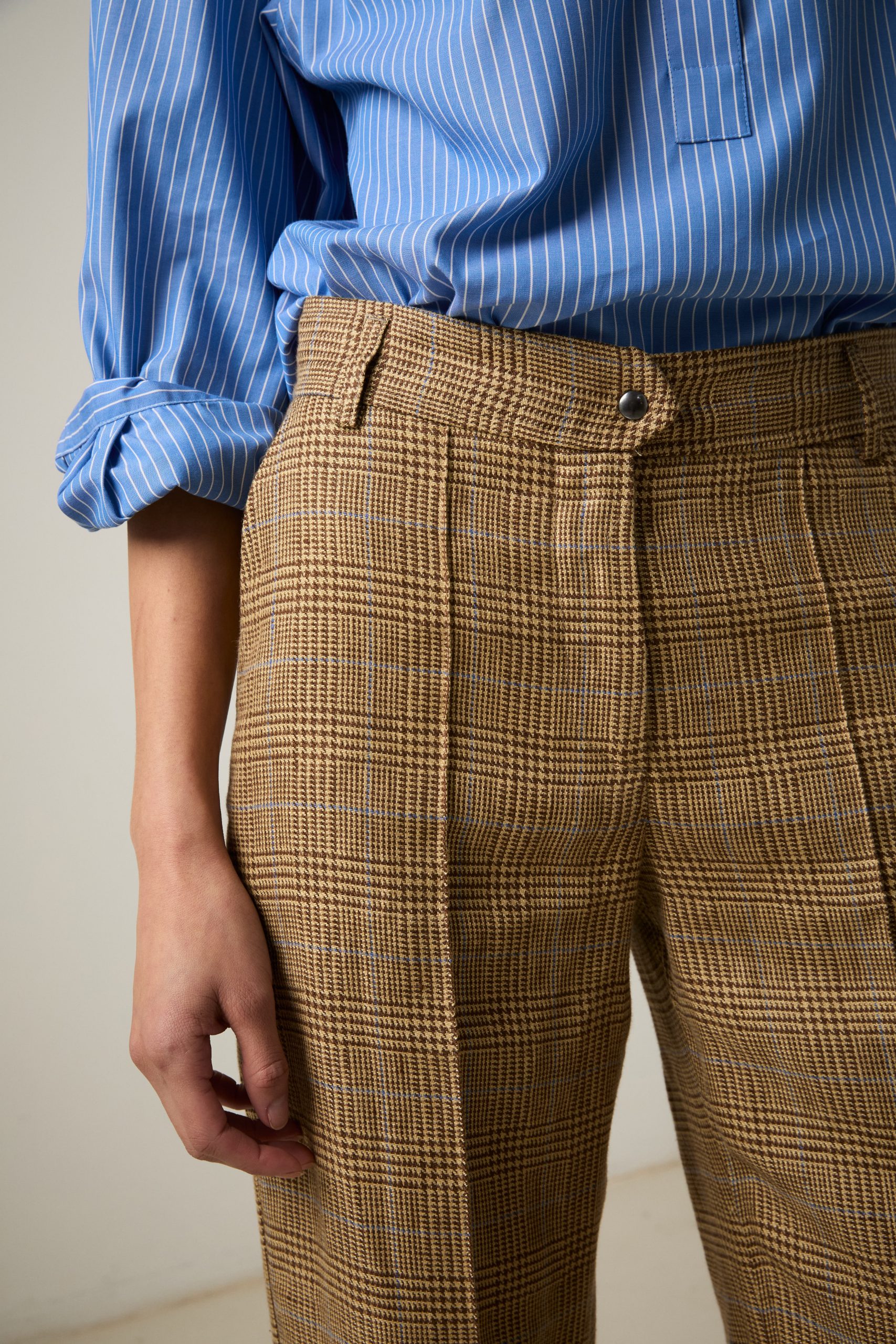 Pantaloni Alina di Carla Saibene, in lino beige principe di Galles con riga azzurra, sagomati su vita e fianchi,  con  impuntura sulla gamba, leggermente svasati sul fondo con silhouette anni ‘70.