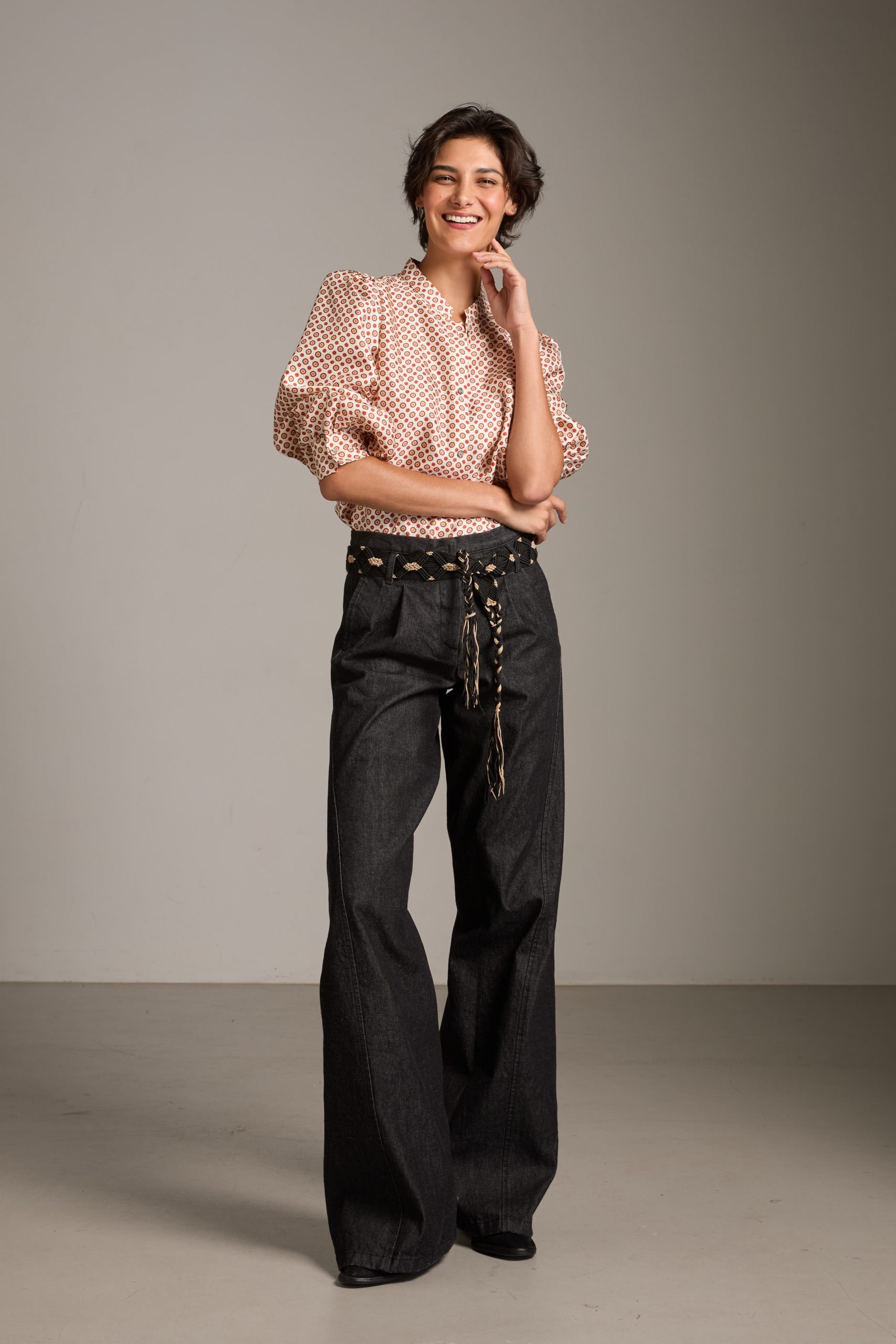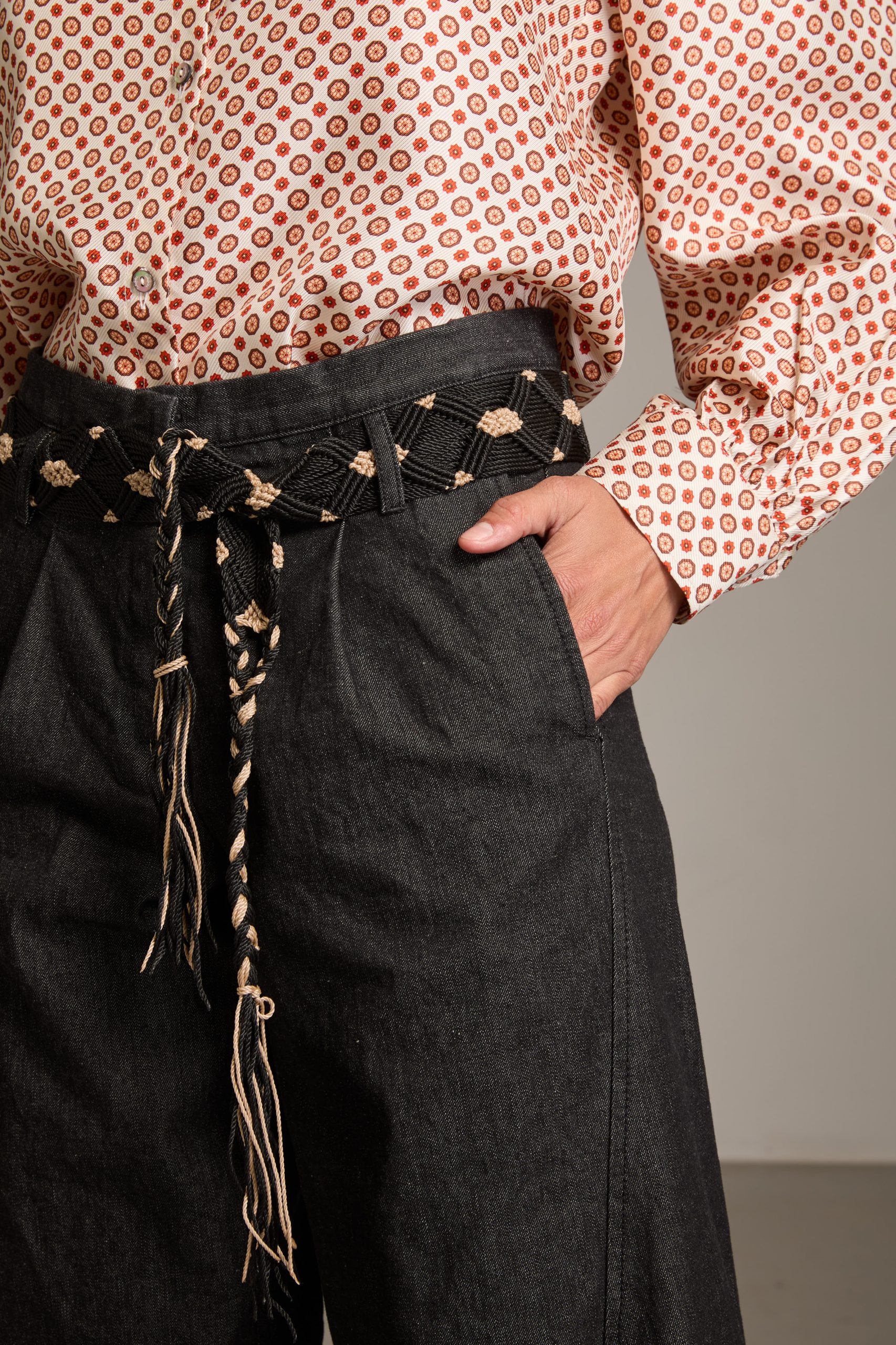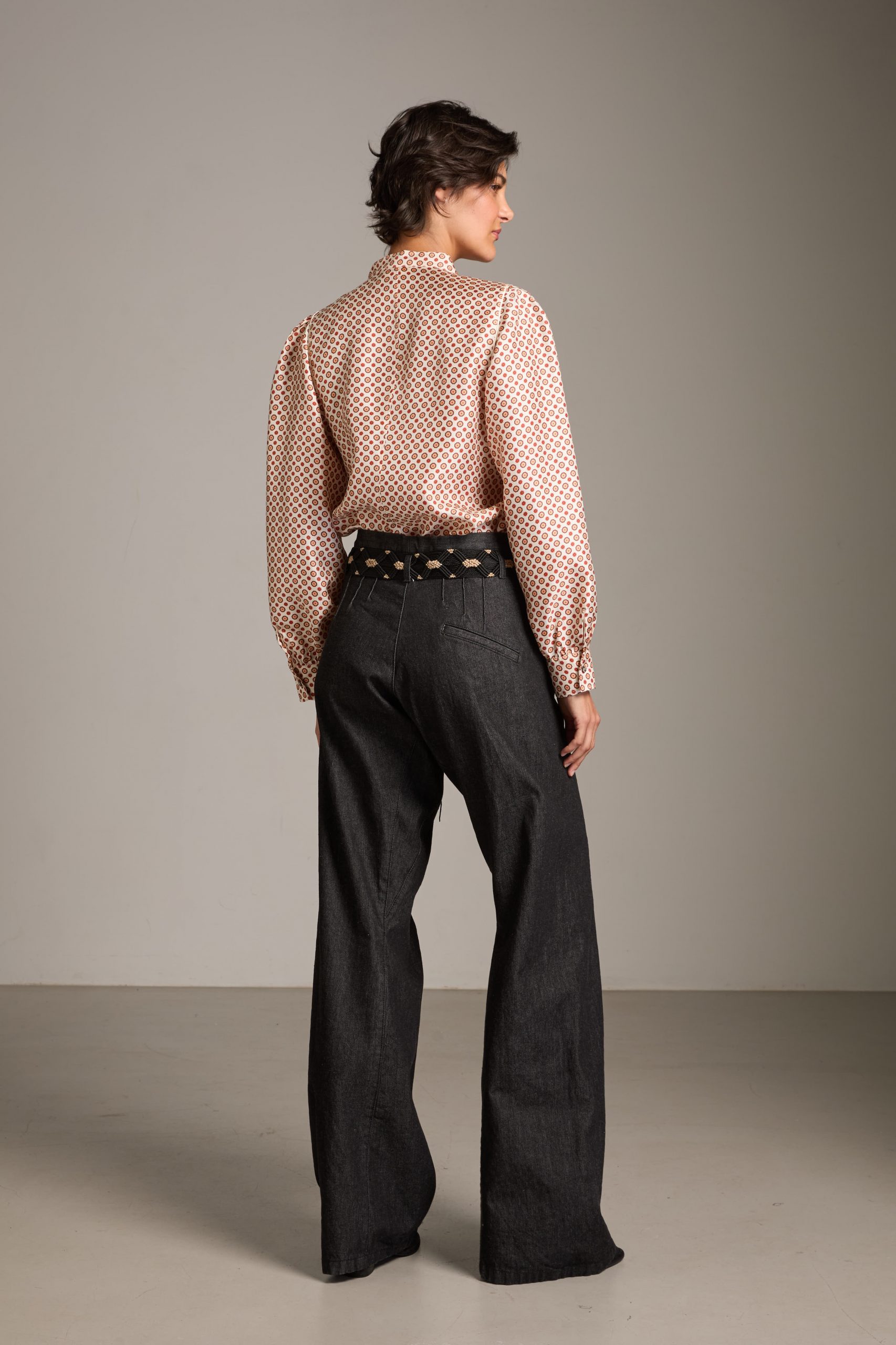 L’inconfondibile taglio un po’ maschile, ma super femminile, è estremamente donante; le micro pinces sul davanti, le piccole nervature sul dietro modellano i fianchi e il sedere, le cuciture diagonali danno un movimento fluido alla gamba che si allarga sul fondo e slancia la silhouette.