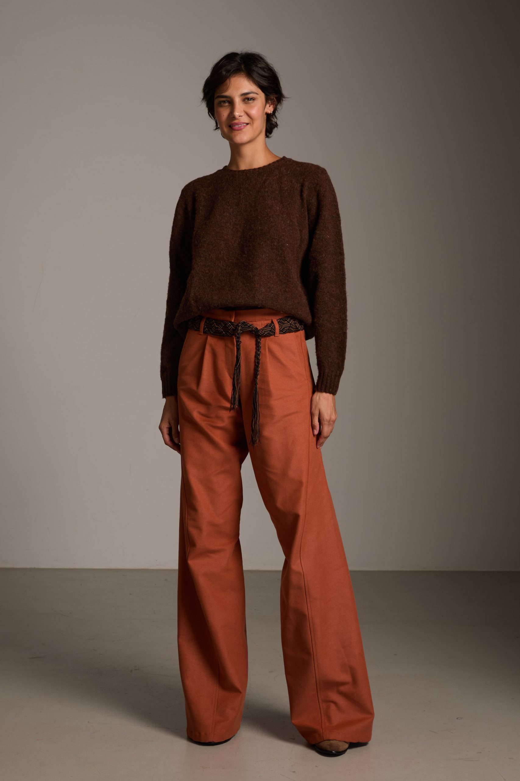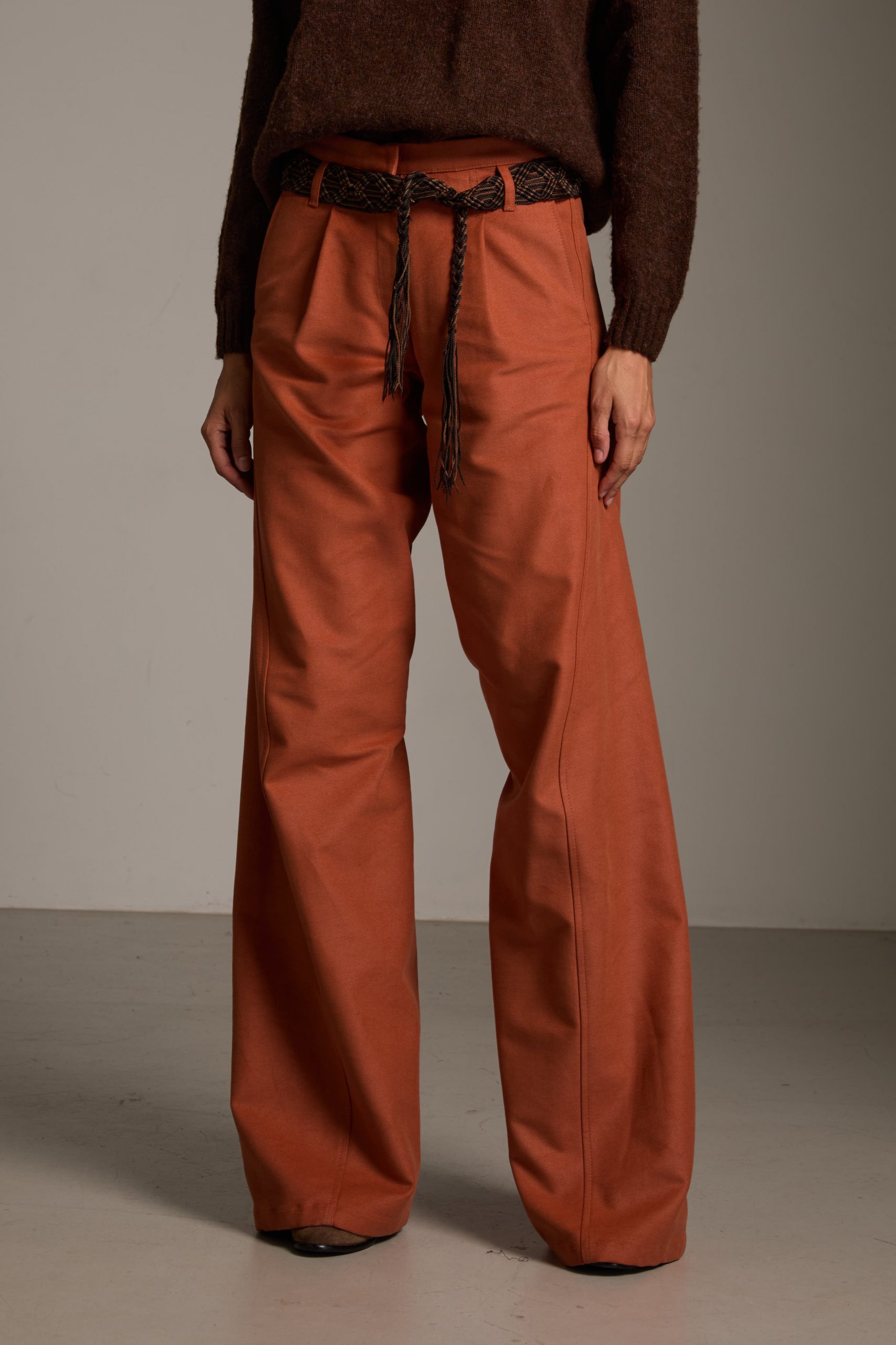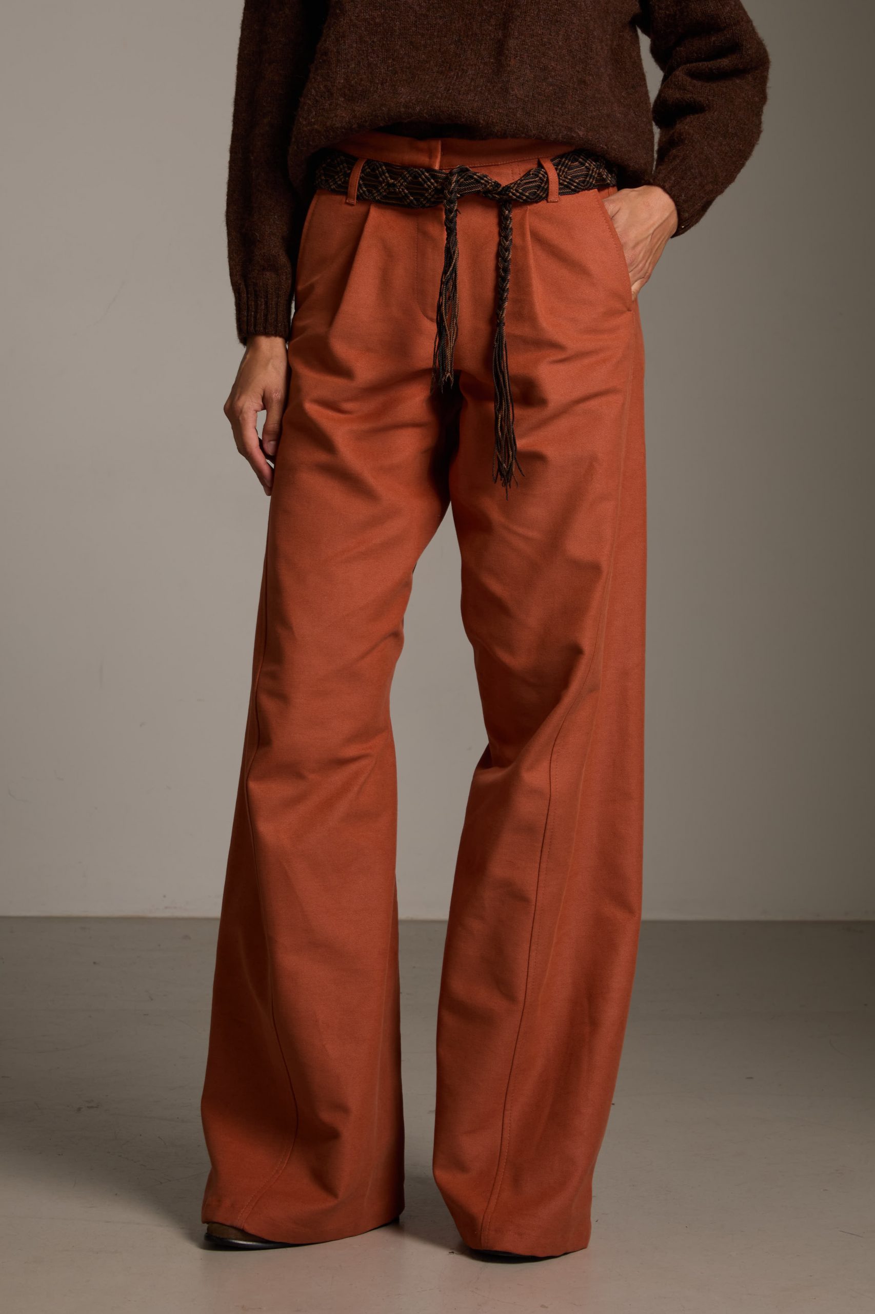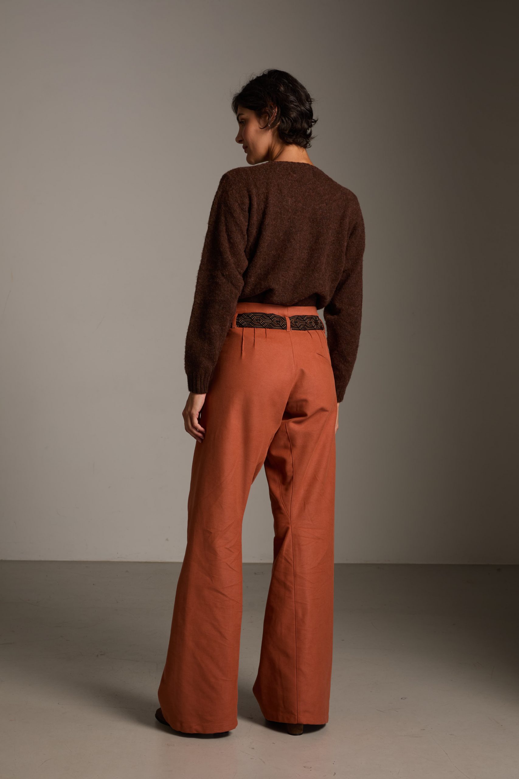 L’inconfondibile taglio un po’ maschile, ma super femminile, è estremamente donante; le micro pinces sul davanti, le piccole nervature sul dietro modellano i fianchi e il sedere, le cuciture diagonali danno un movimento fluido alla gamba che si allarga sul fondo e slancia la silhouette.