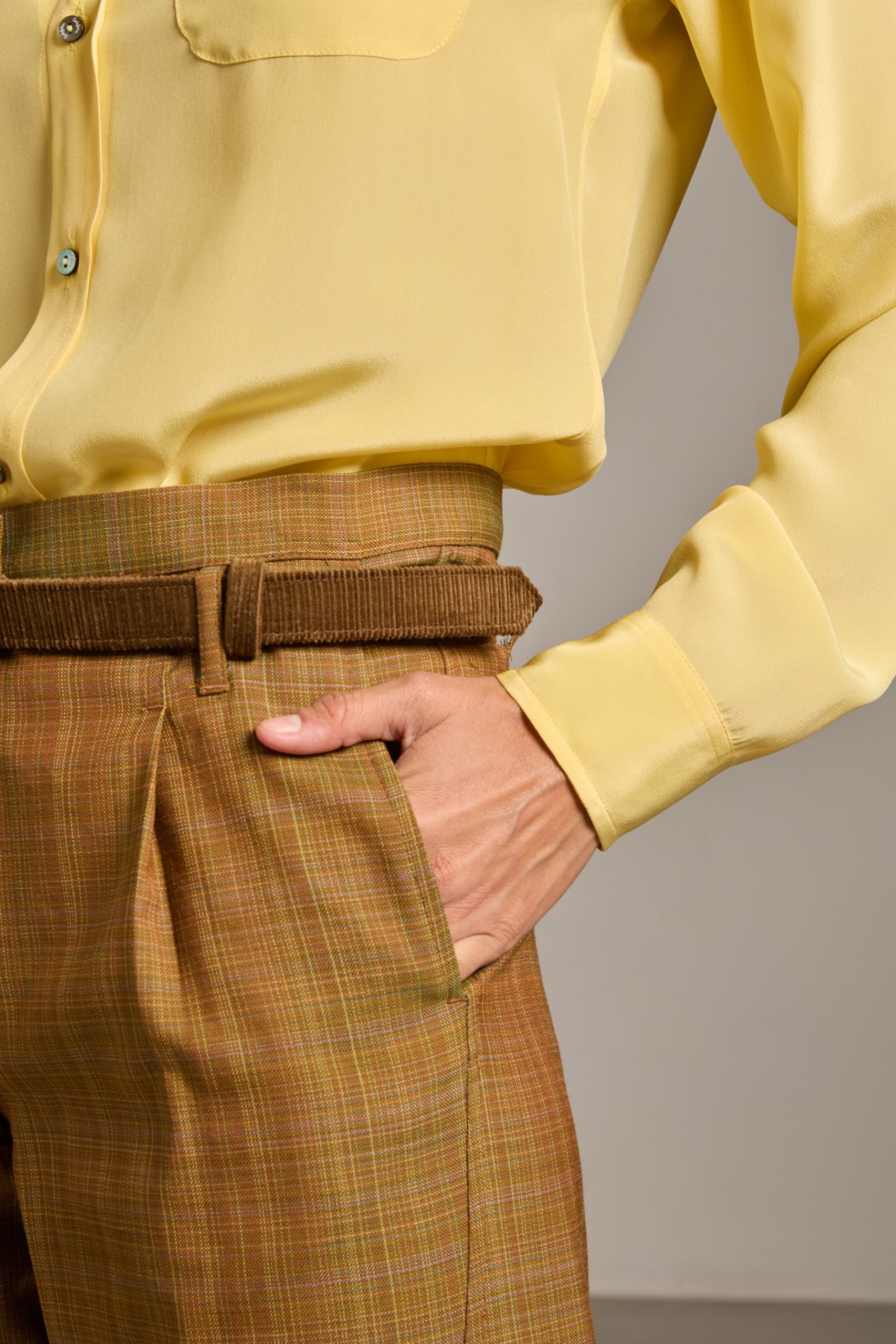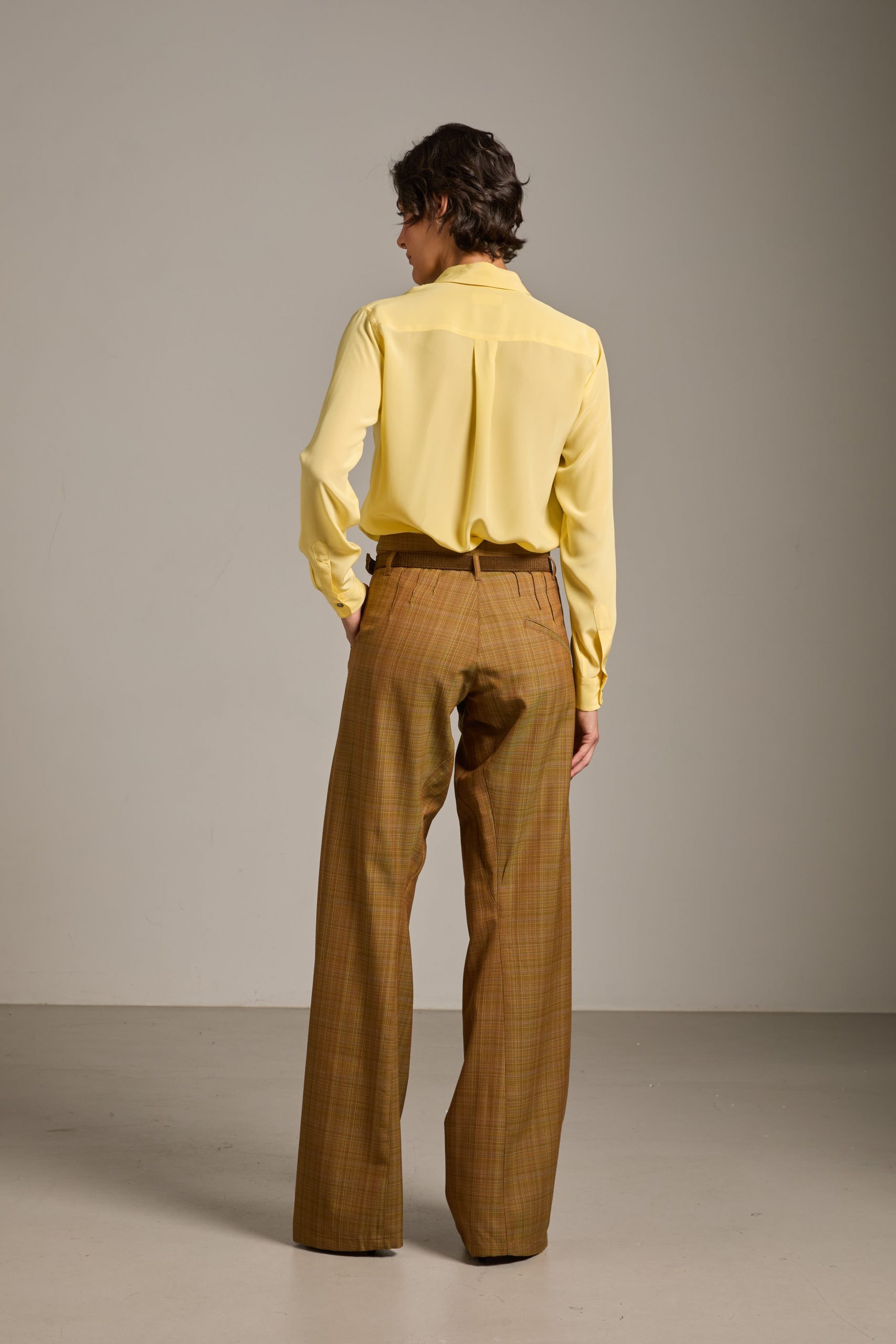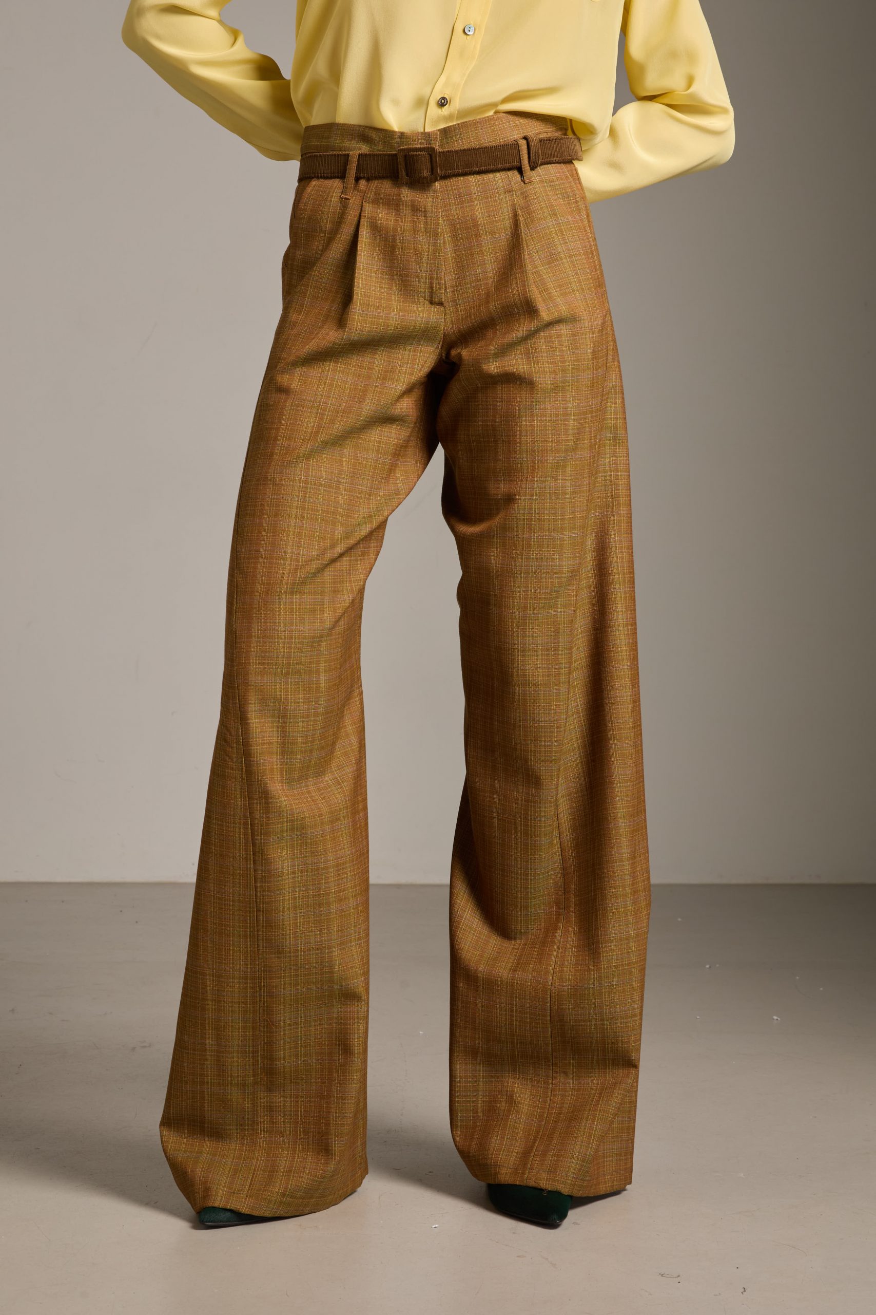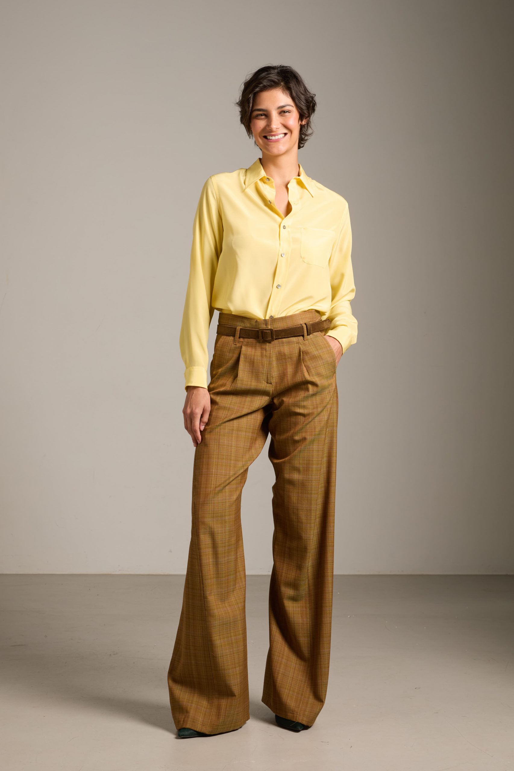 Pantaloni Carla di Carla Saibene, il nostro modello iconico dall’irresistibile aria effortlessly chic, in fresco lana verde e ocra cangiante.