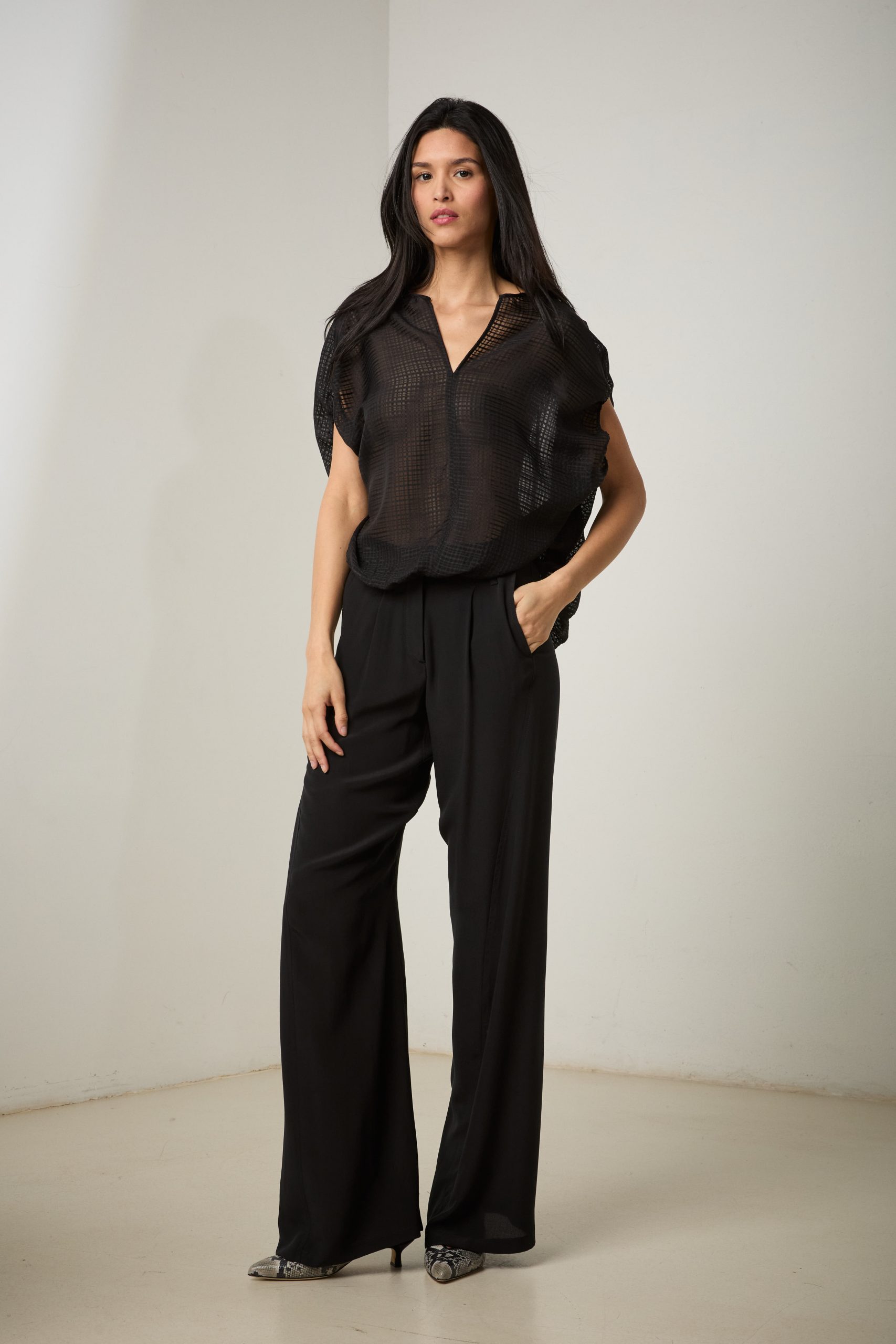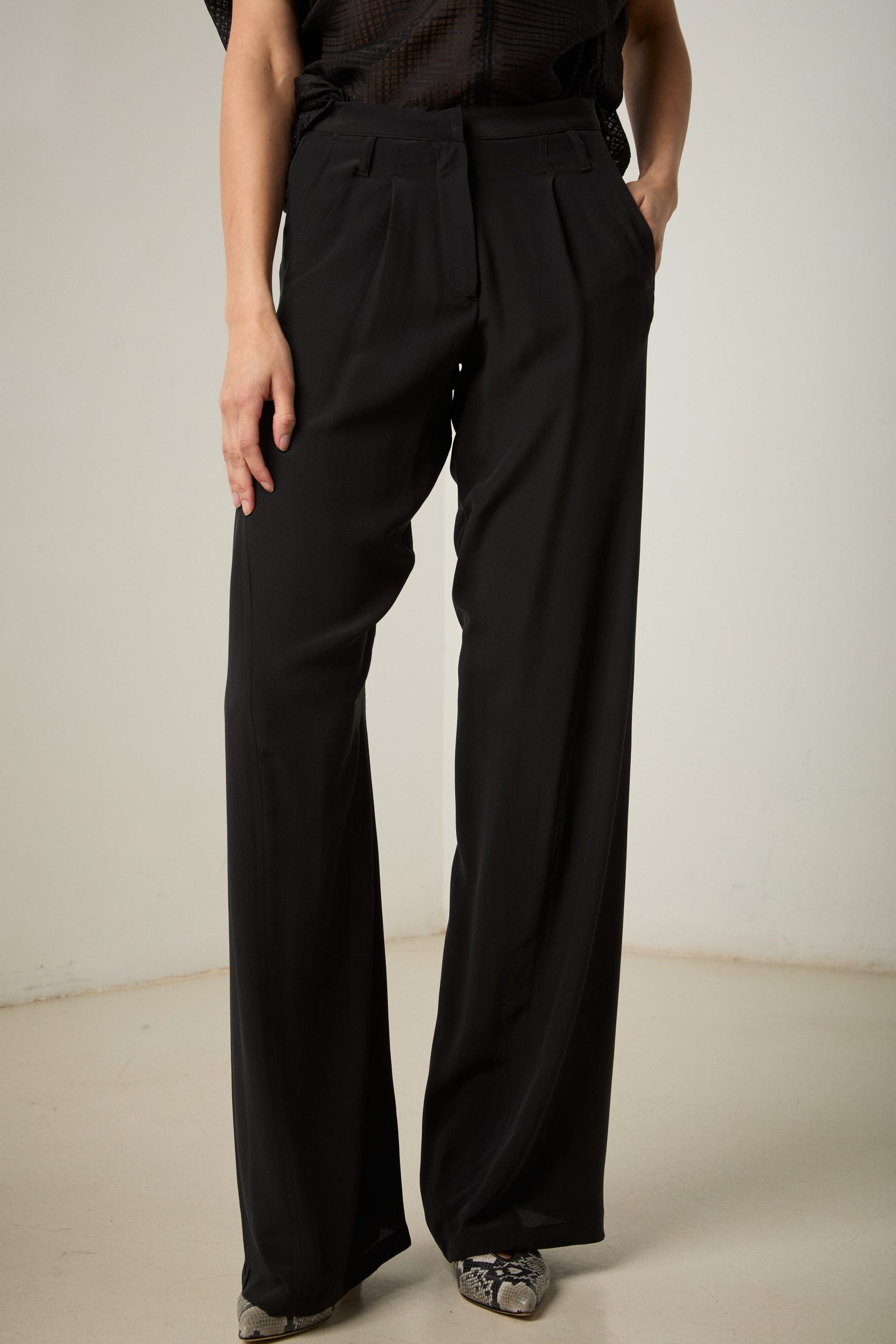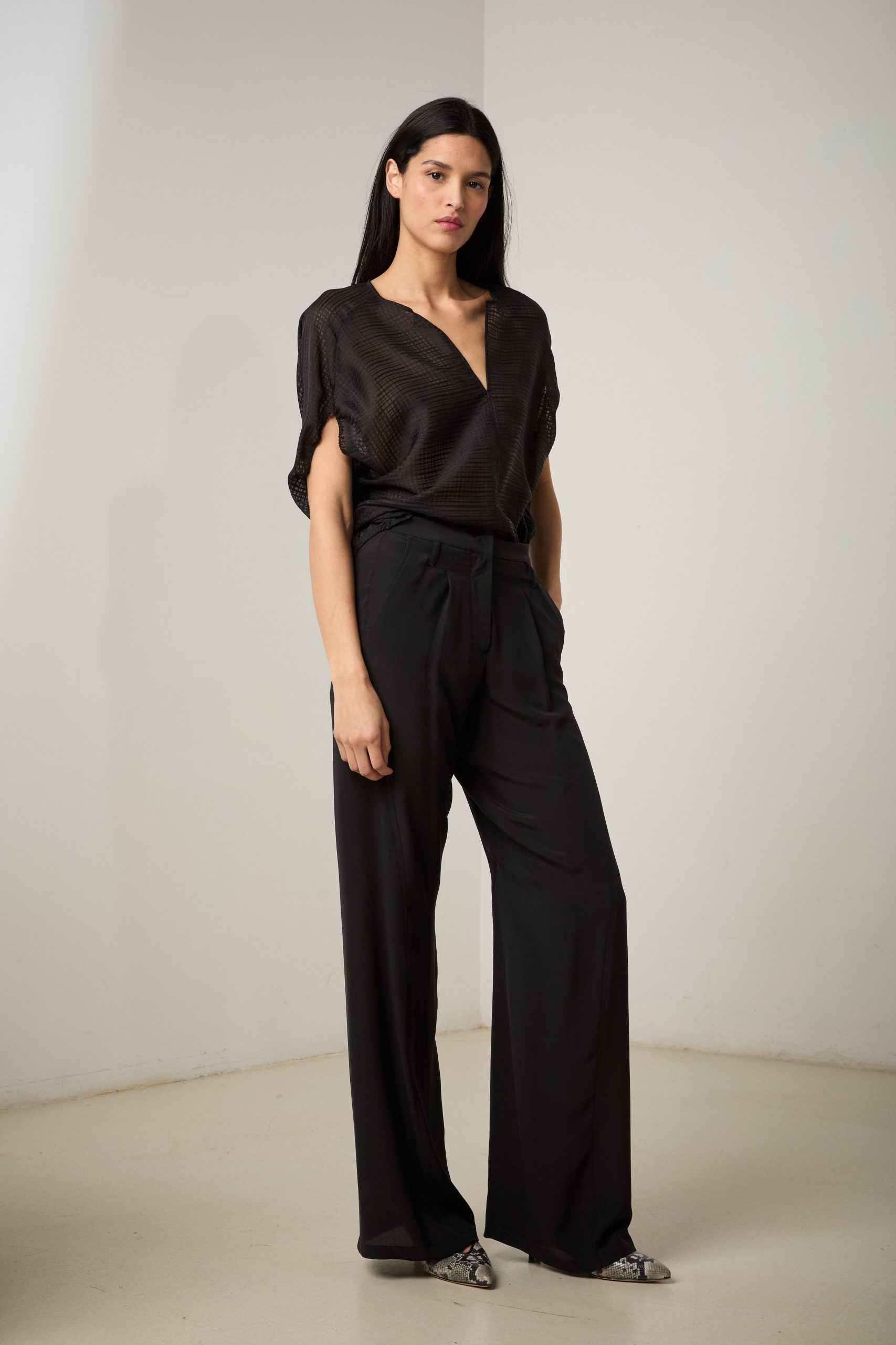 Pantaloni Carla di Carla Saibene, il nostro modello iconico dall’irresistibile aria effortlessly chic, in seta nera crepe de chine