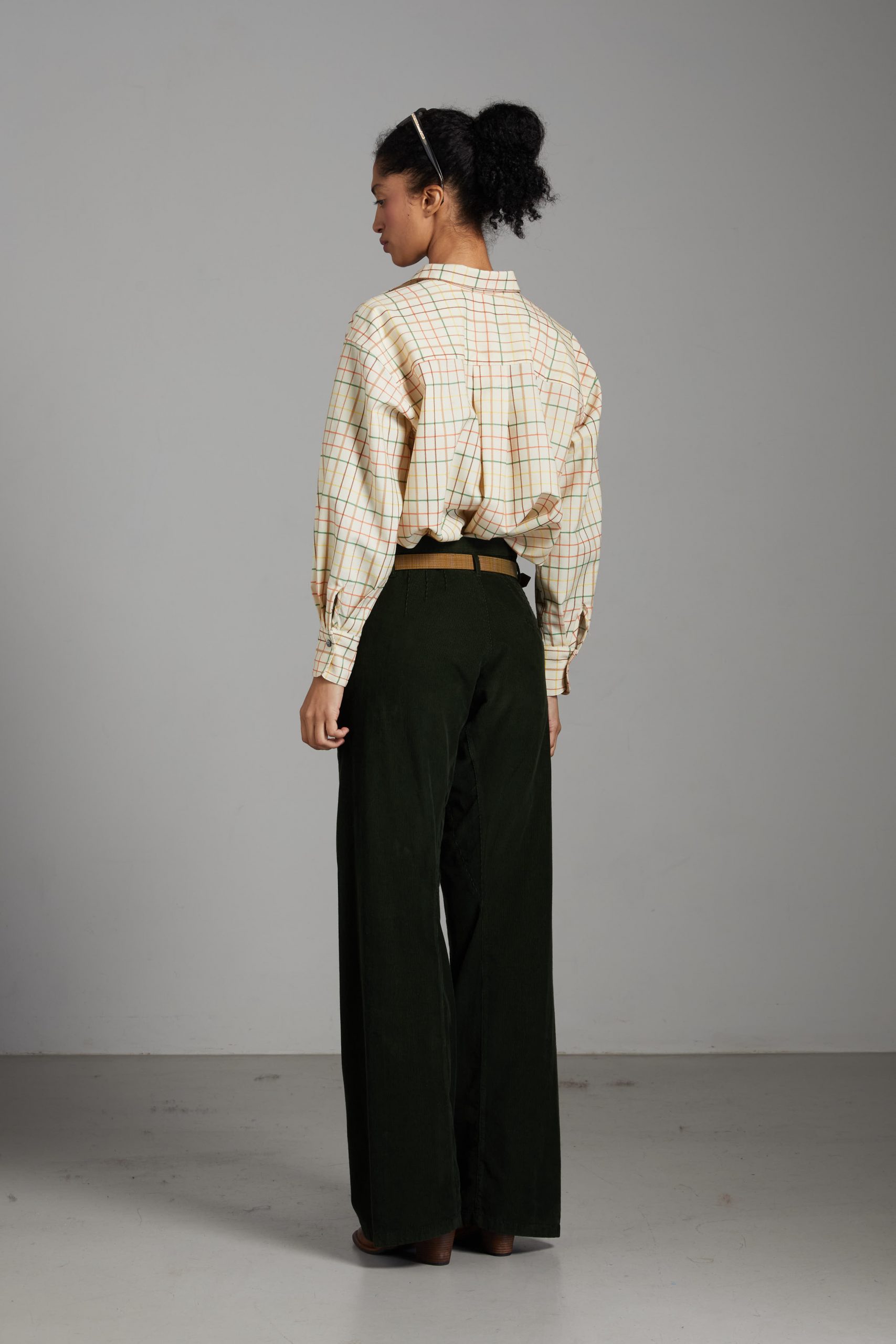 L’inconfondibile taglio un po’ maschile, ma super femminile, è estremamente donante; le micro pinces sul davanti, le piccole nervature sul dietro modellano i fianchi e il sedere, le cuciture diagonali danno un movimento fluido alla gamba che si allarga sul fondo e slancia la silhouette.