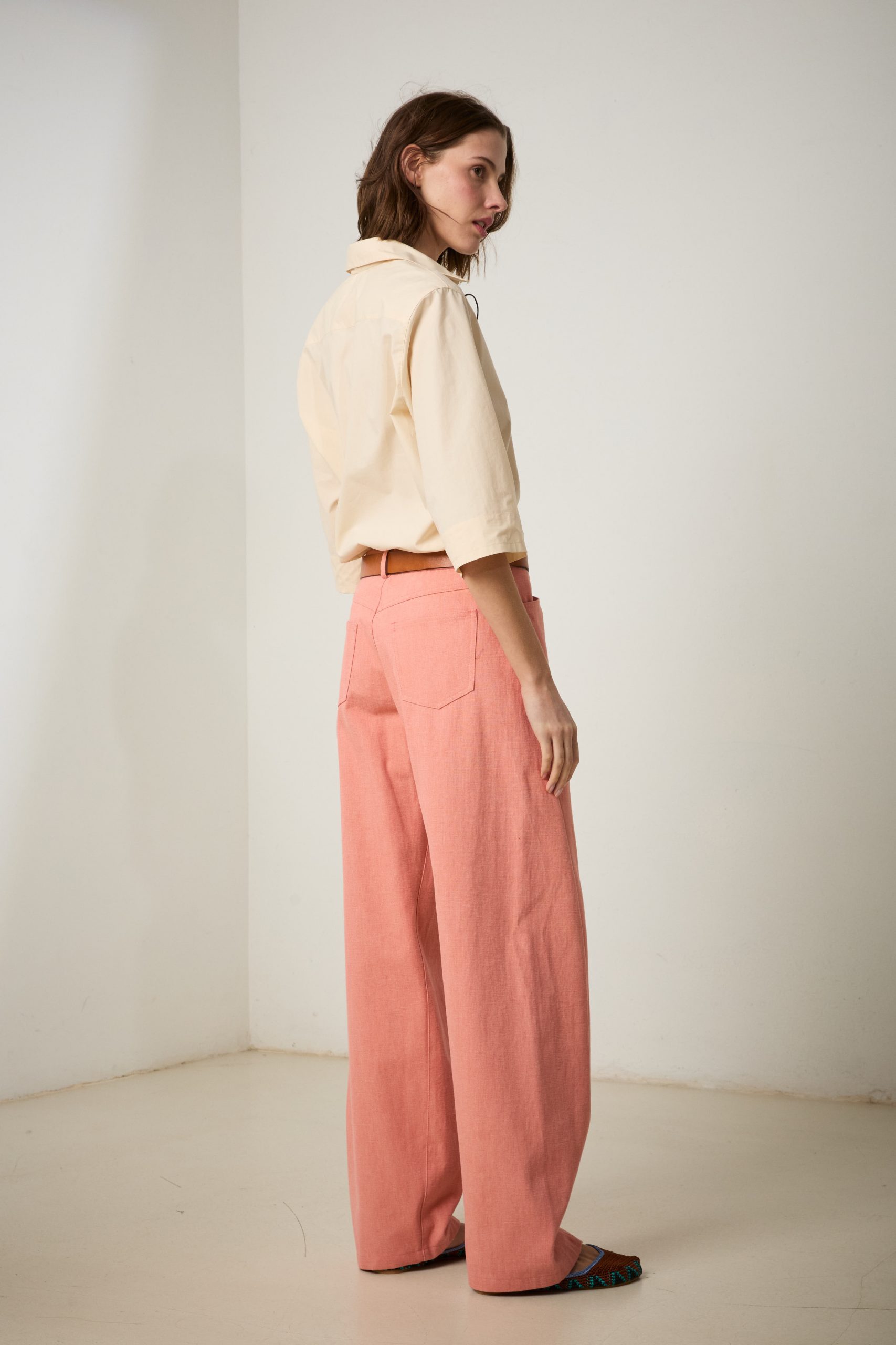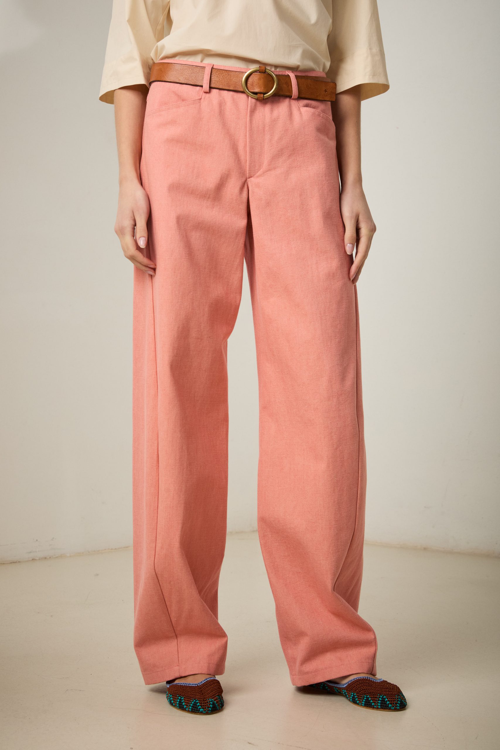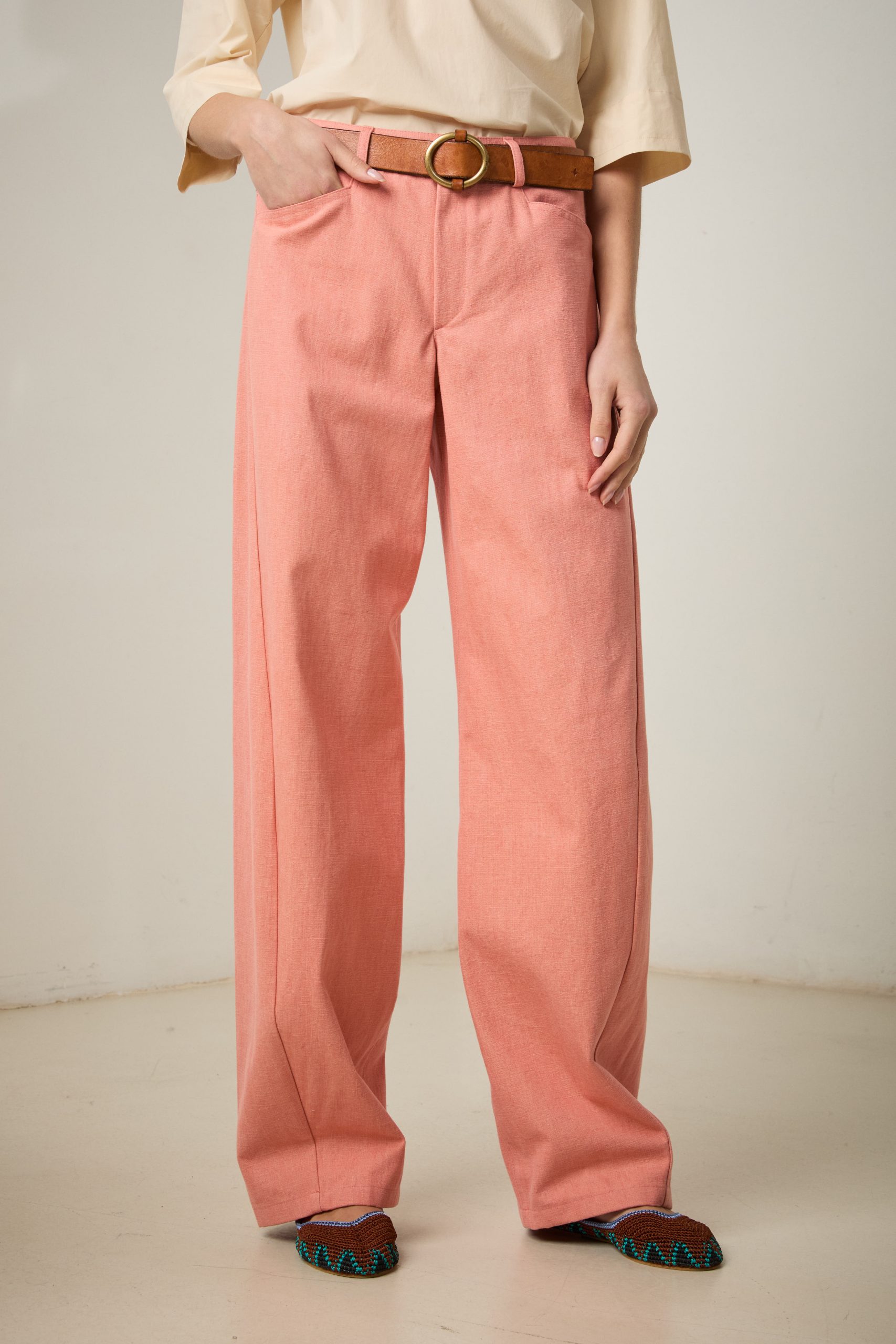 Pantaloni Carole di Carla Saibene in canvas di cotone rosa salmone, un nuovo modello con vestibilità loose, dalla gamba ampia che si restringe al fondo, con il classico inclinato sulla gamba che slancia la silhouette