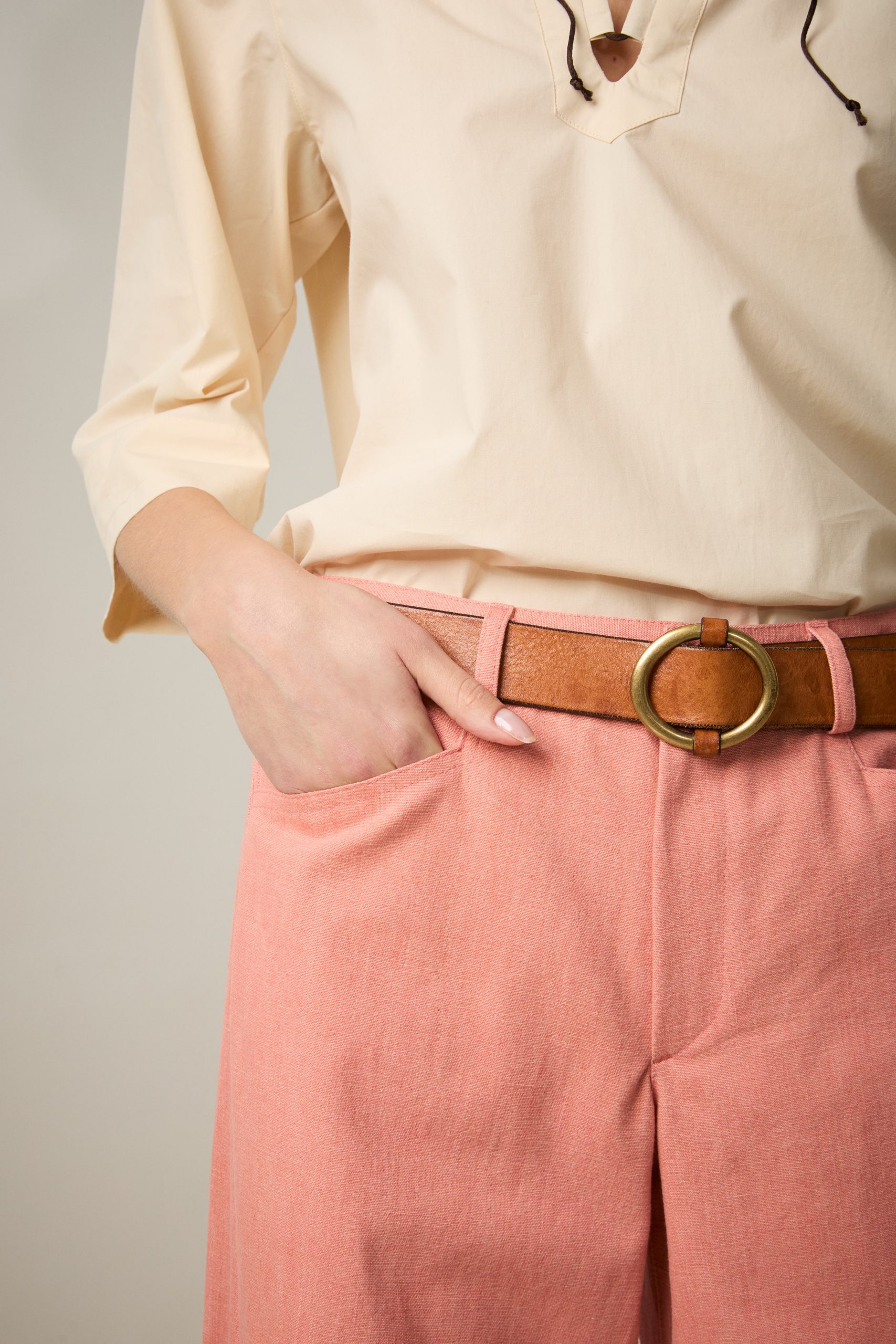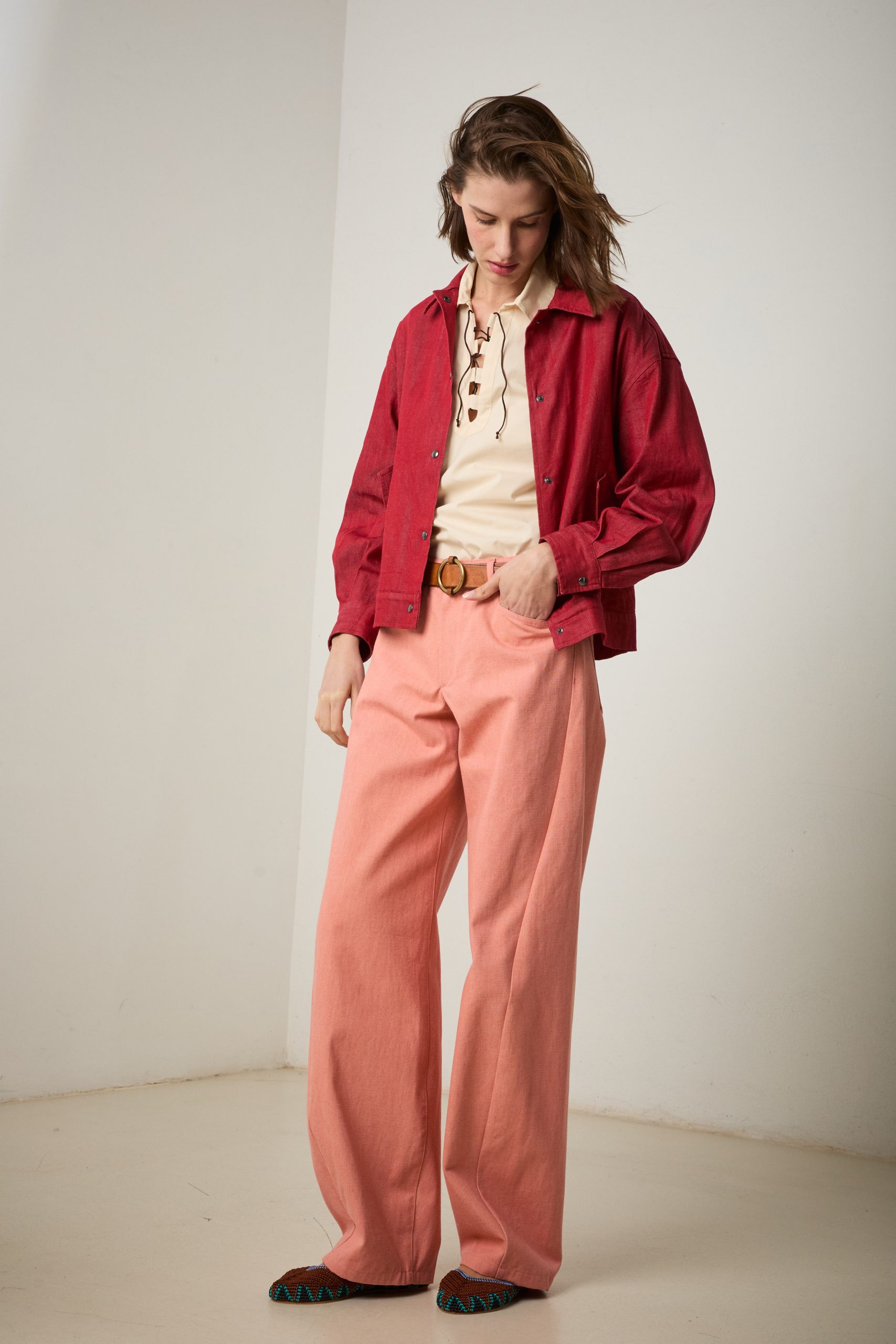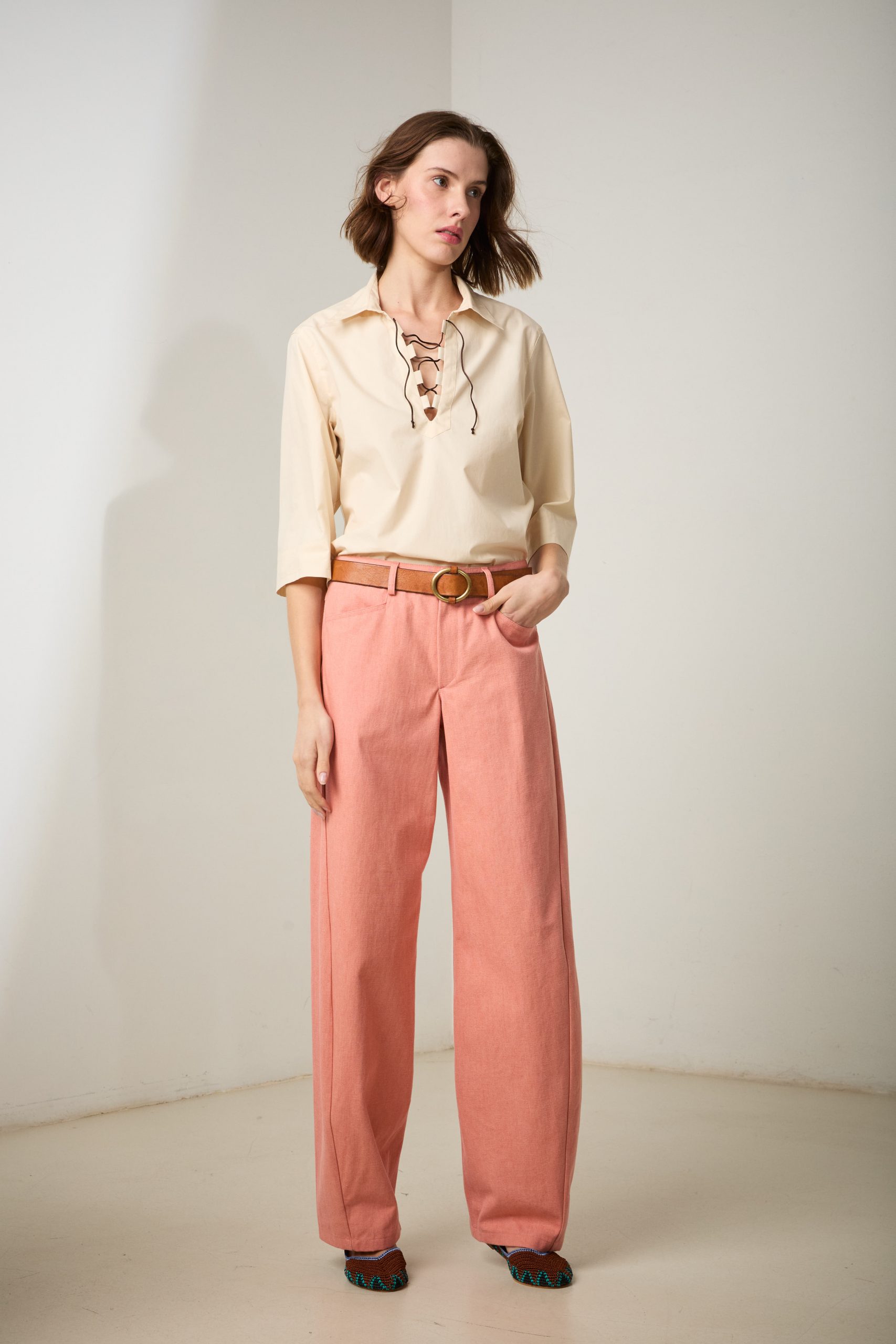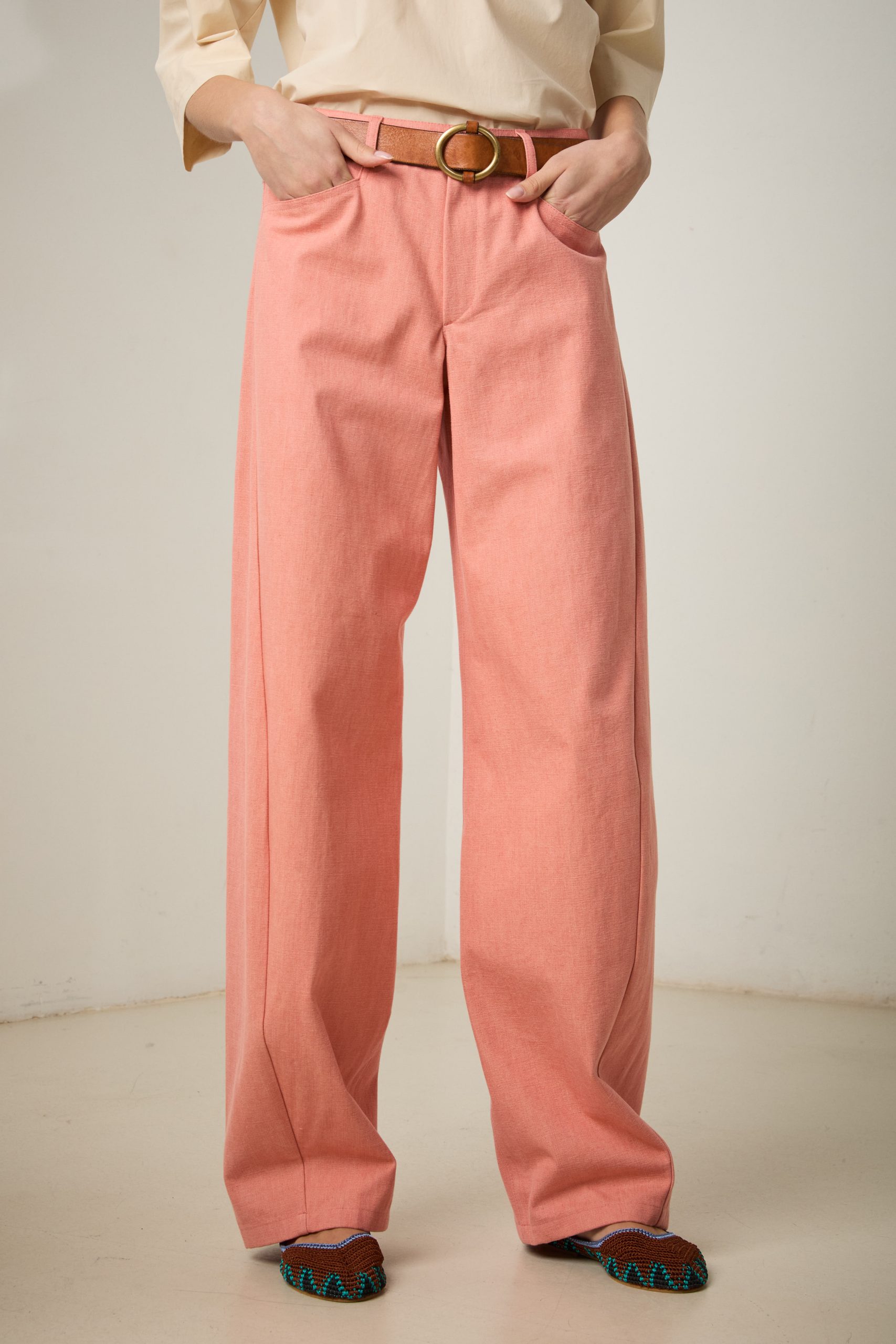 Pantaloni Carole di Carla Saibene in canvas di cotone rosa salmone, un nuovo modello con vestibilità loose, dalla gamba ampia che si restringe al fondo, con il classico inclinato sulla gamba che slancia la silhouette