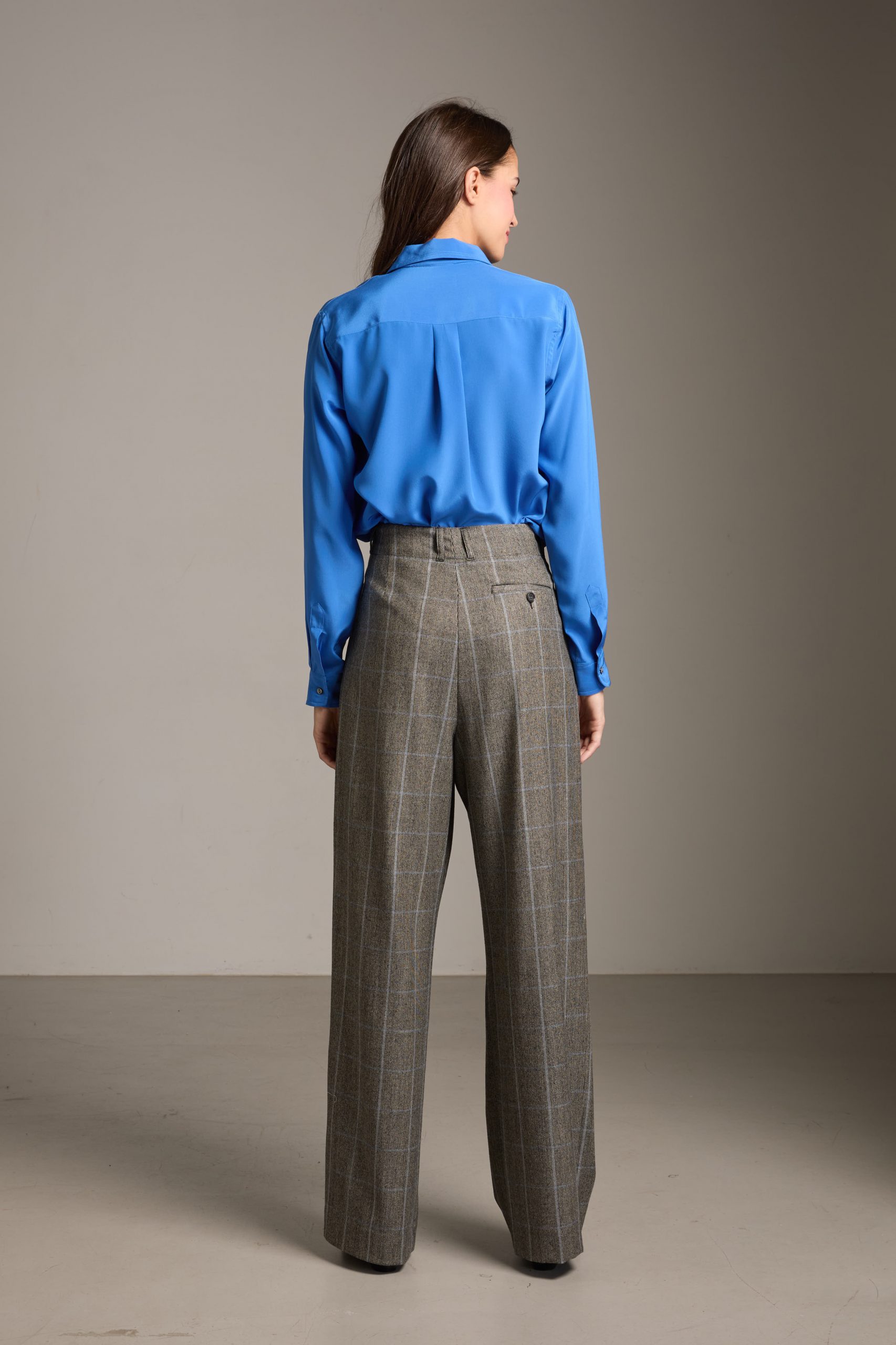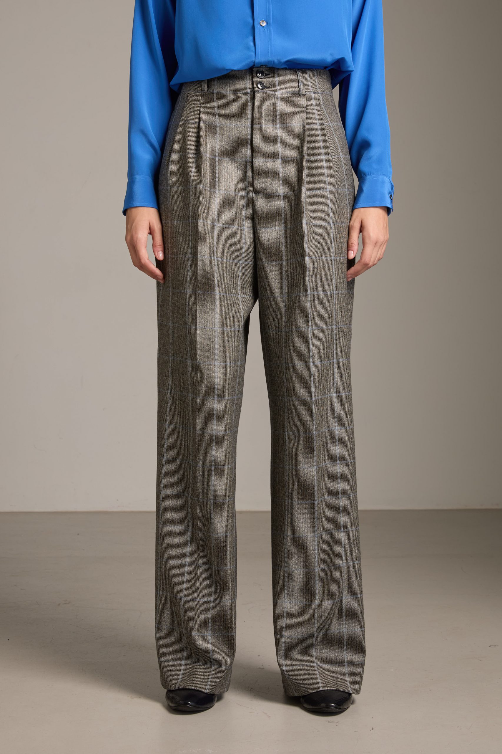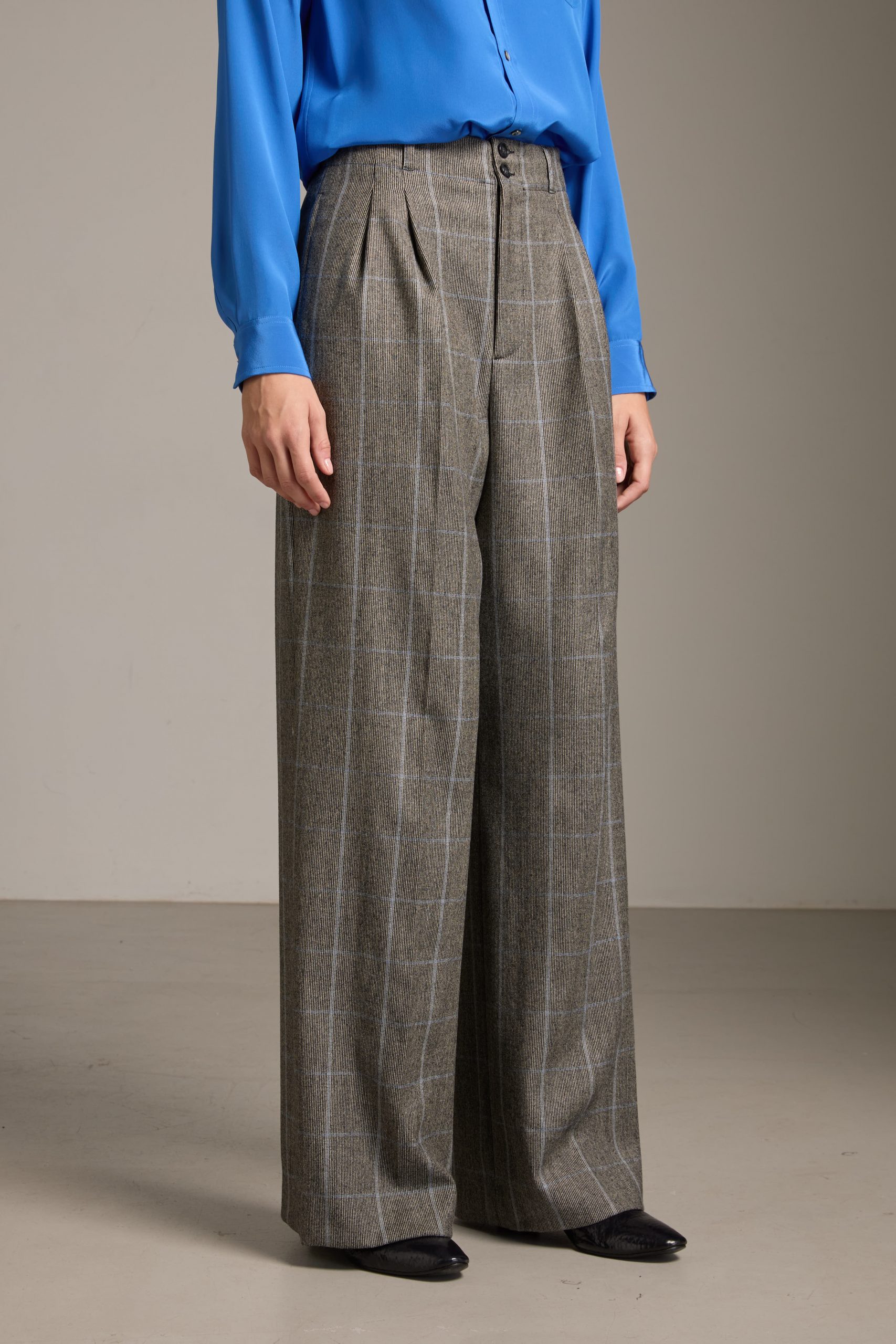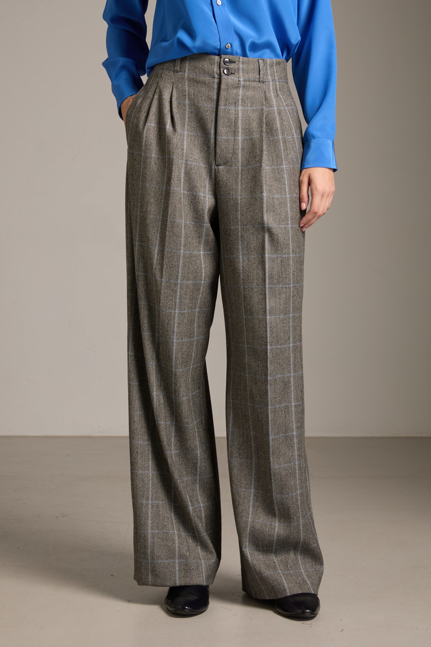 Pantaloni Kate di Carla Saibene in lana bianca e nera a quadri azzurri, dal taglio maschile e ampio, con doppia pince, tasche sul fianco e chiusi da doppio bottone effetto corno.