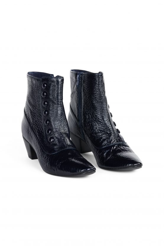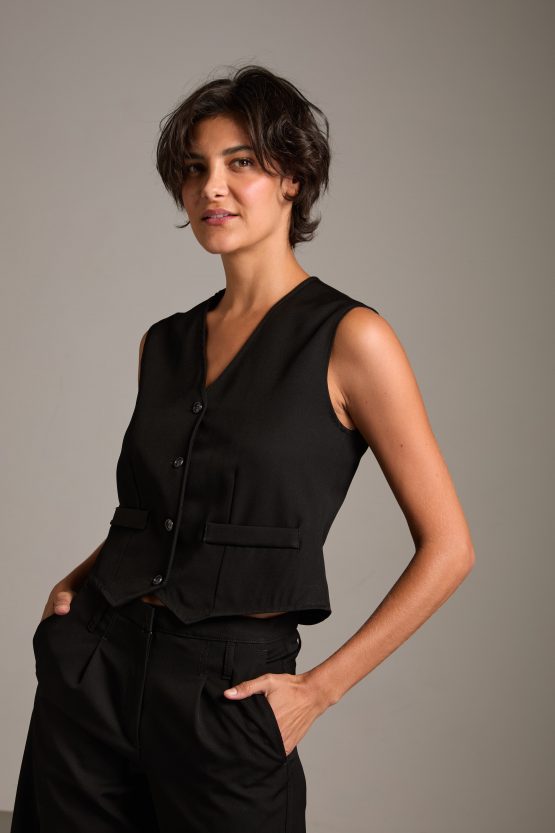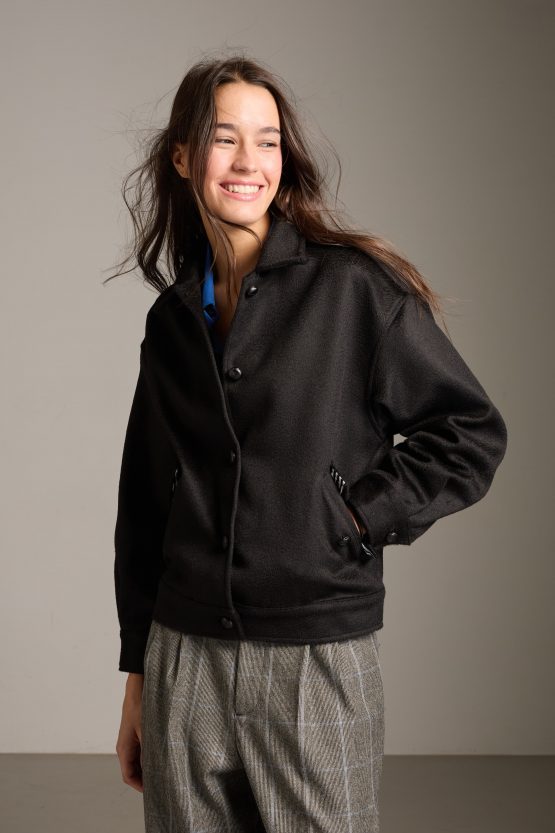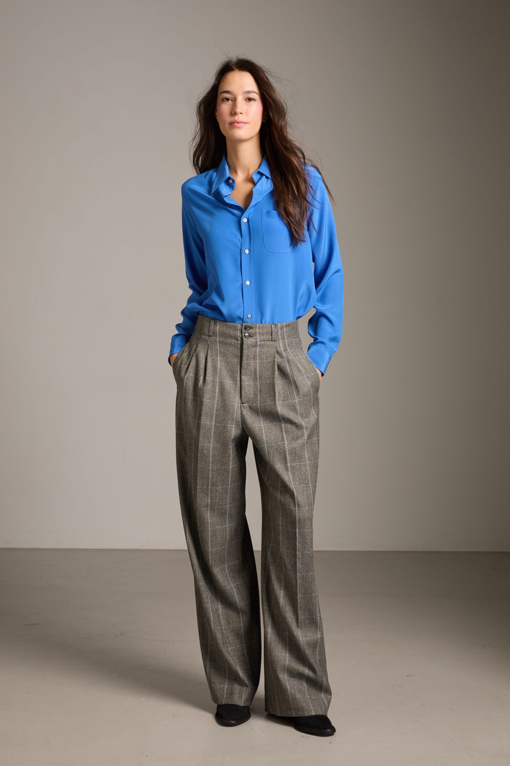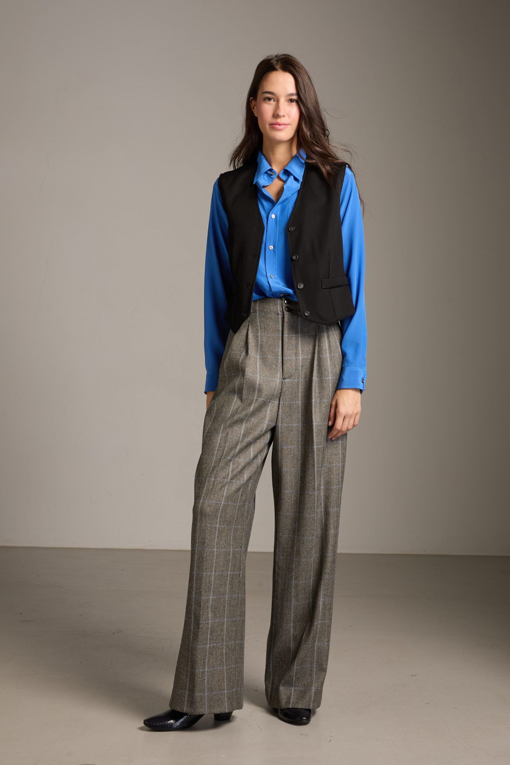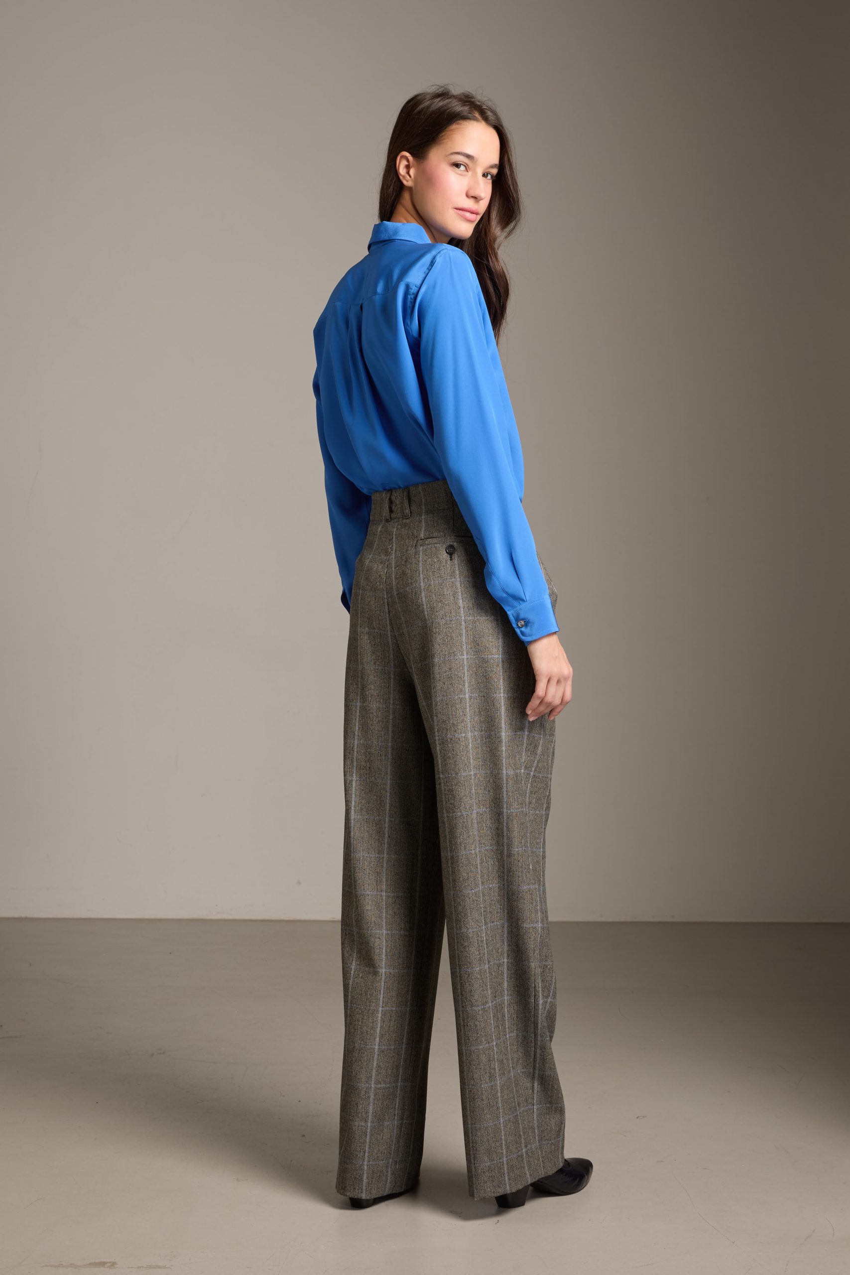 Pantaloni Kate di Carla Saibene in lana bianca e nera a quadri azzurri, dal taglio maschile e ampio, con doppia pince, tasche sul fianco e chiusi da doppio bottone effetto corno.