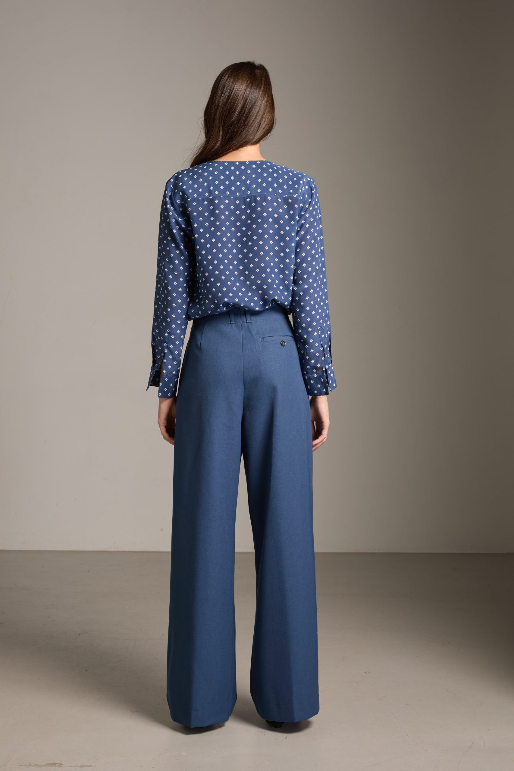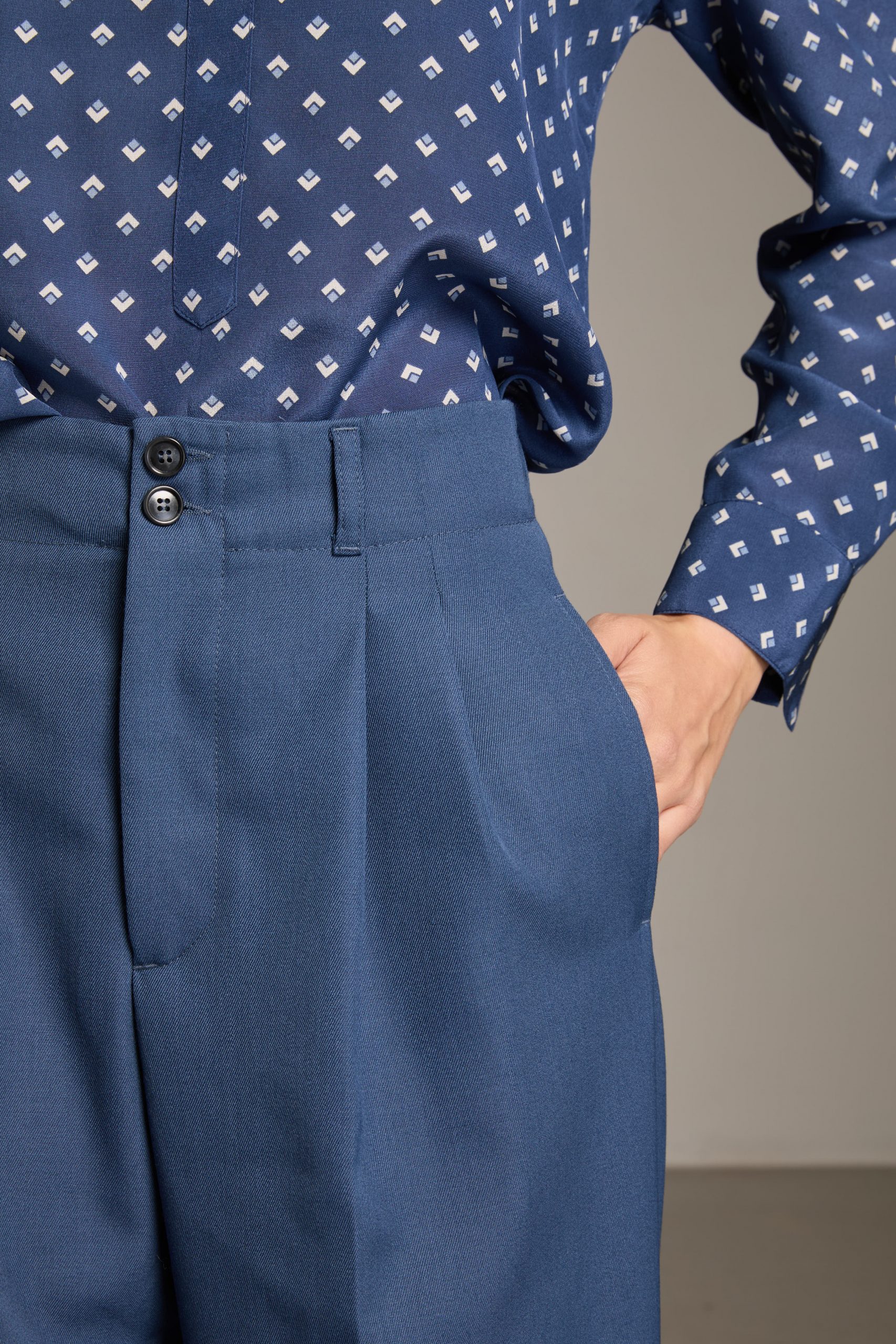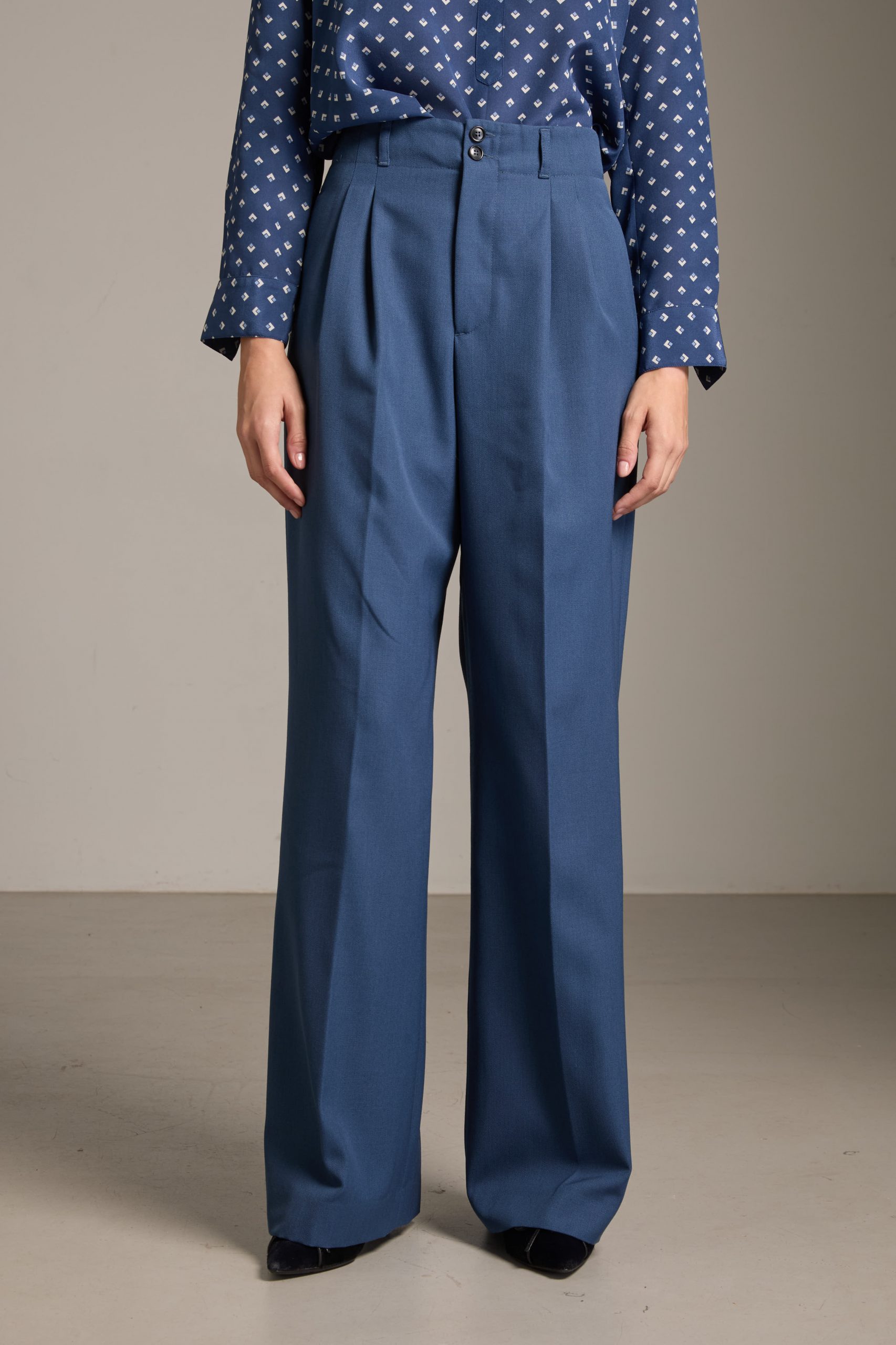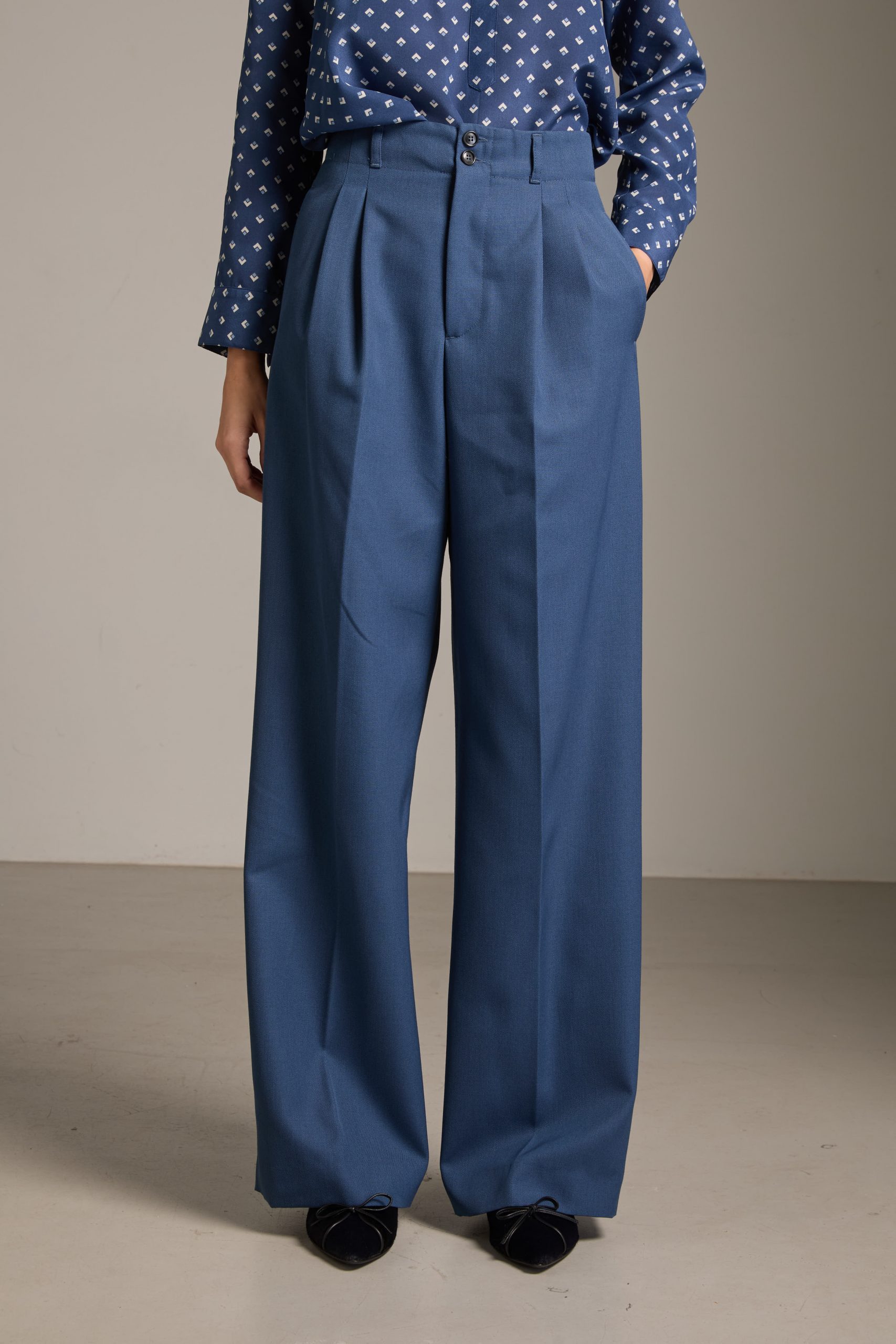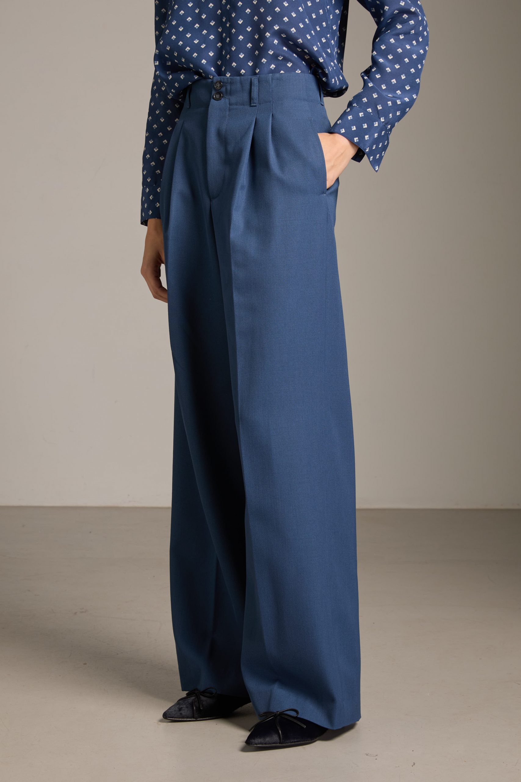 Pantaloni Kate di Carla Saibene in drill di lana azzurro polvere, dal taglio maschile e ampio, con doppia pince, tasche sul fianco e chiusi da doppio bottone effetto corno.