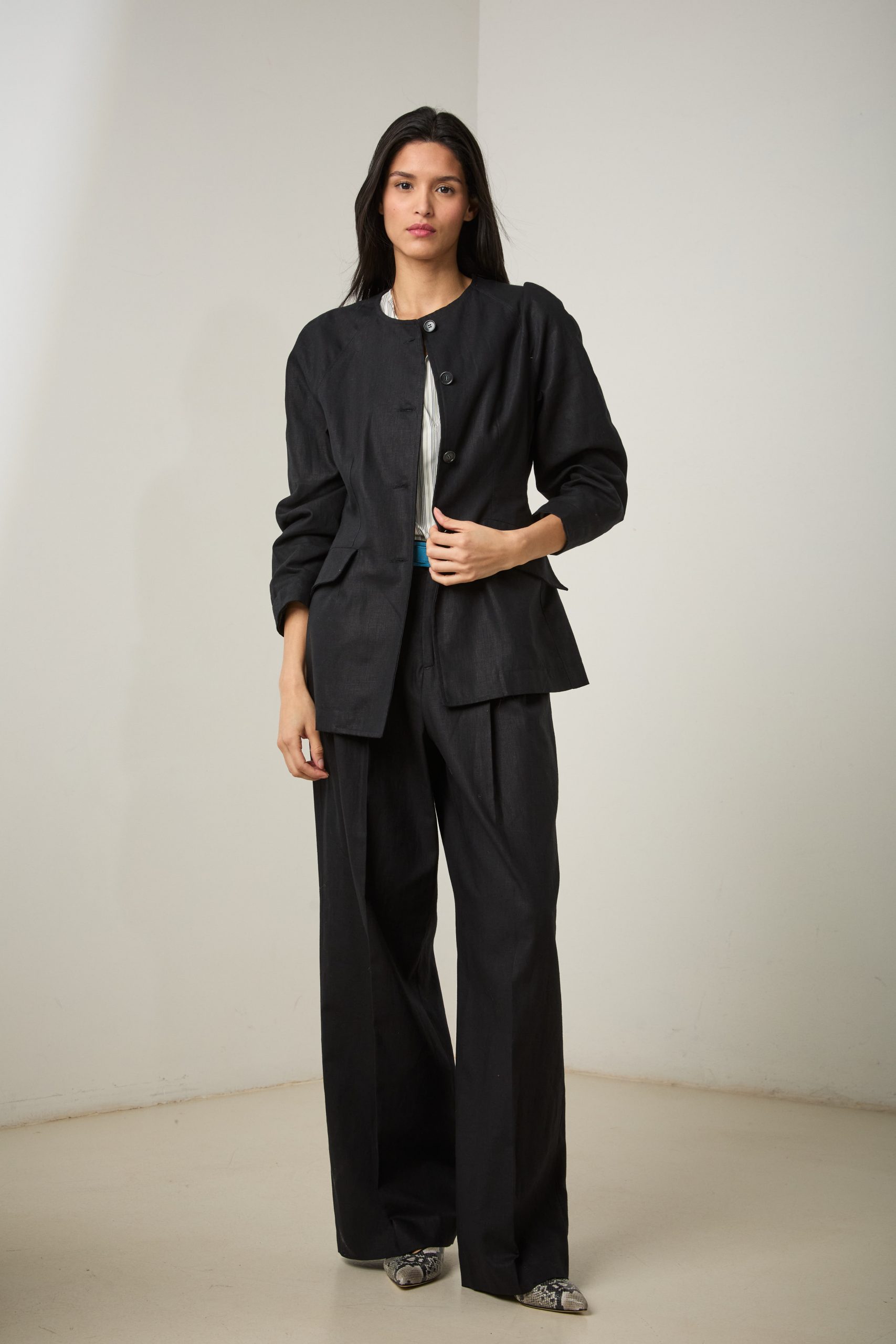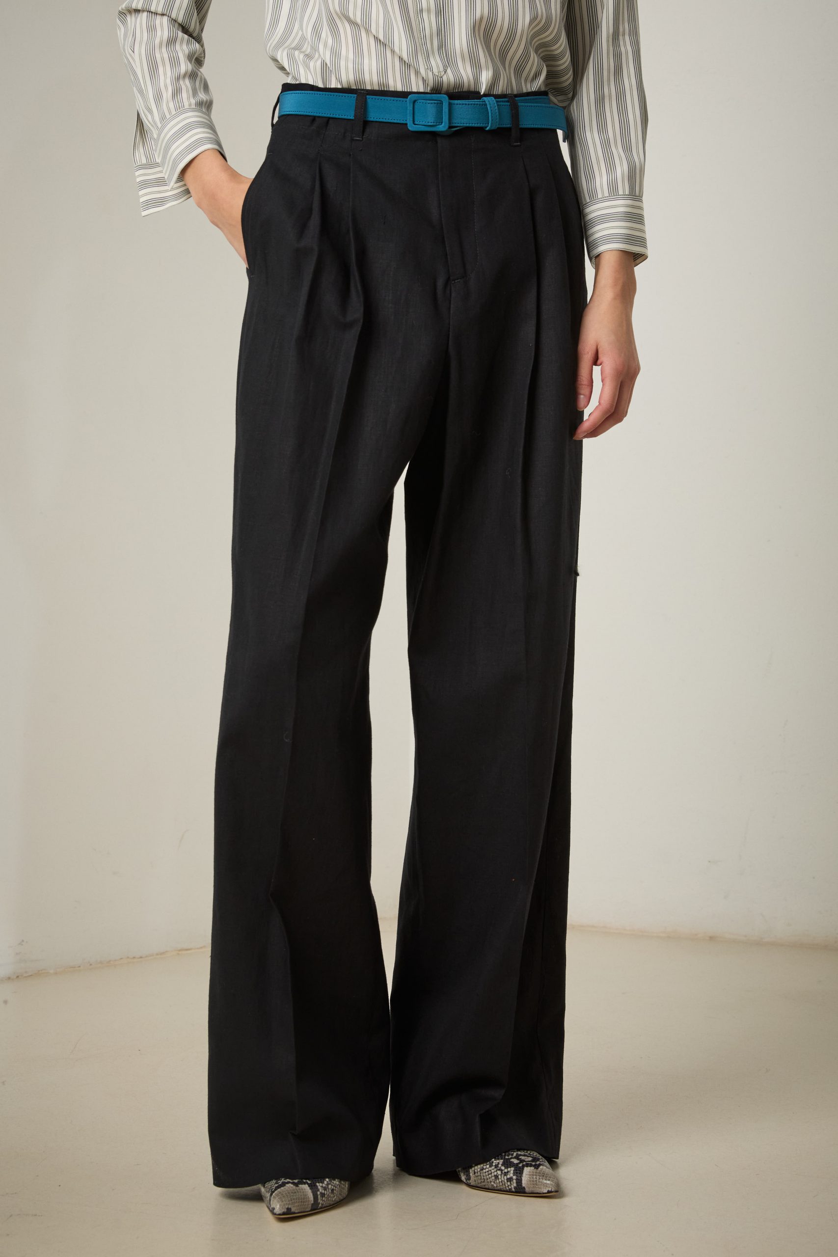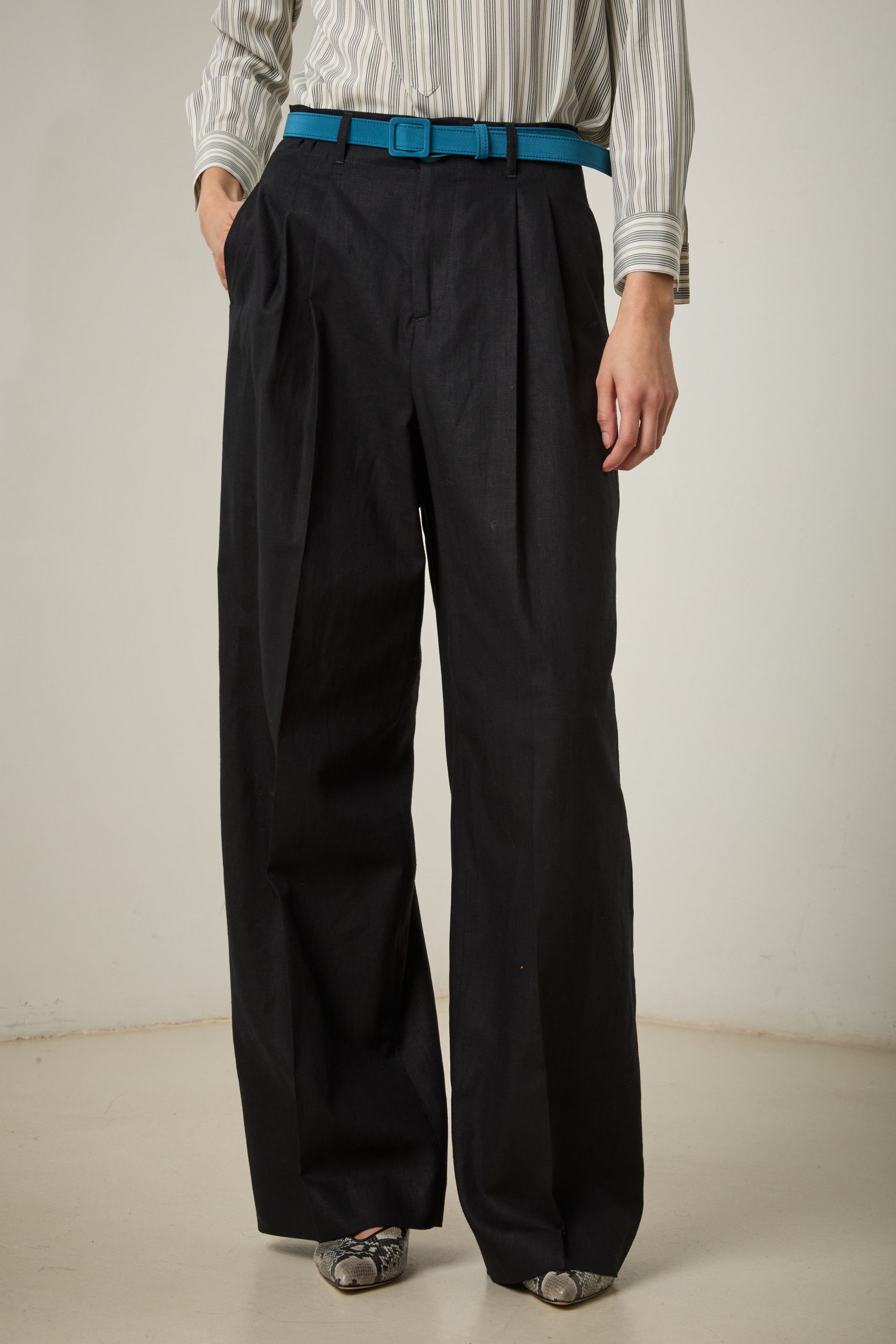 Pantaloni Kate di Carla Saibene in lino nero, dal taglio maschile e ampio, con doppia pince, tasche sul fianco e chiusi da doppio bottone effetto corno.