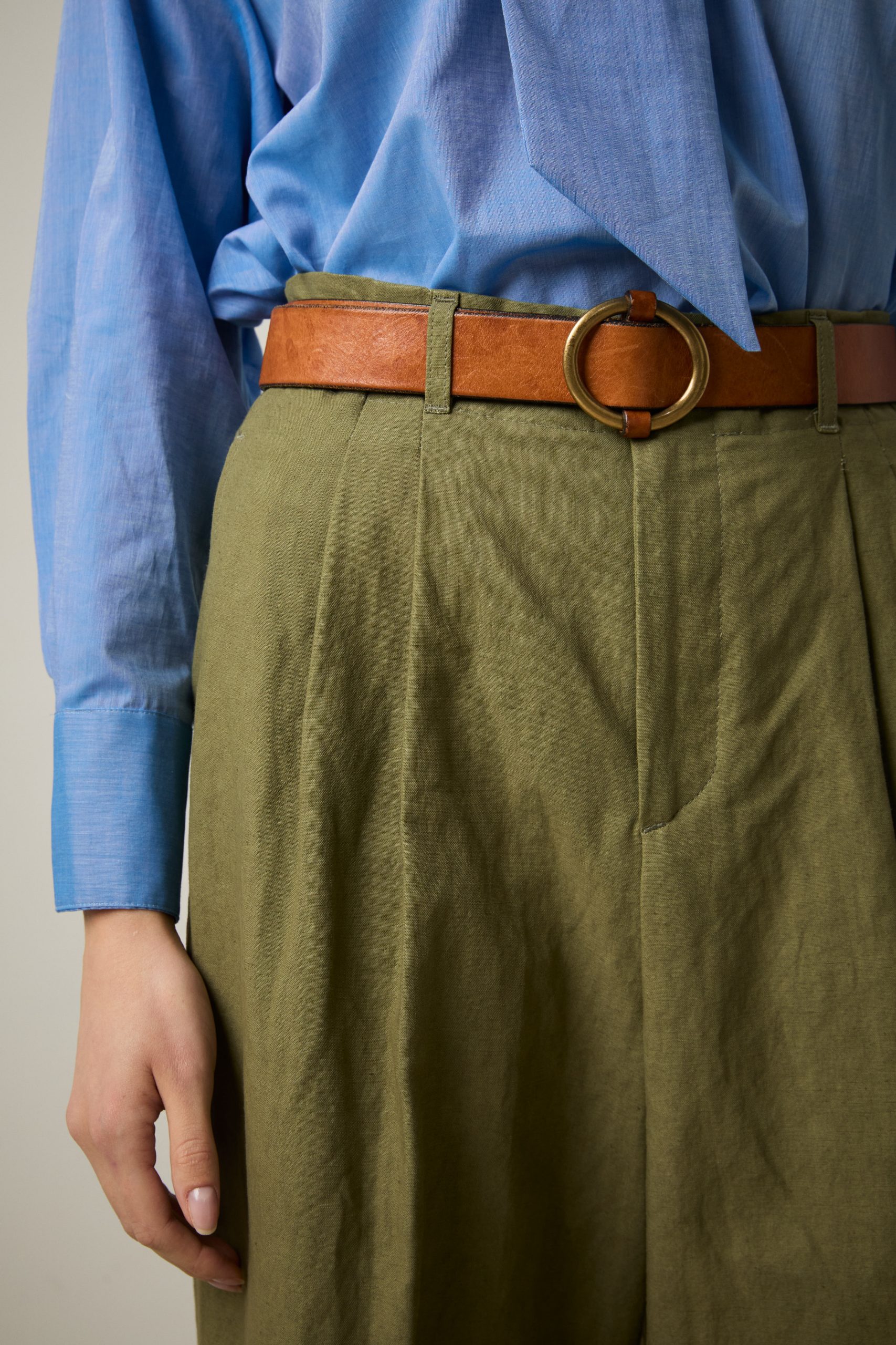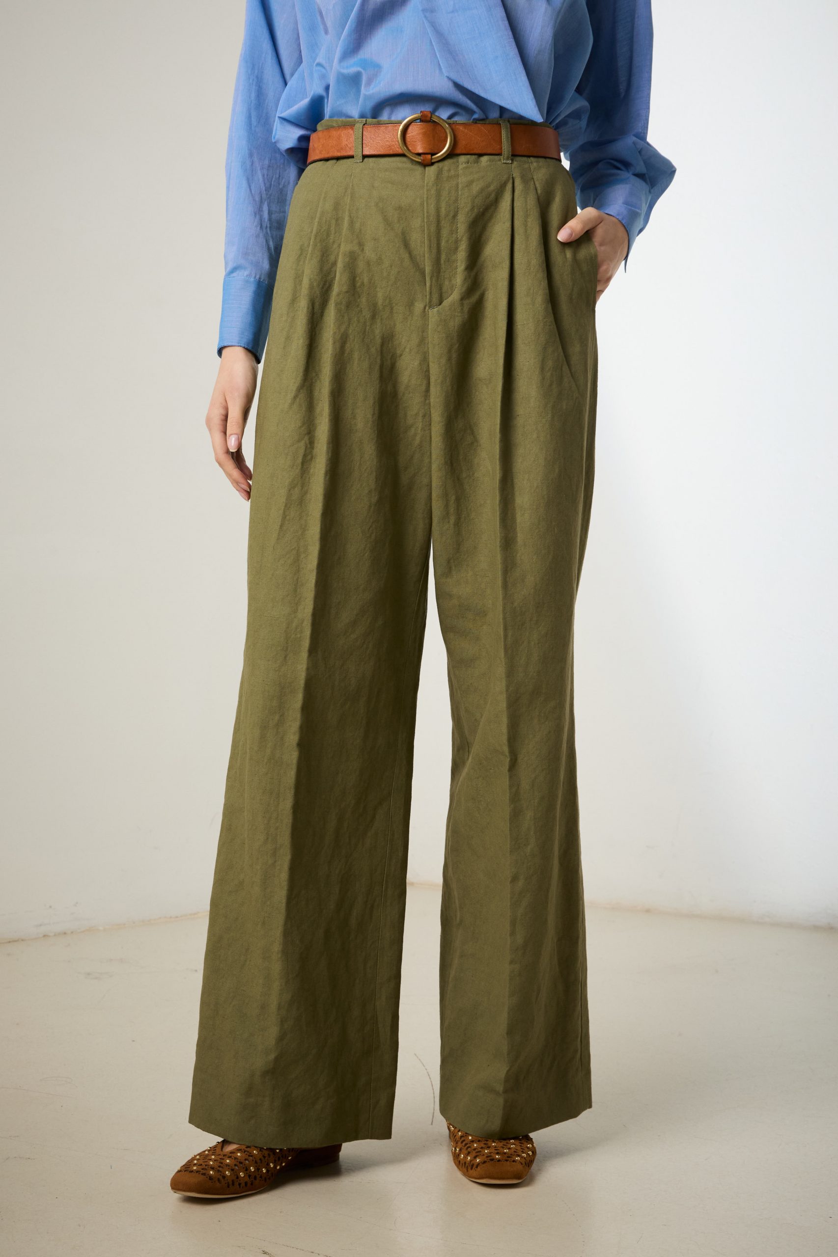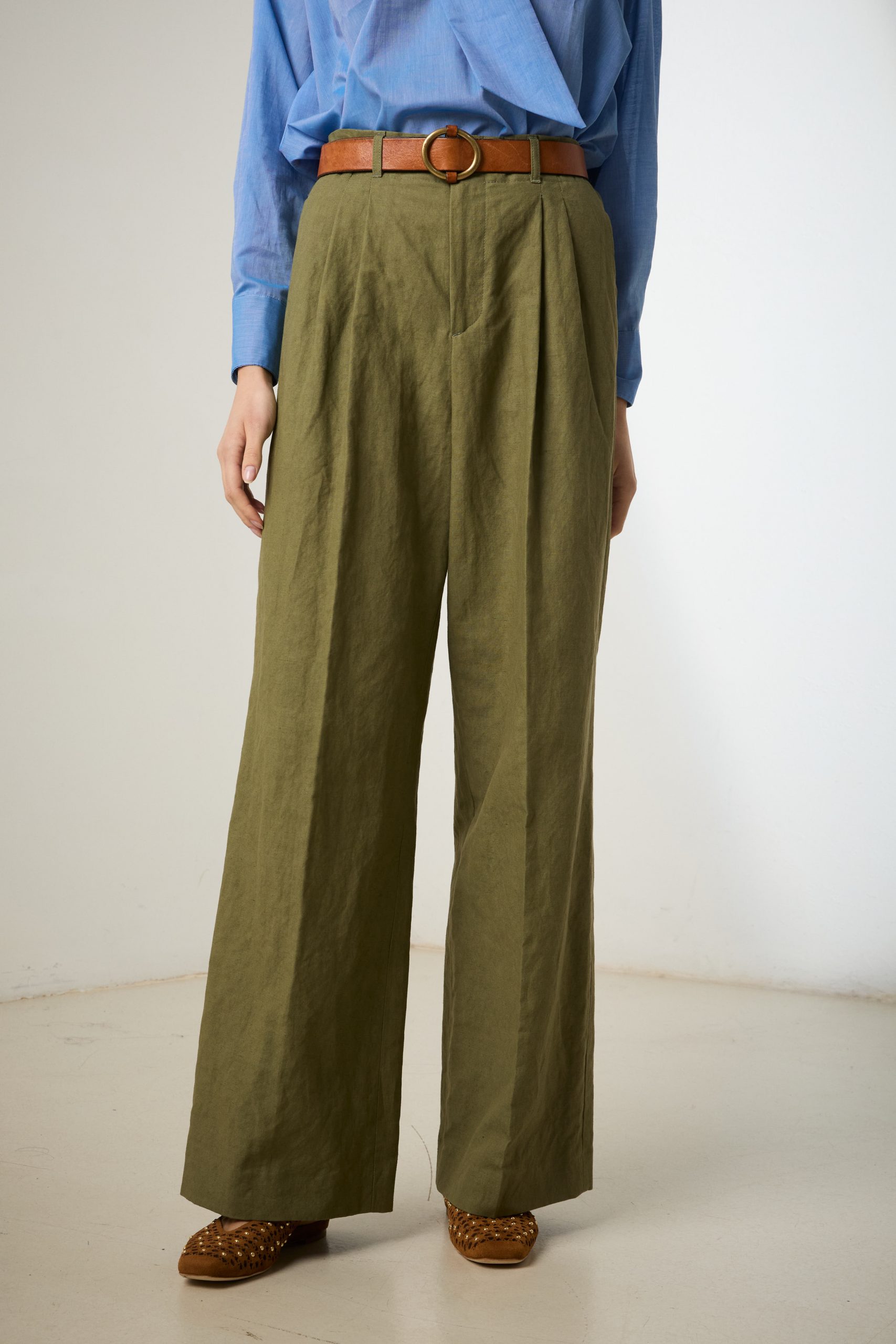 Pantaloni Kate di Carla Saibene in lino verde oliva, dal taglio maschile e ampio, con doppia pince, tasche sul fianco e chiusi da doppio bottone effetto corno.