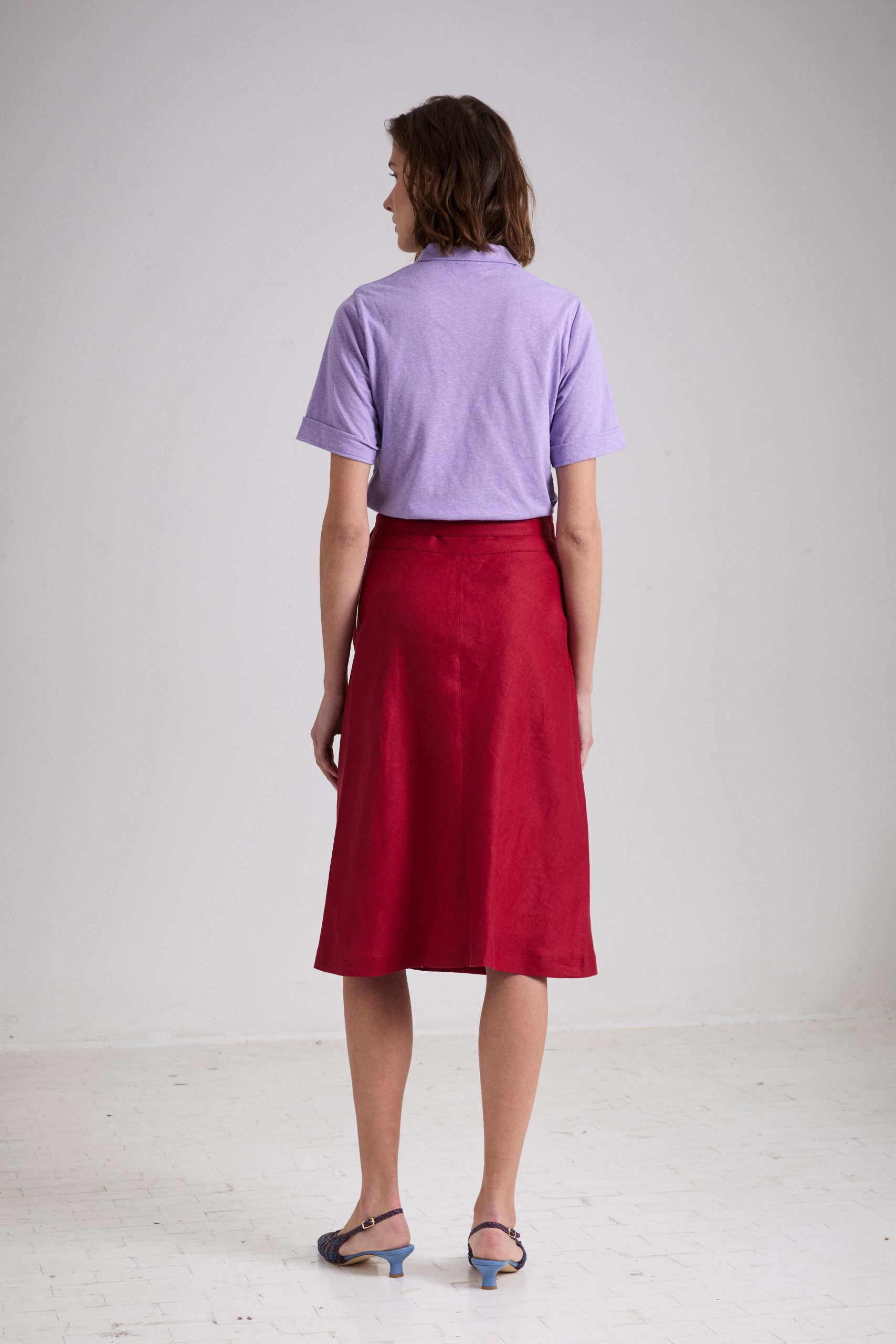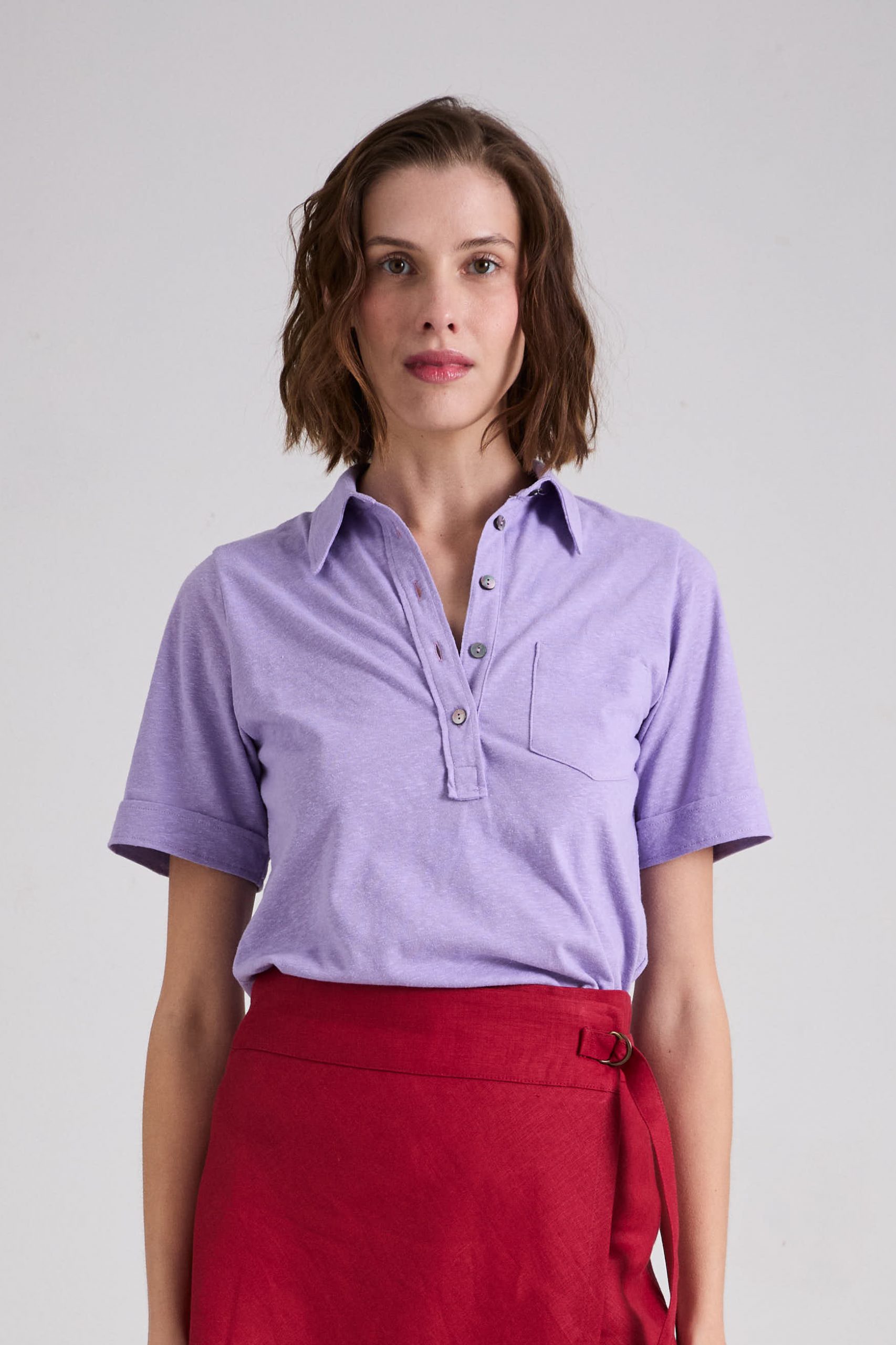 Polo Nicole in jersey di lino lilla di Carla Saibene, con piccolo colletto, maniche corte a tubo e vestibilità asciutta dal mood Seventies.