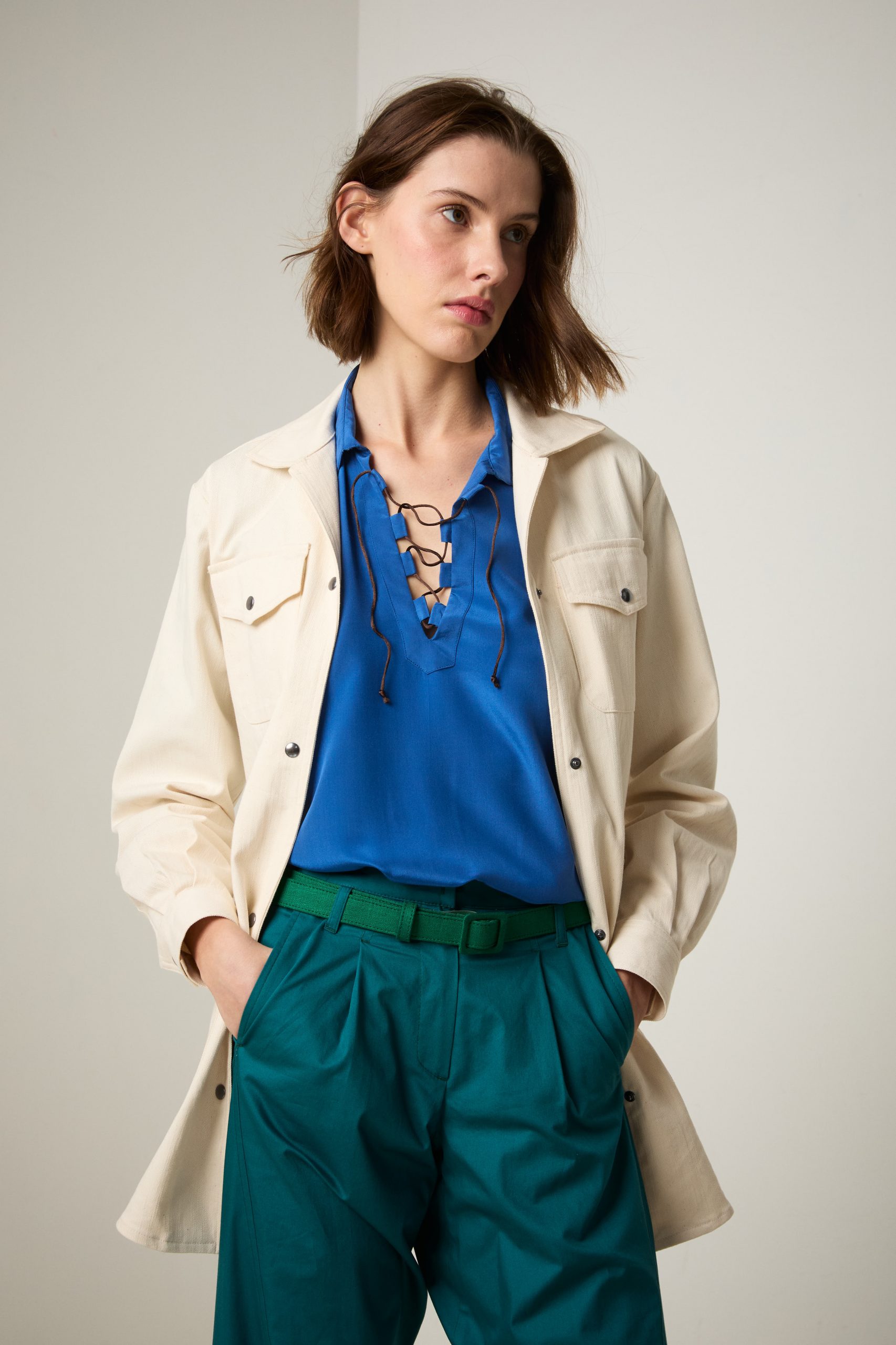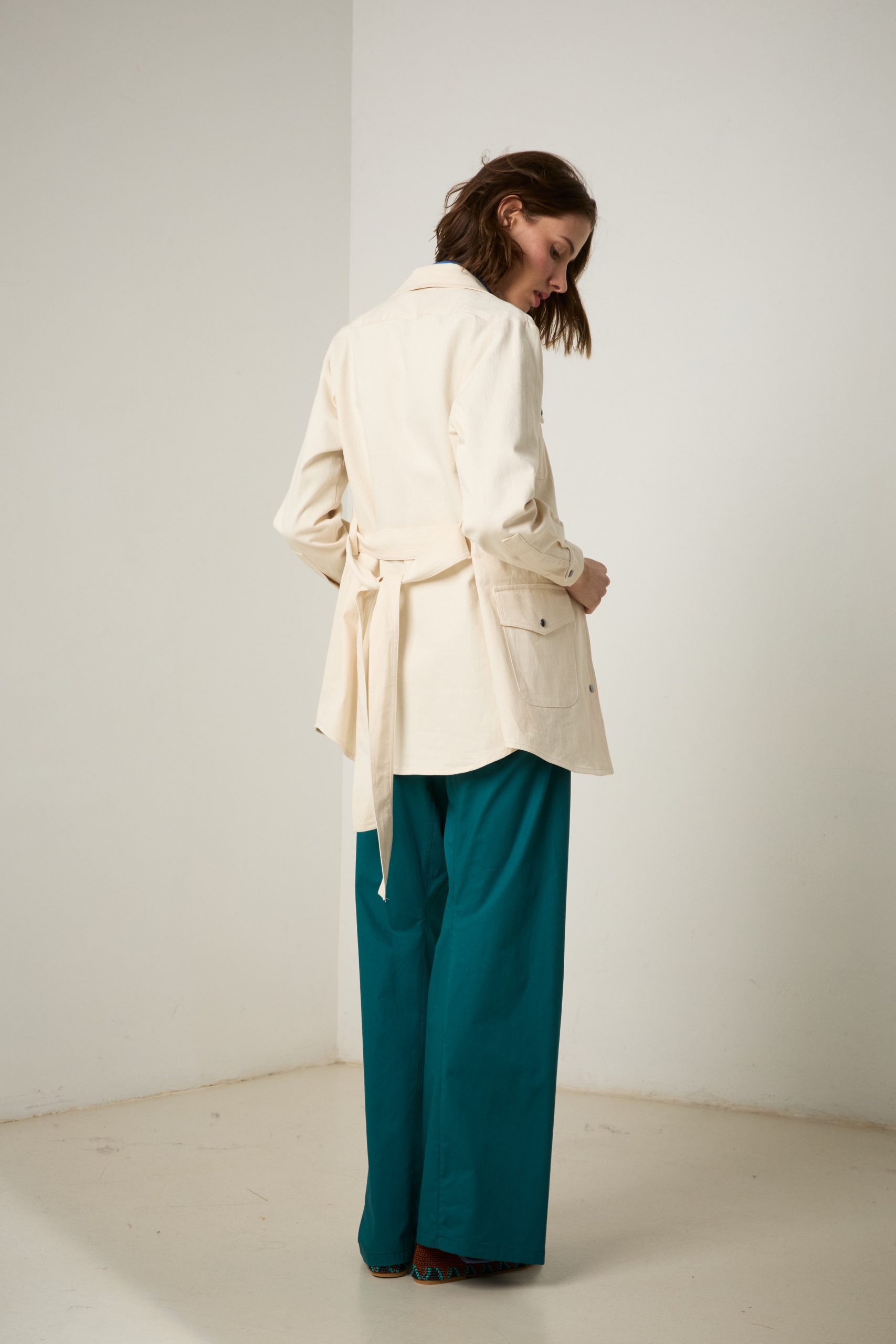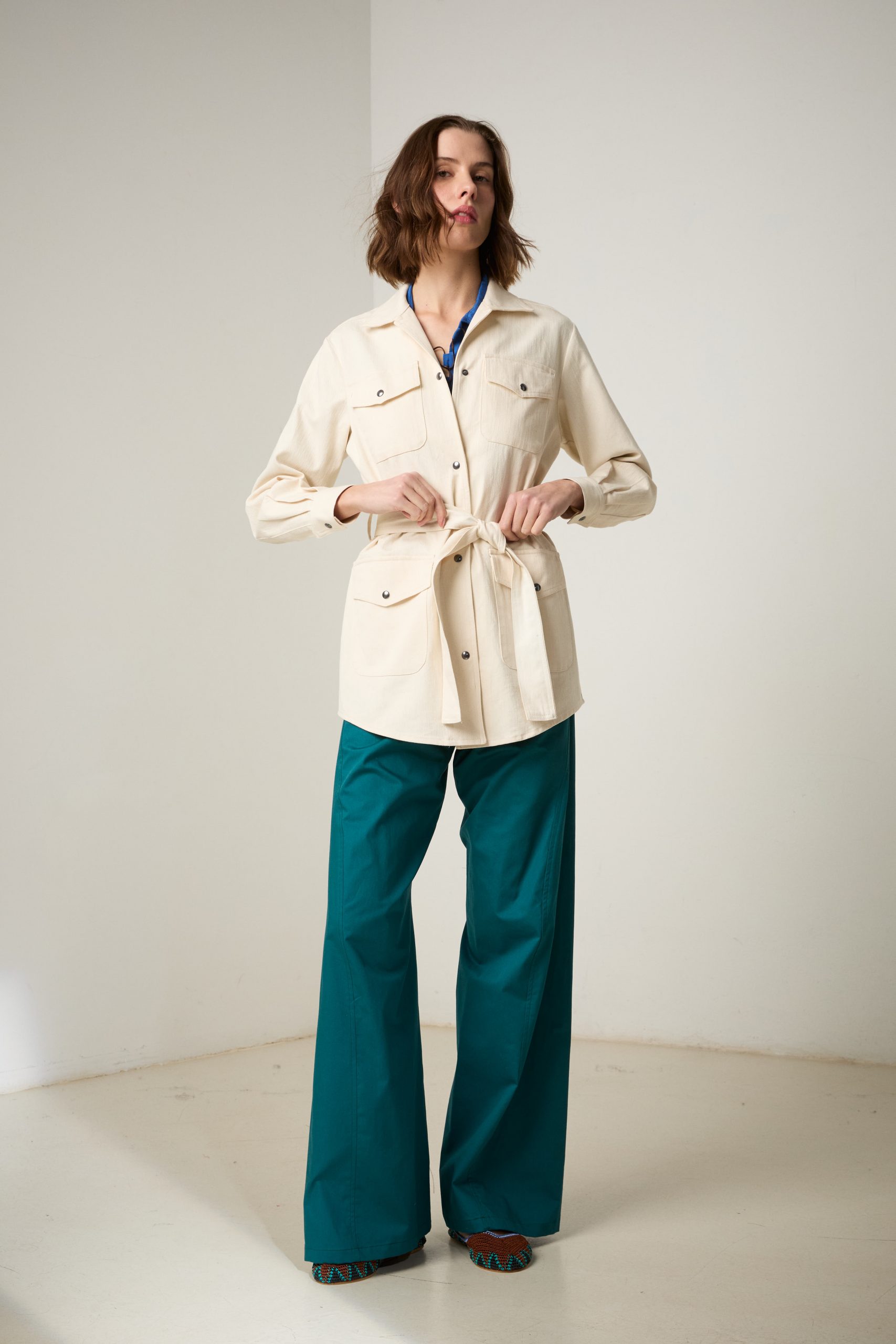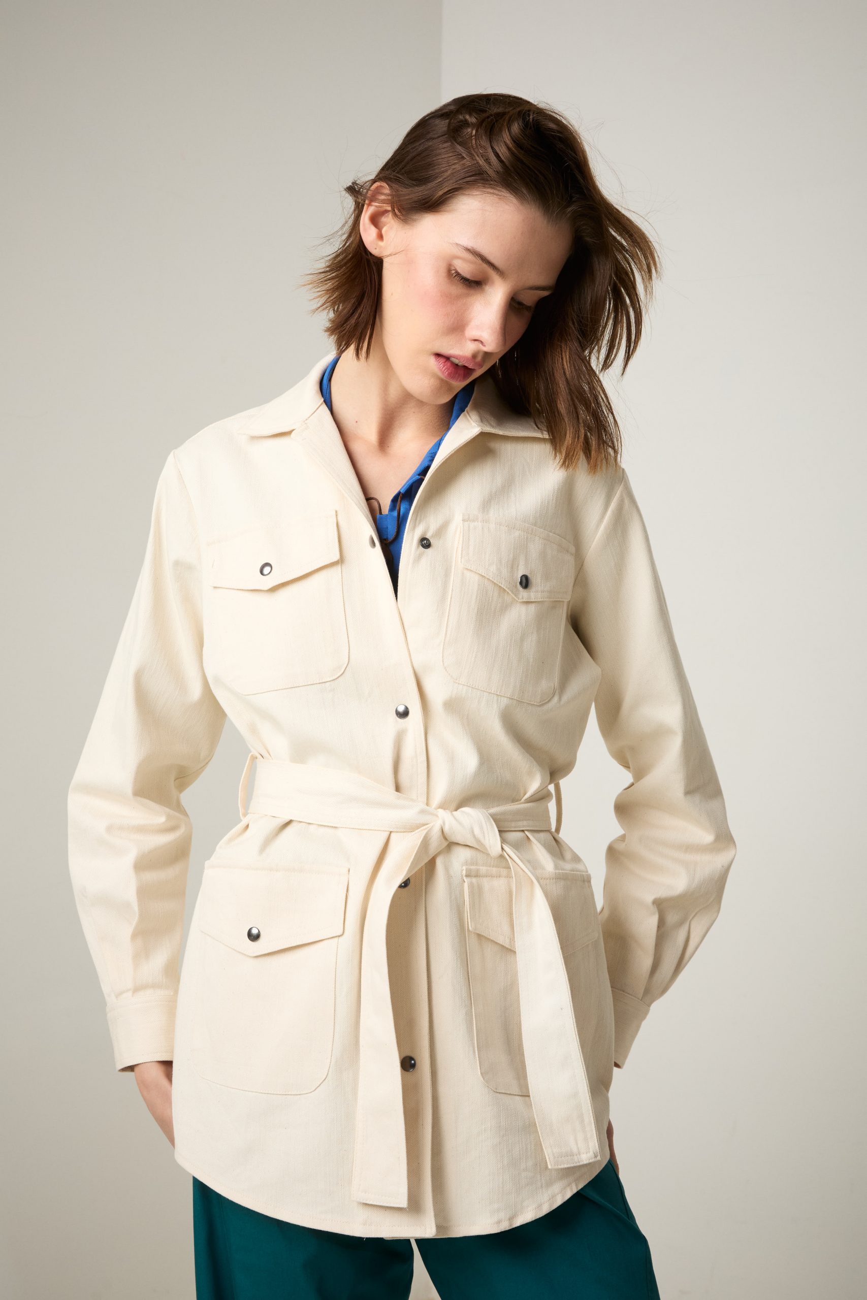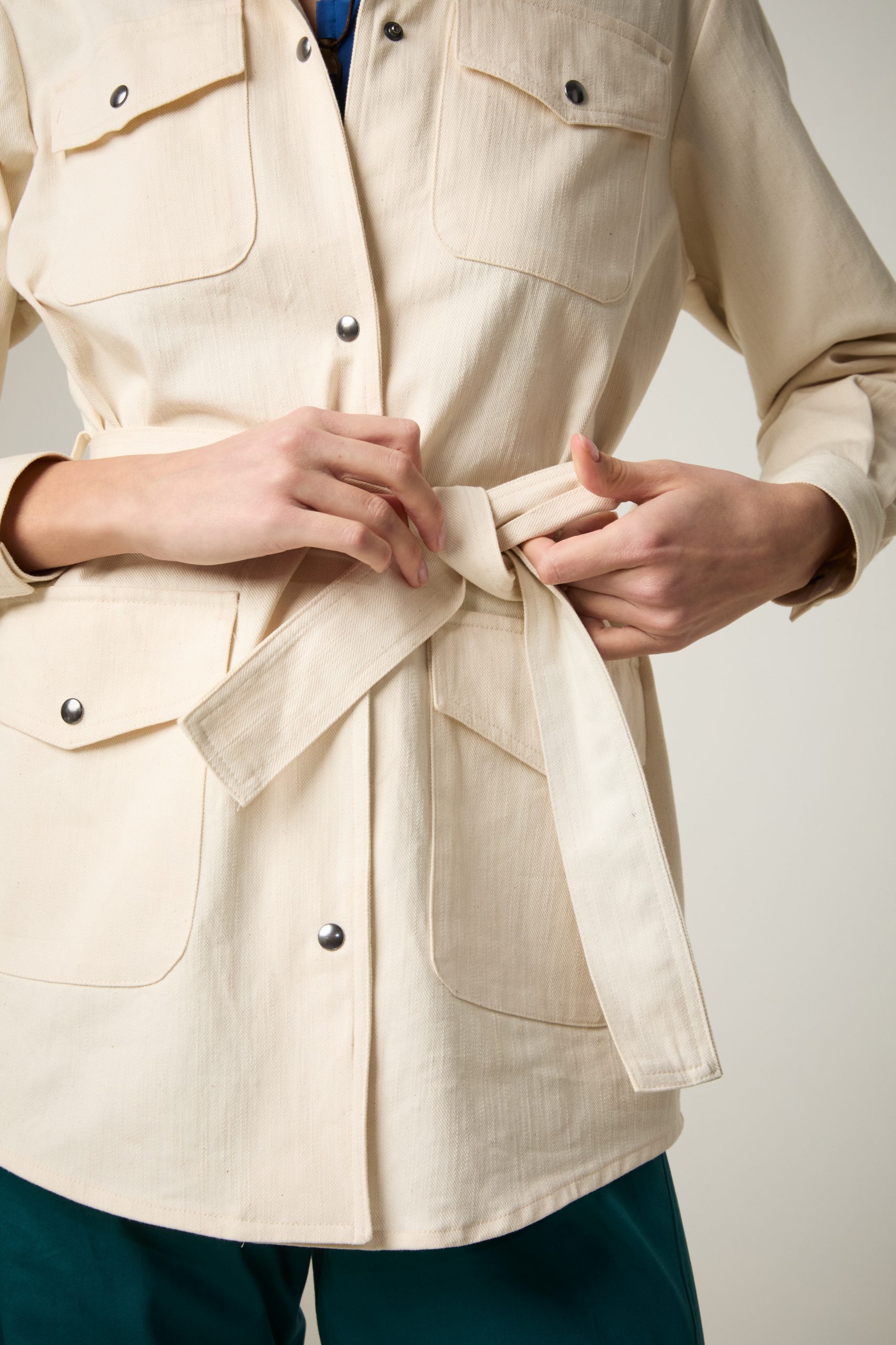 Sahariana Daria di Carla Saibene in denim avorio con tasche applicate, bottoni effetto corno, cintura e passanti nello stesso tessuto, sarà il passe-partout casual chic del tuo guardaroba primaverile