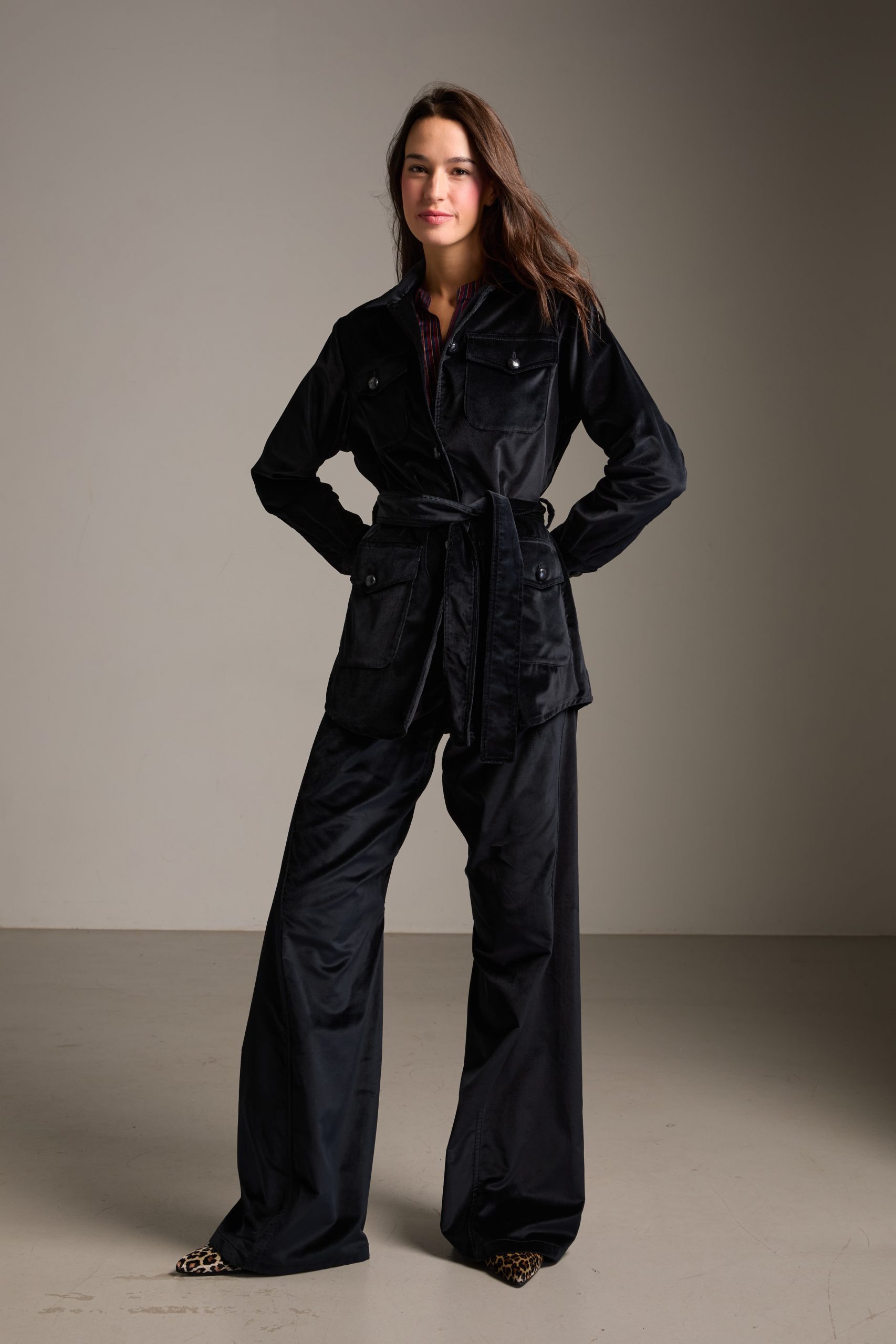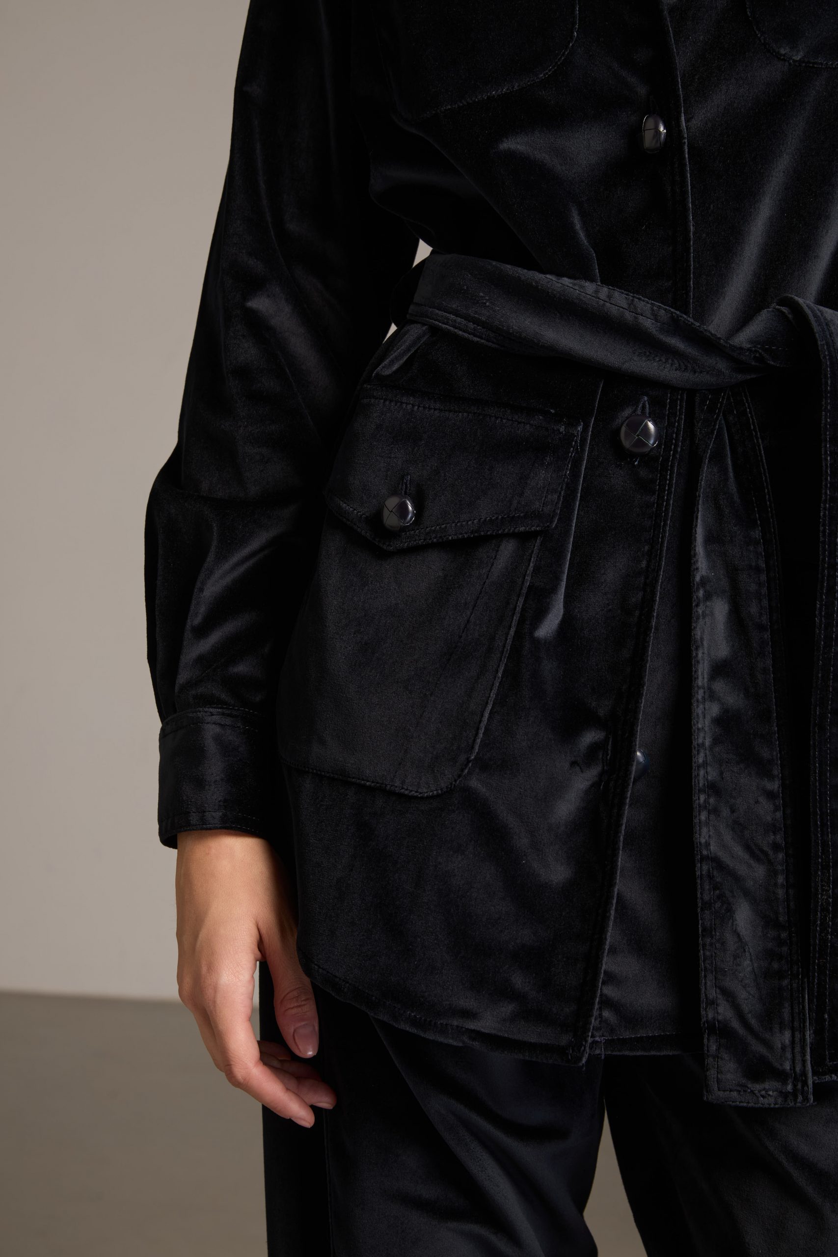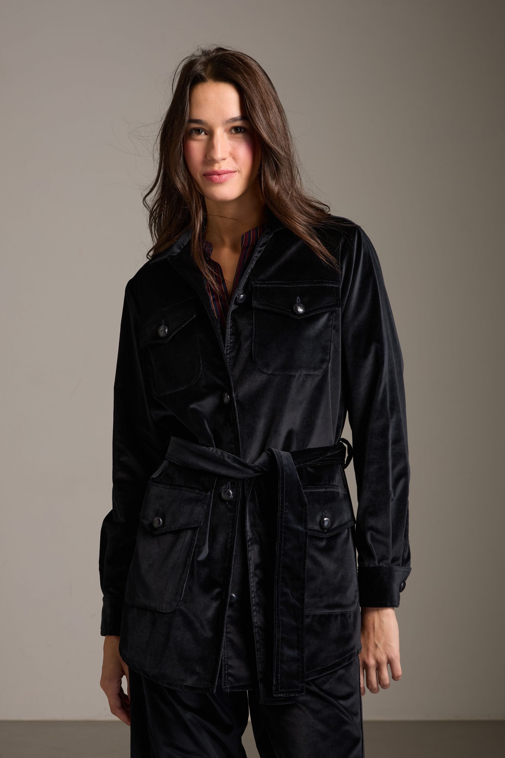 Sahariana Daria di Carla Saibene in panno di velluto liscio blu navy con tasche applicate, bottoni in cuoio, cintura e passanti nello stesso tessuto, sarà il passe-partout casual chic del tuo guardaroba invernale