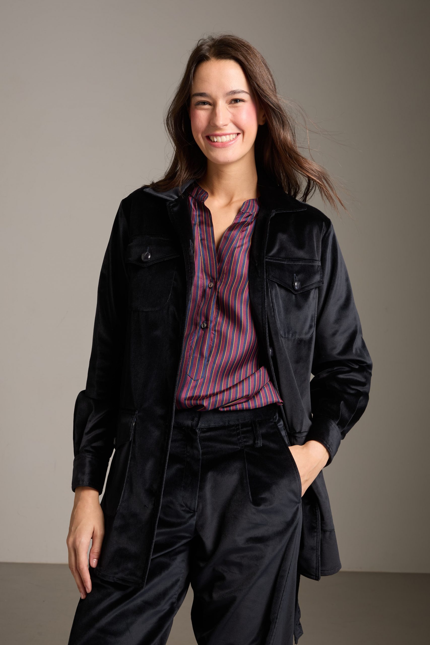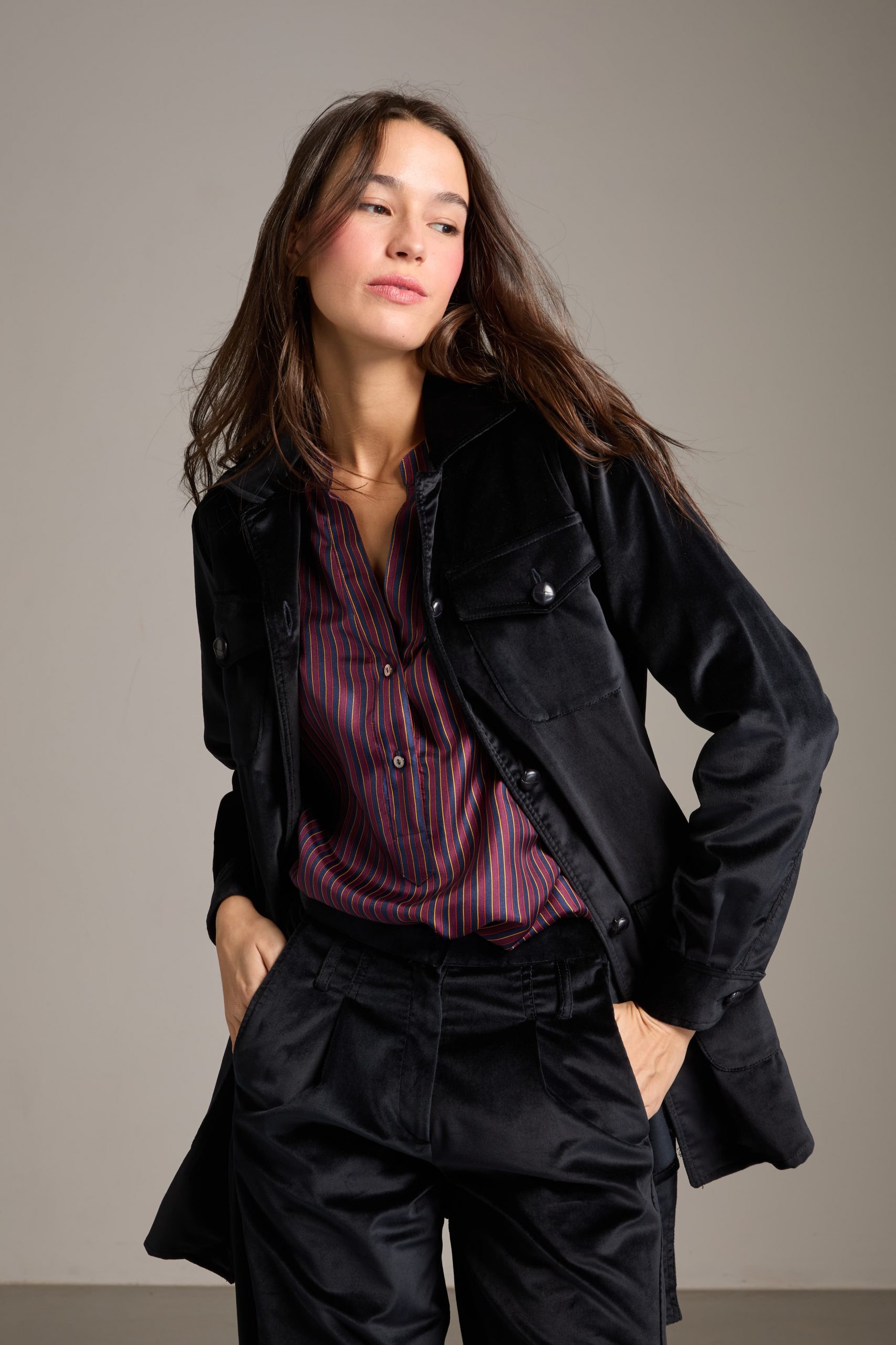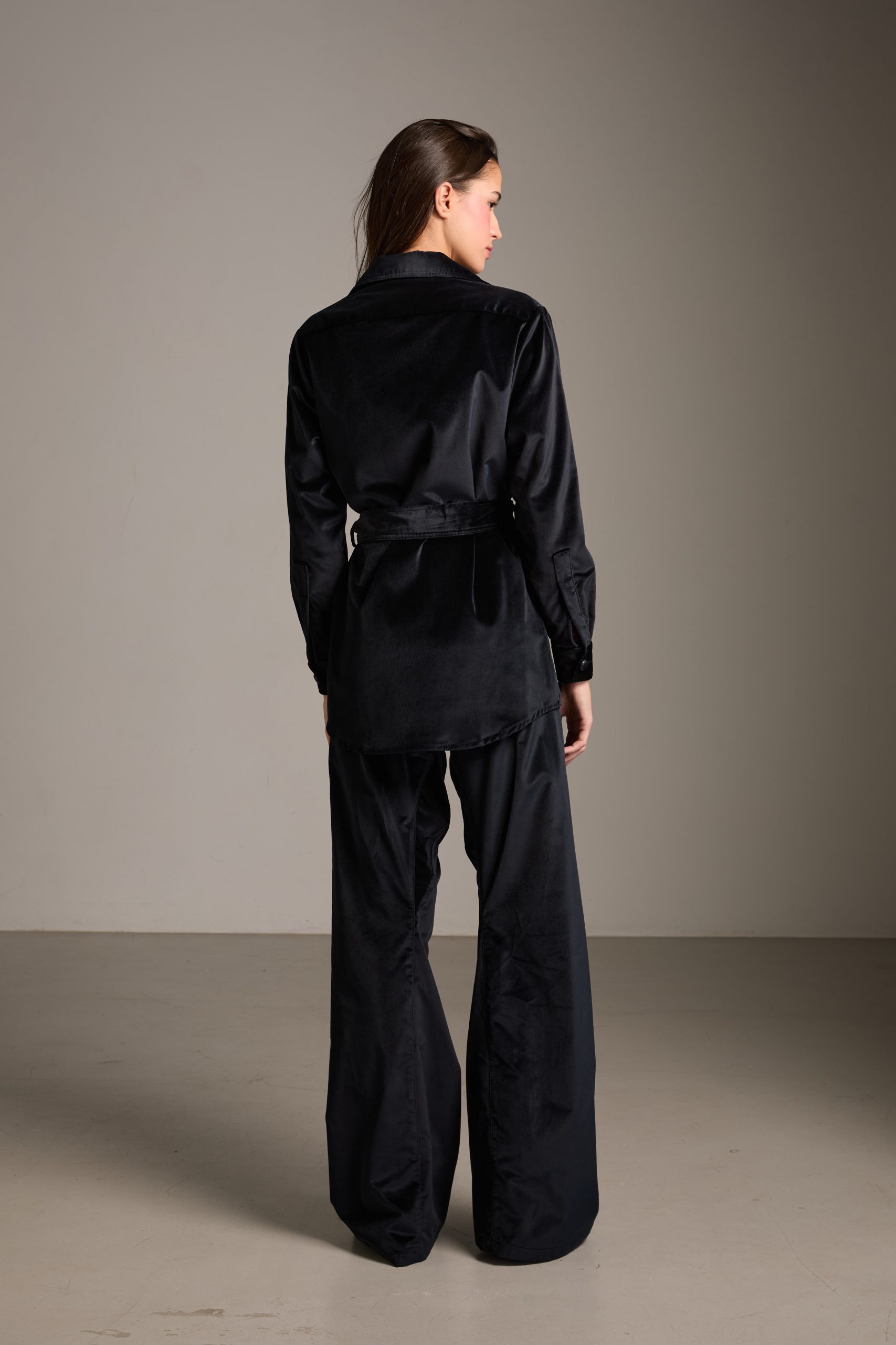 Sahariana Daria di Carla Saibene in panno di velluto liscio blu navy con tasche applicate, bottoni in cuoio, cintura e passanti nello stesso tessuto, sarà il passe-partout casual chic del tuo guardaroba invernale