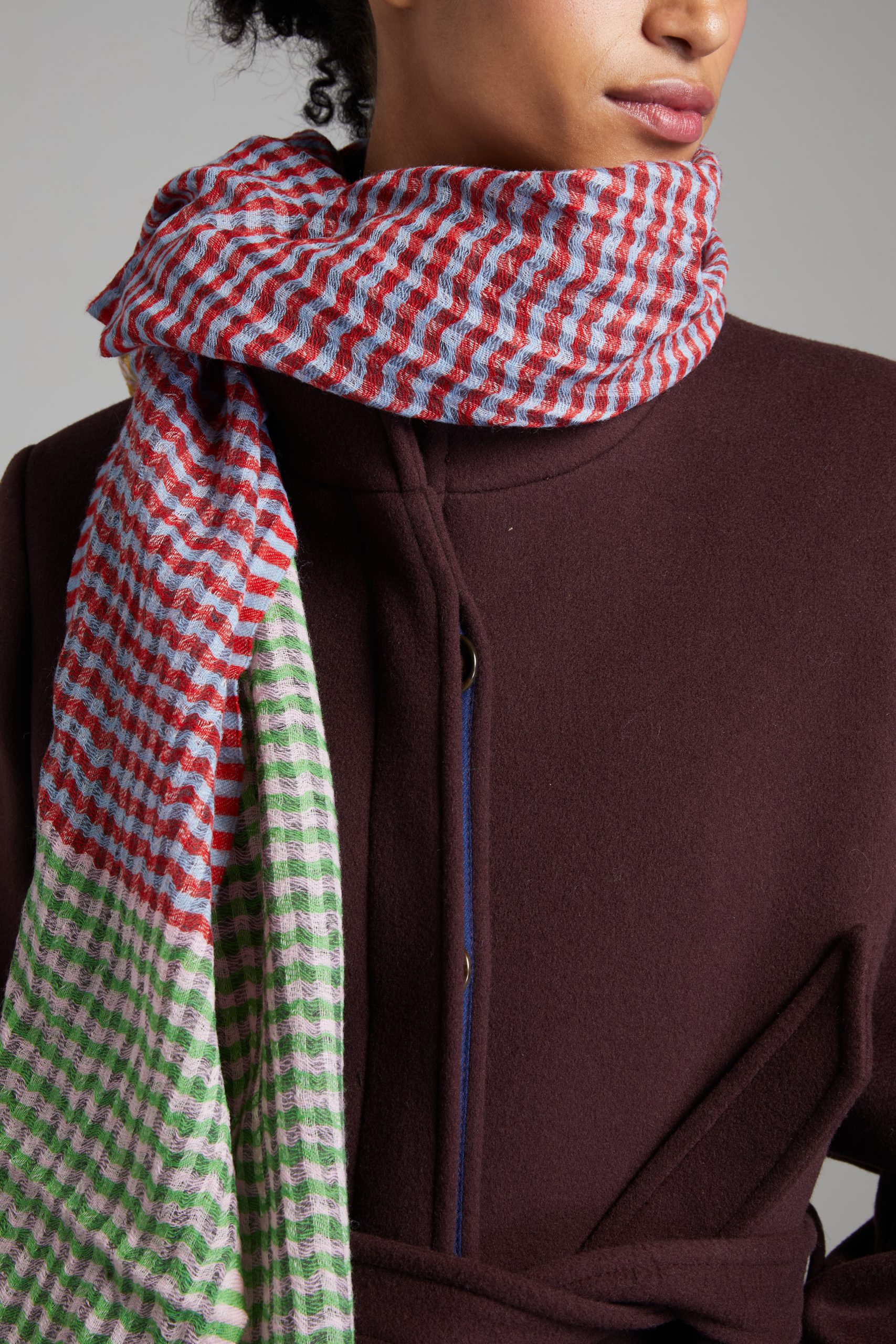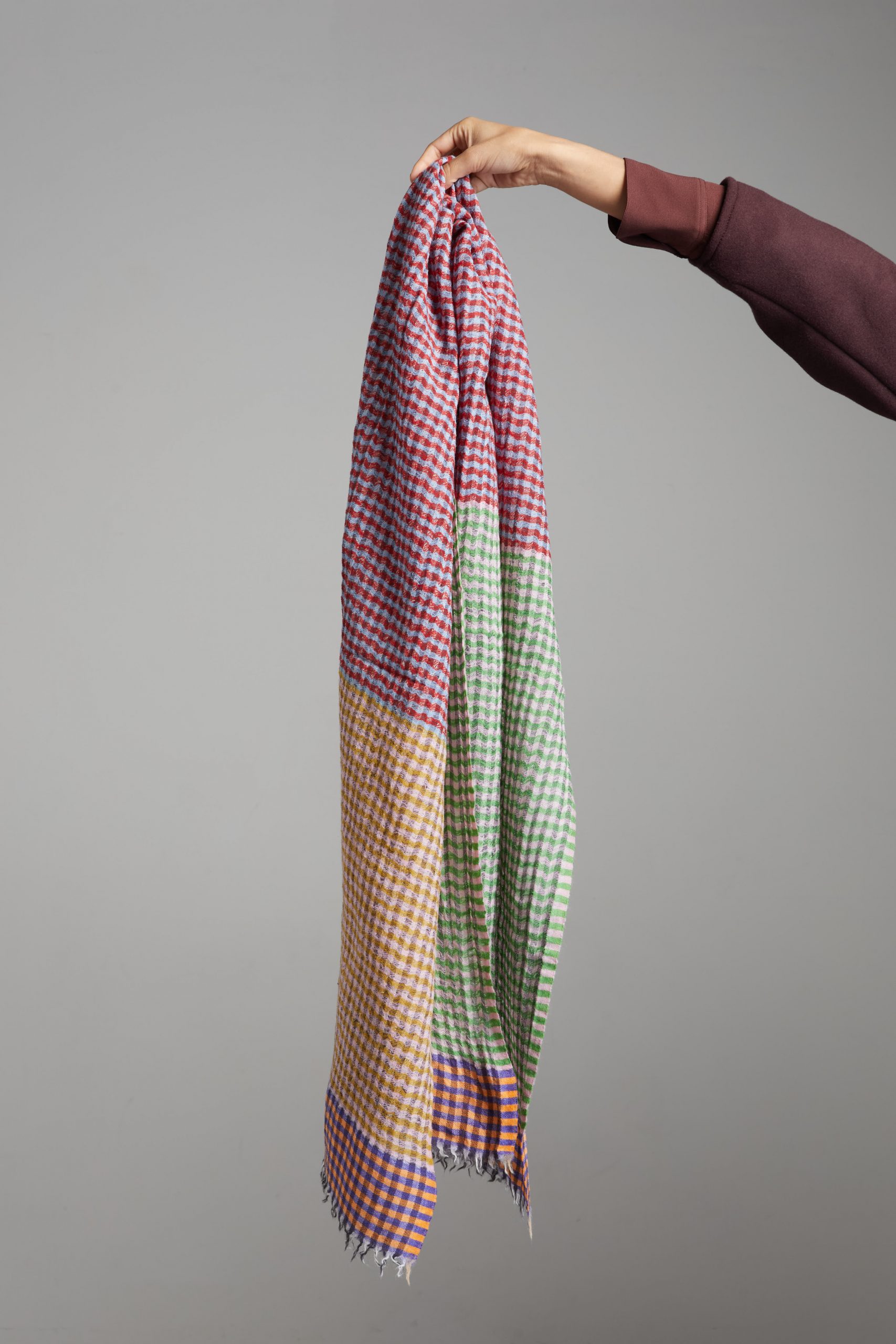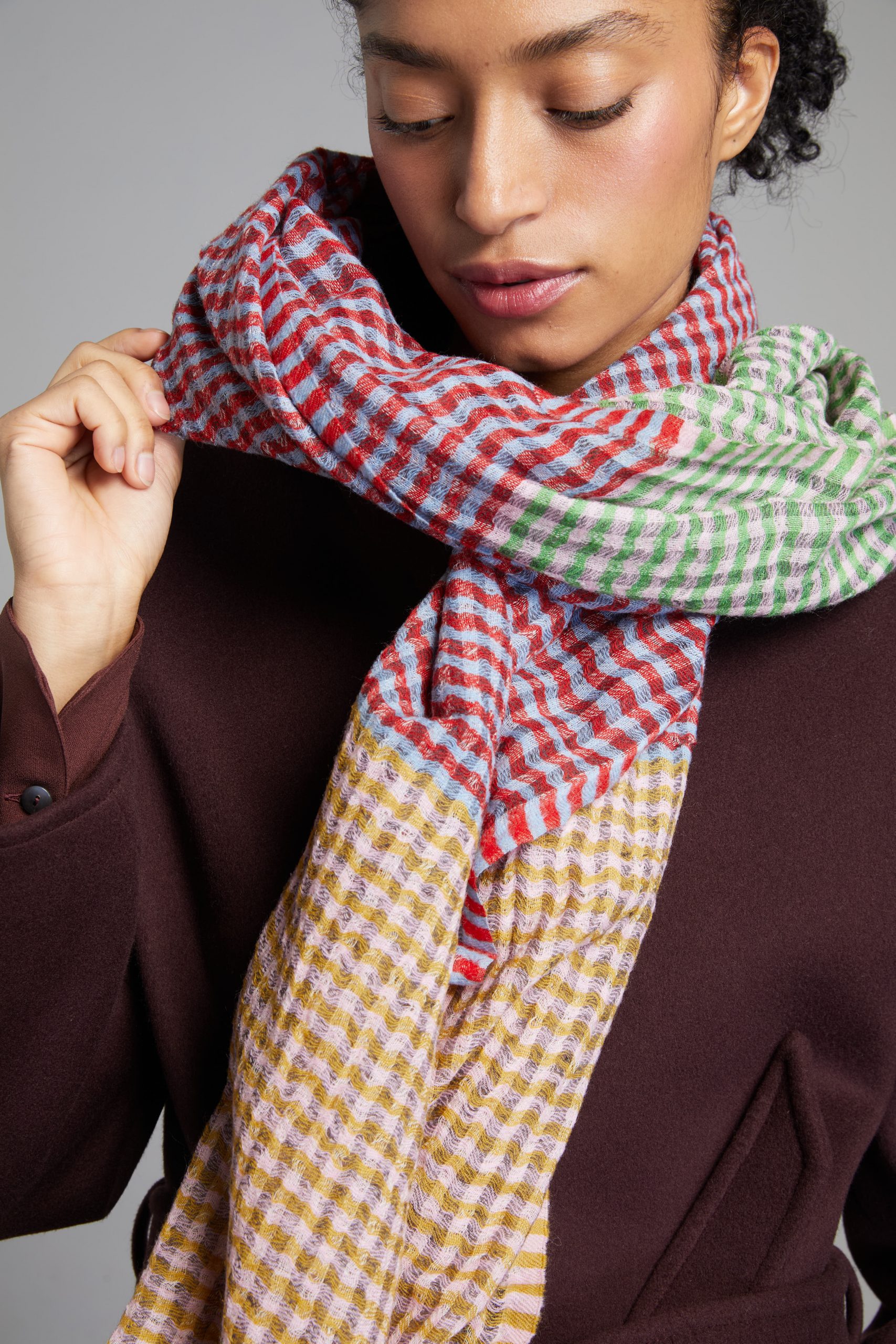Sciarpa in lana a quadrettini rossi verdi e gialli di Epice, finita con piccole frange