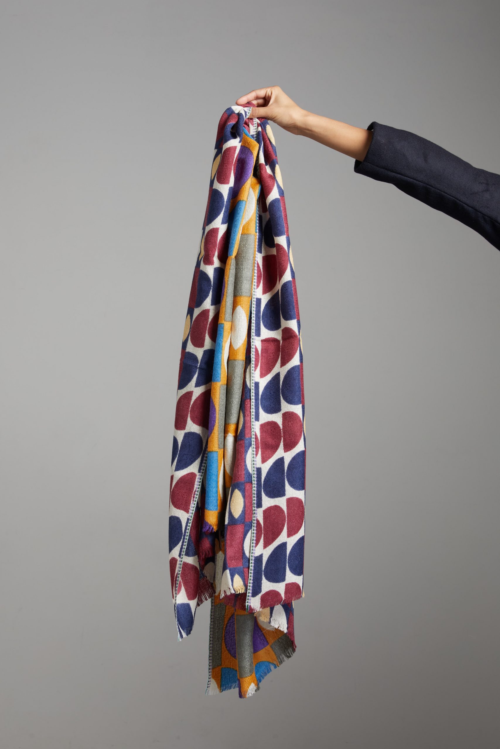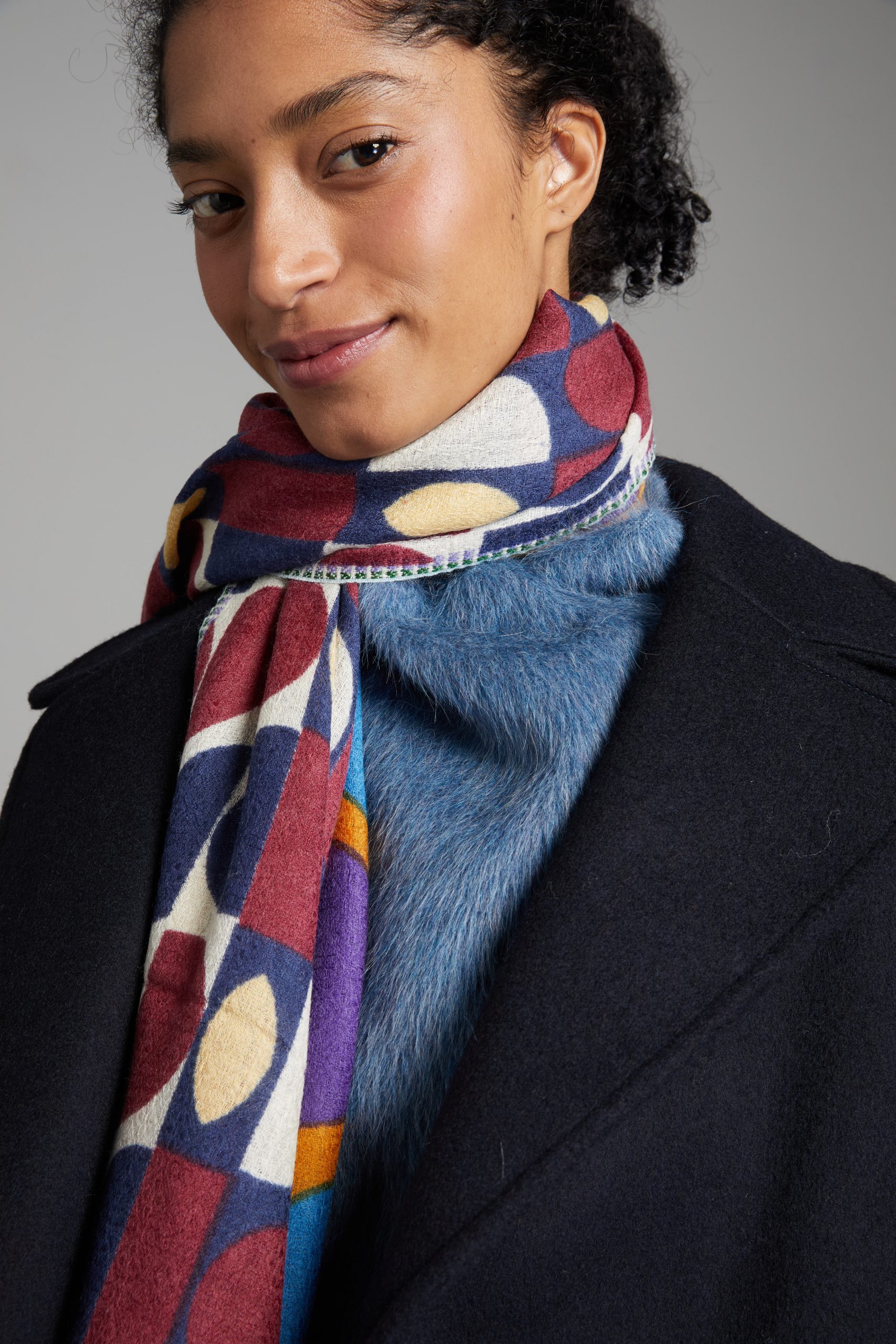 Sciarpa con stampa geometrica bordeaux senape blu e viola