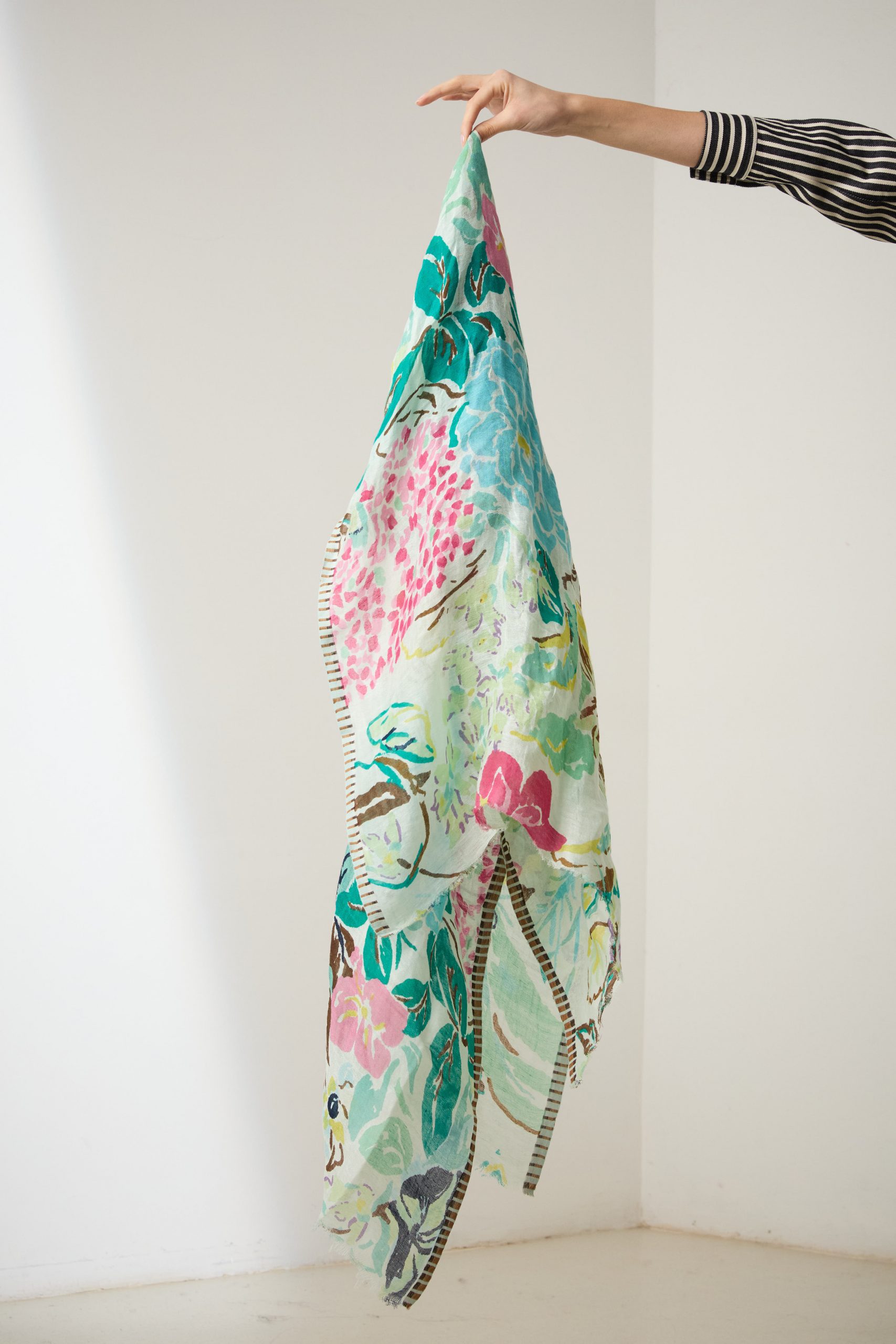 Sciarpa in lino e cotone di Epice stampata con motivo a fiori verde, rosa e azzurro e bordo ricamato a contrasto
