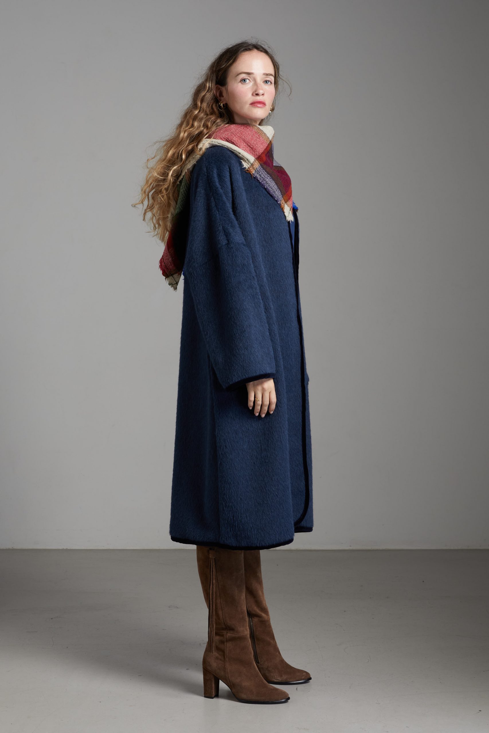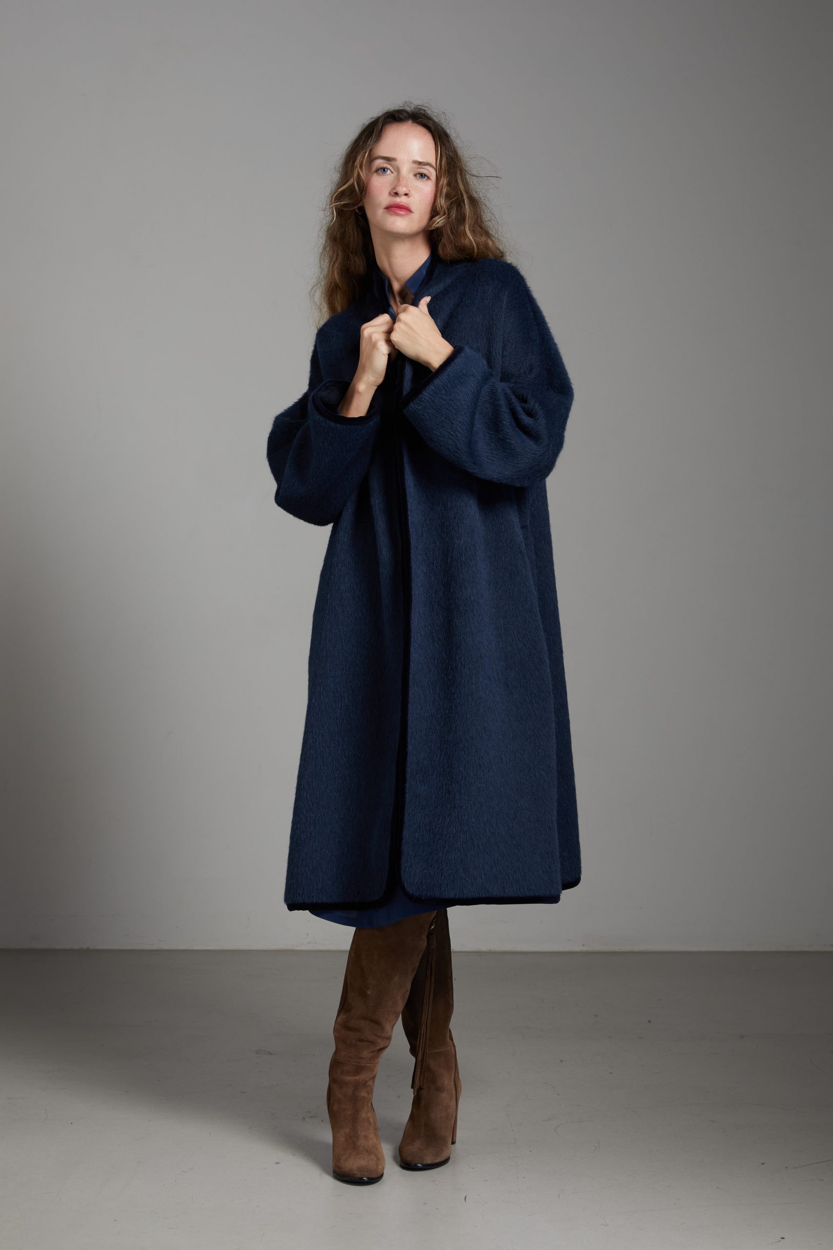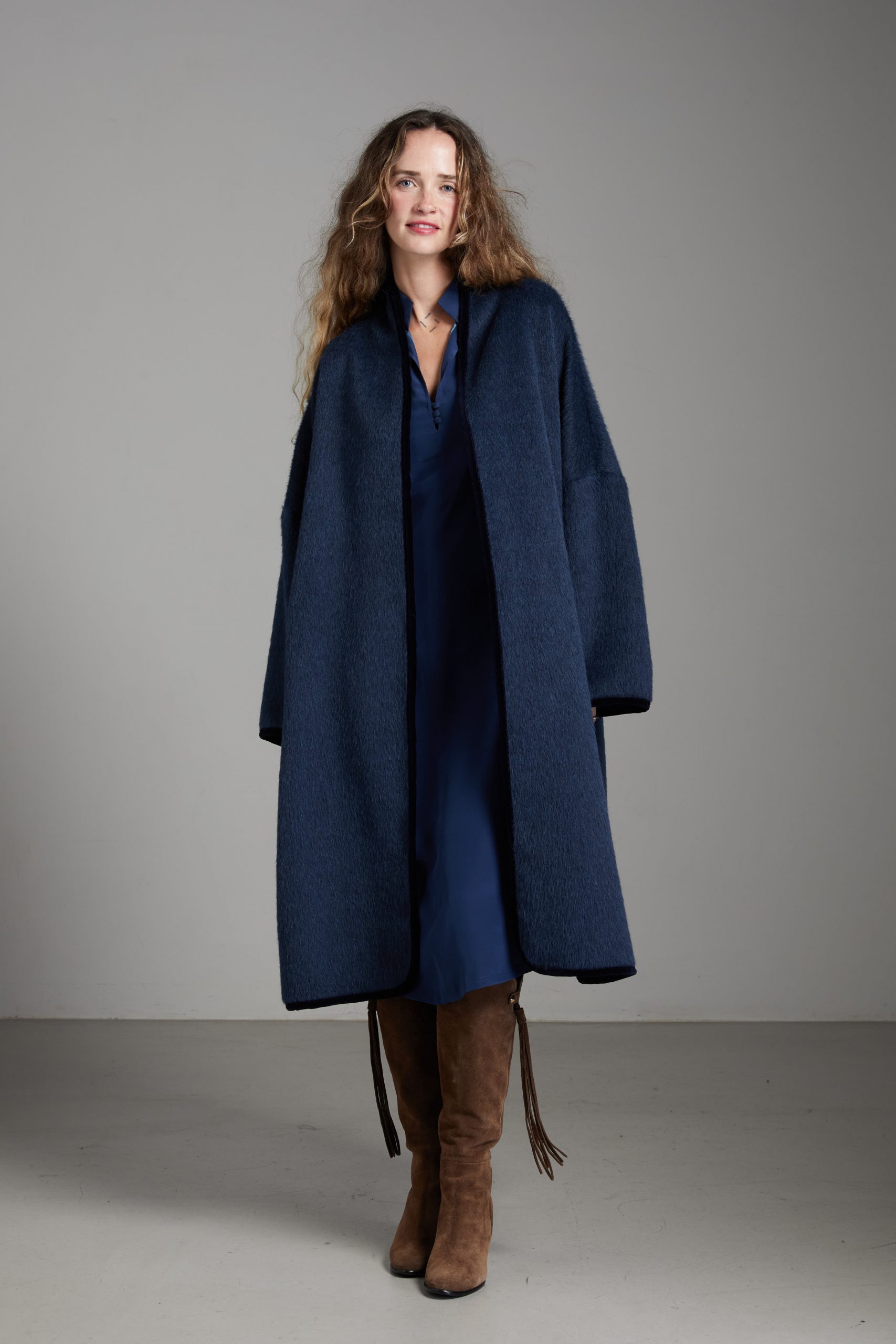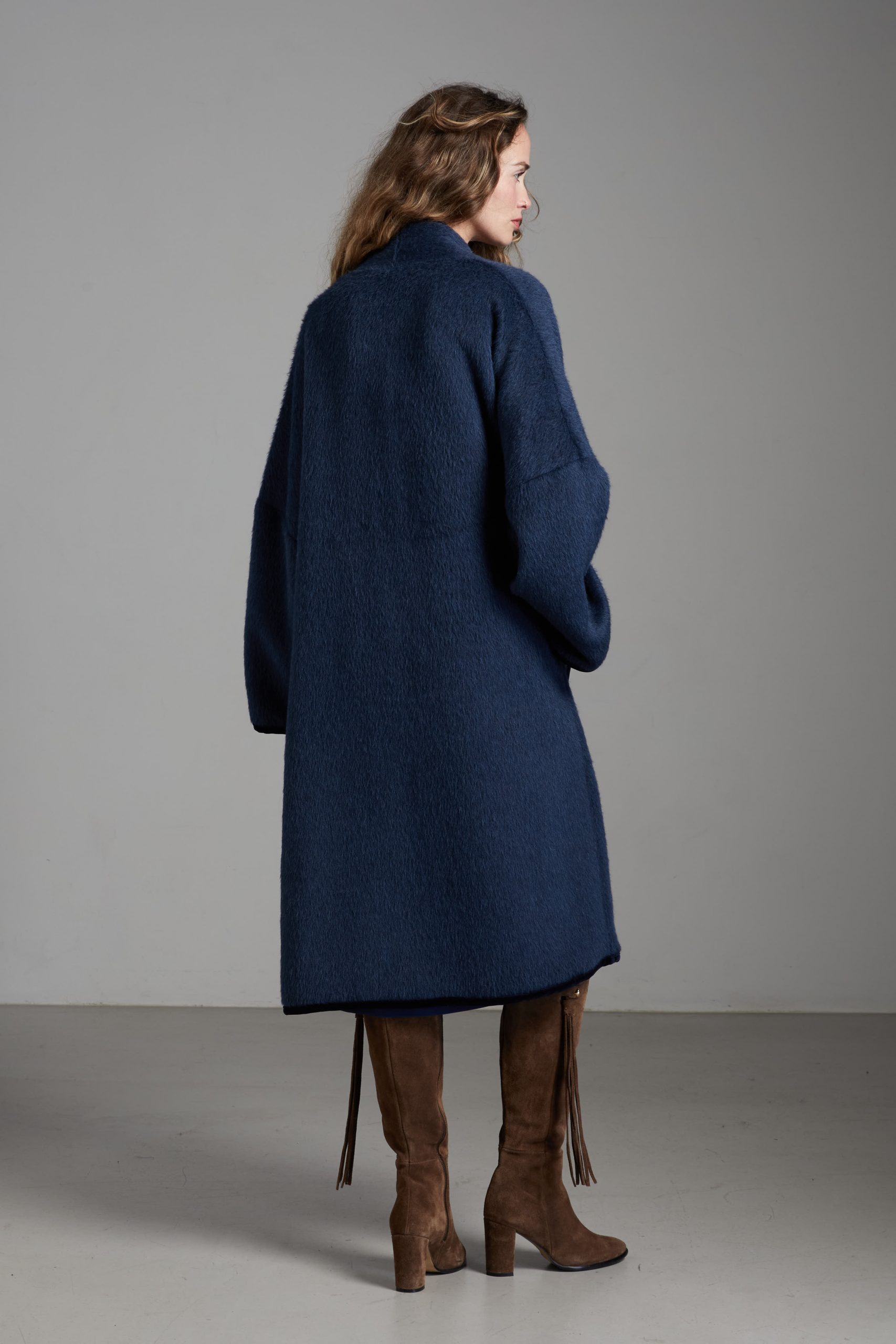 Spolverino Ines di Carla Saibene, in lana e alpaca blu petrolio. Questo modello ha un taglio dritto e over, contemporaneamente chic e confortevole.