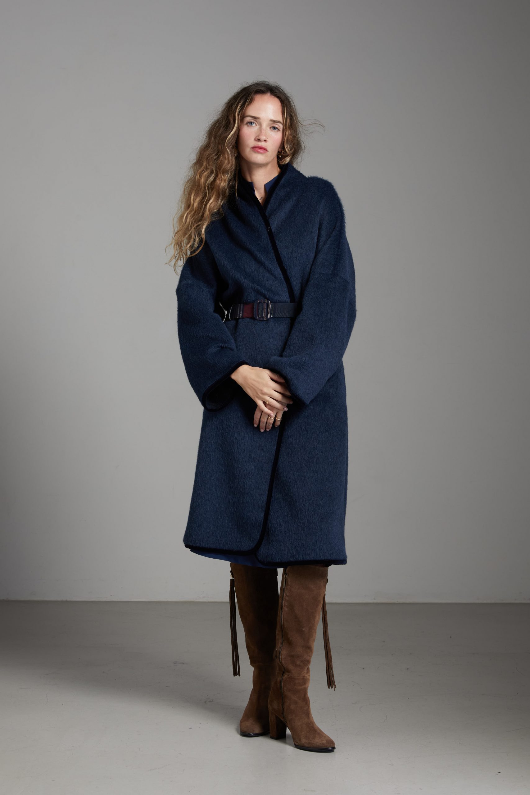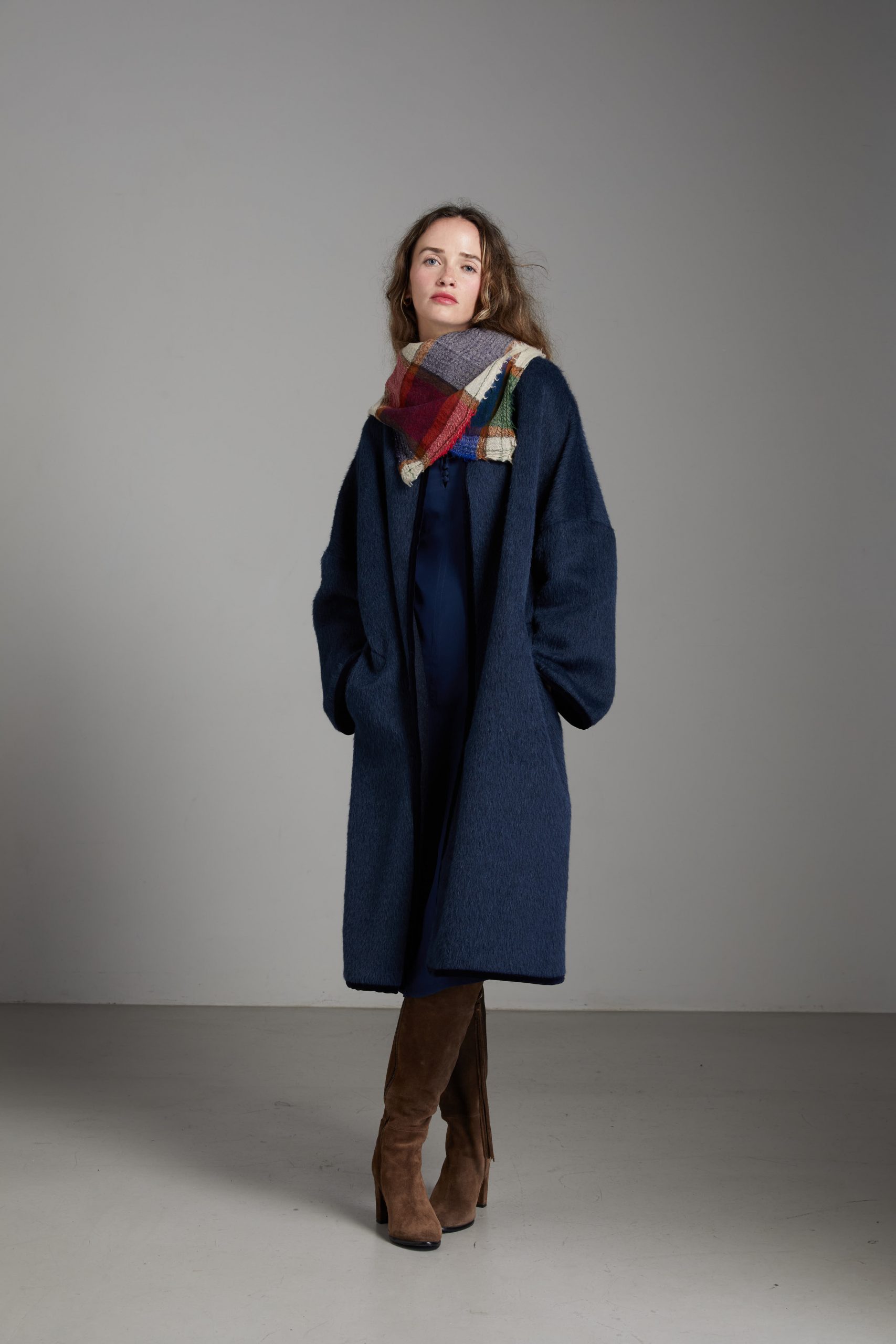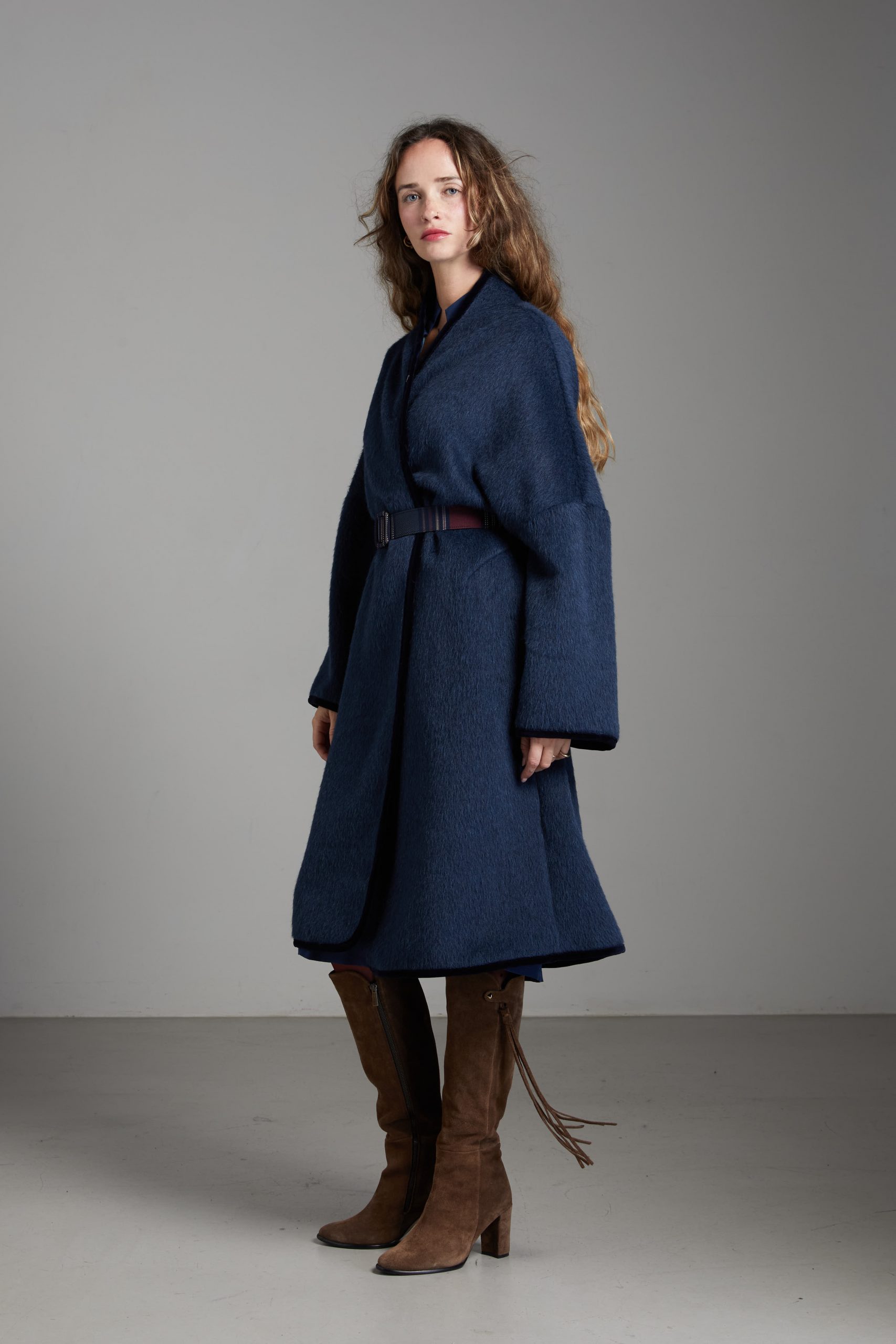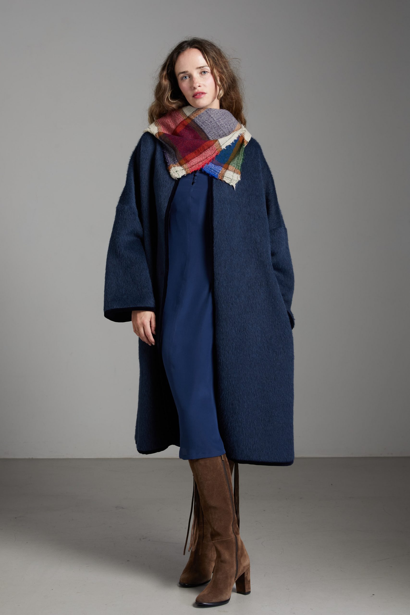 Spolverino Ines di Carla Saibene, in lana e alpaca blu petrolio. Questo modello ha un taglio dritto e over, contemporaneamente chic e confortevole.