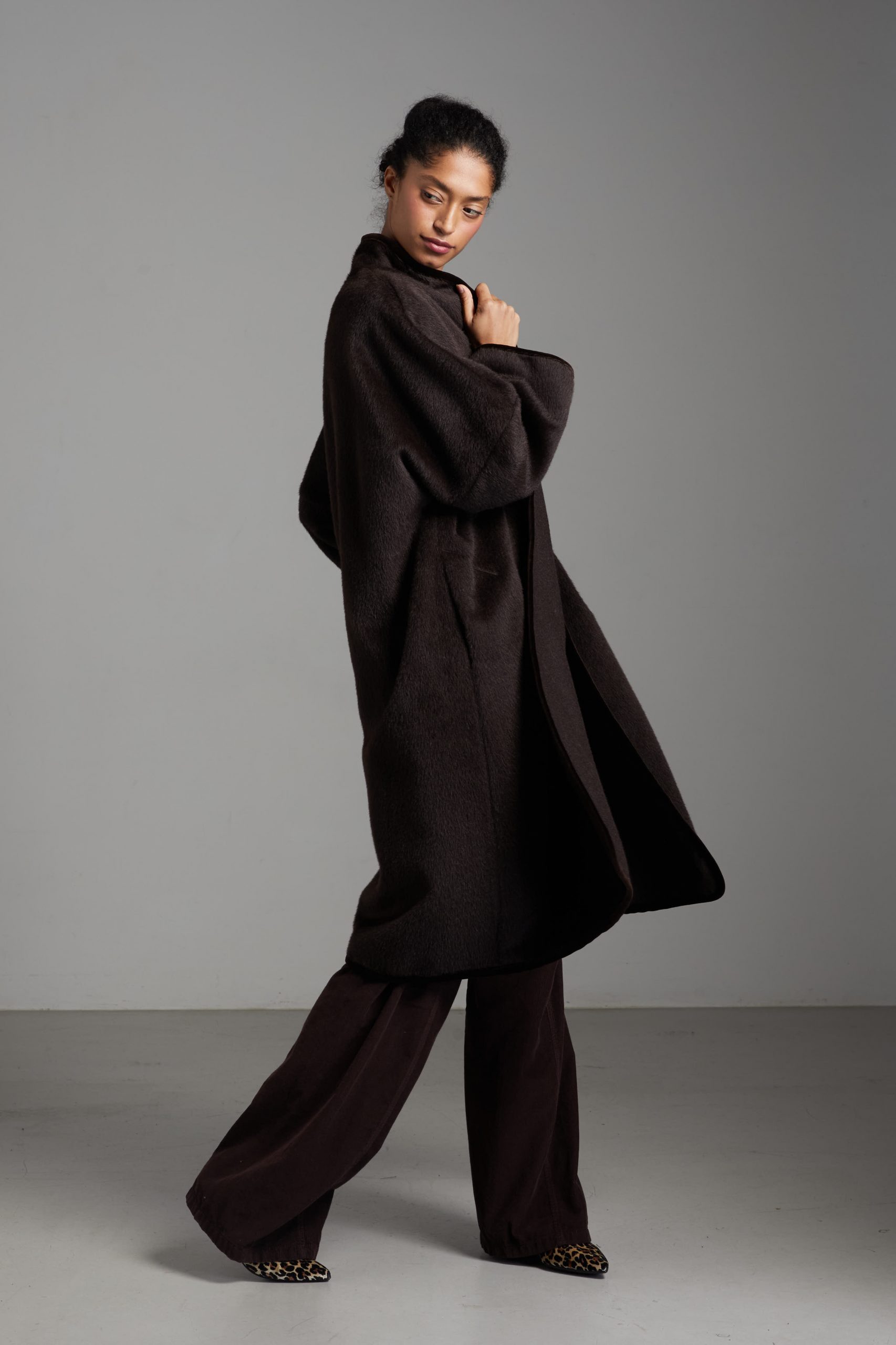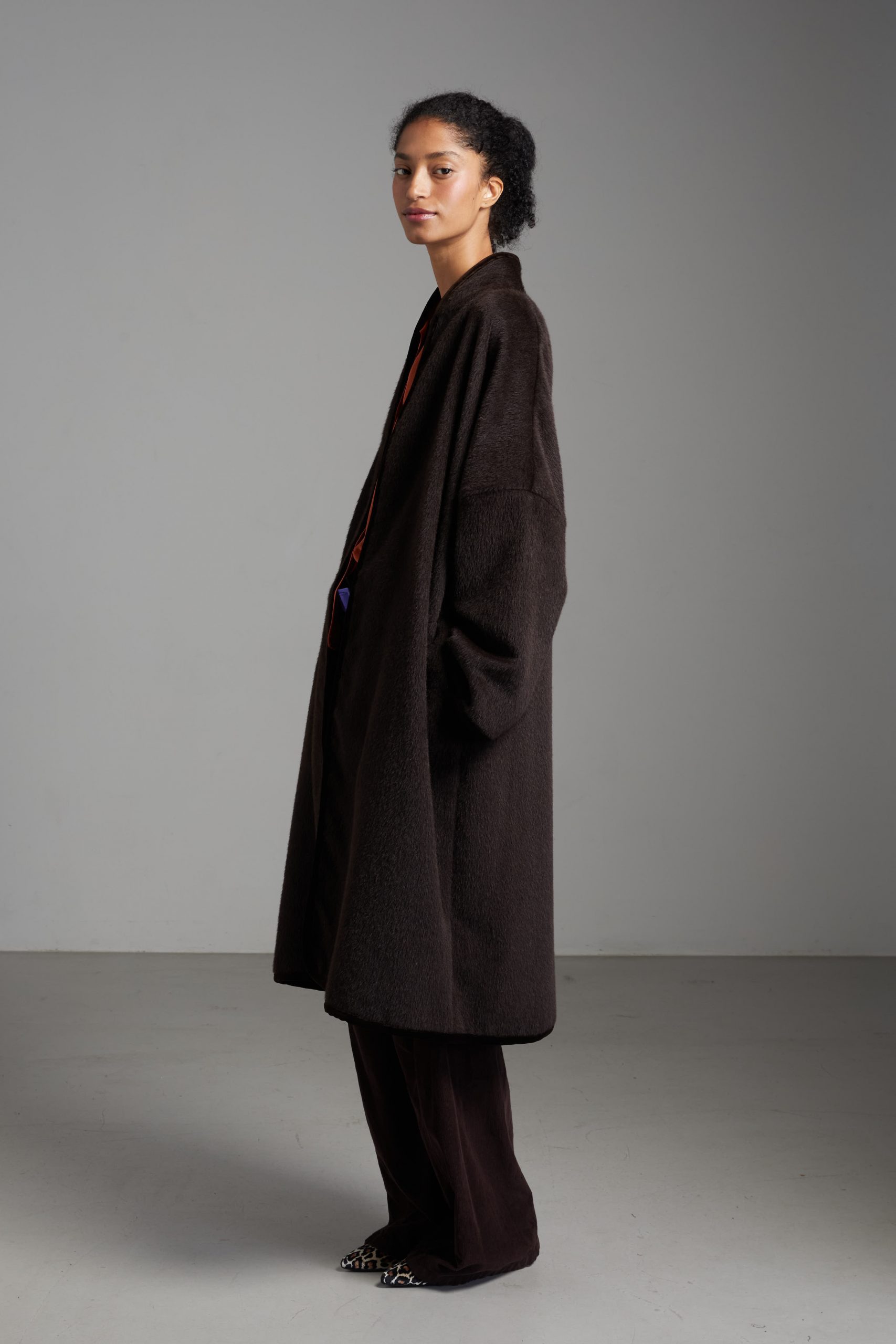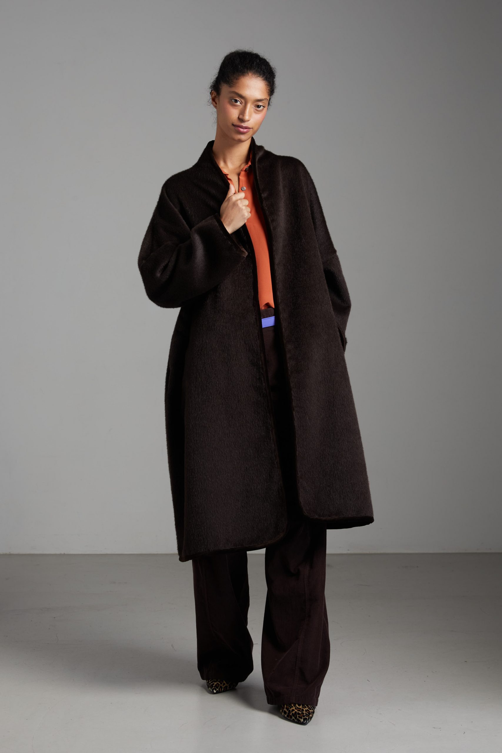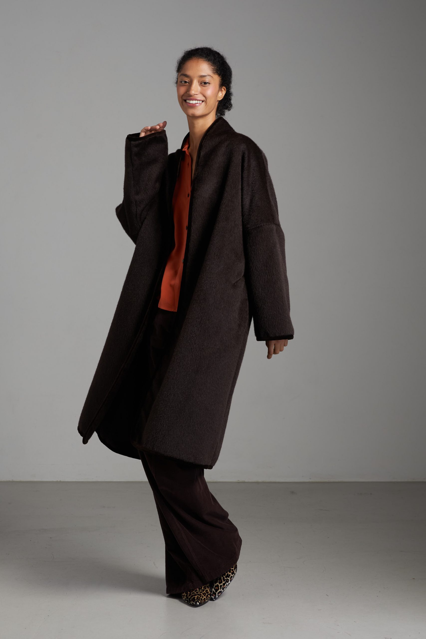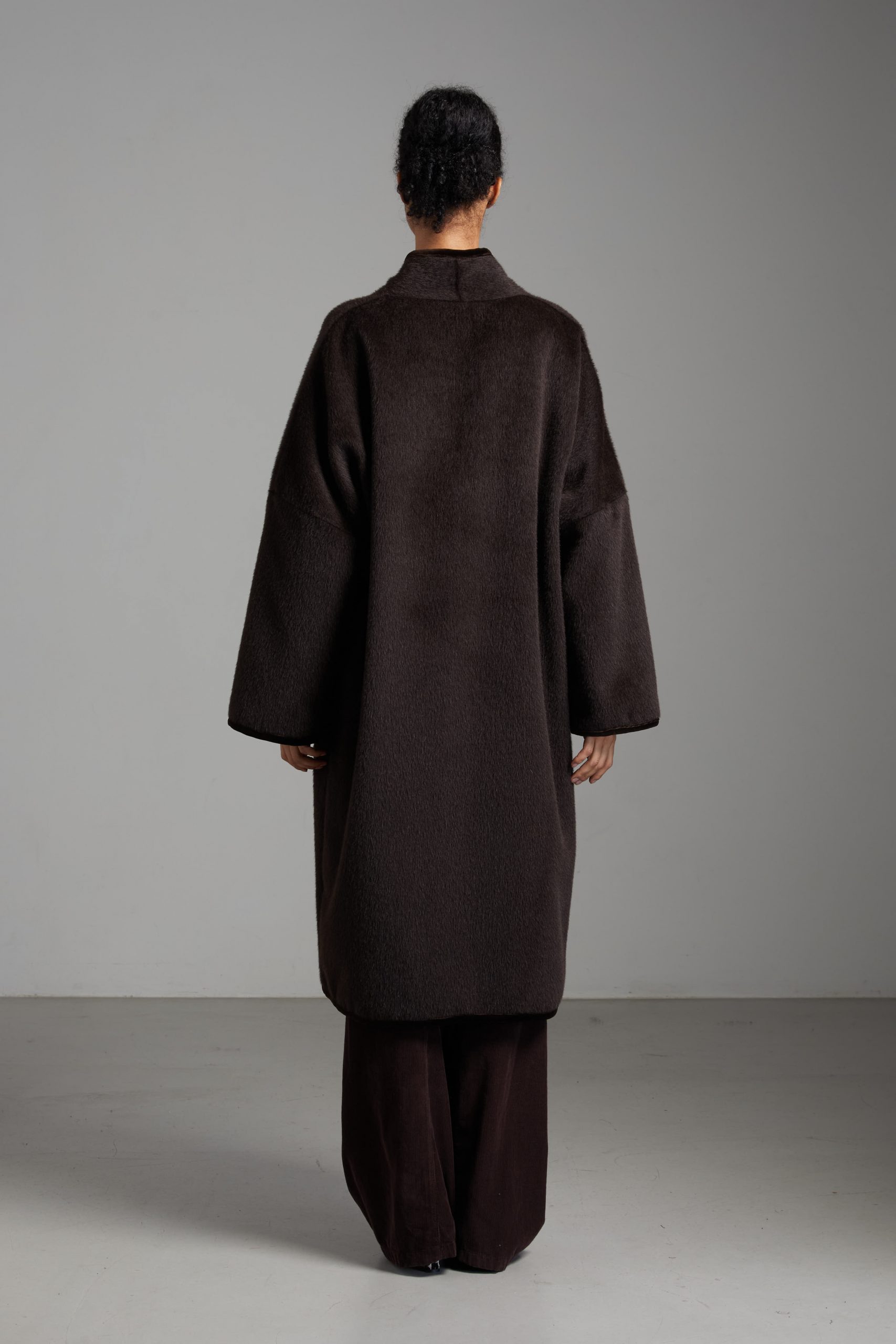 Spolverino Ines di Carla Saibene, in lana e alpaca marrone caffè. Questo modello ha un taglio dritto e over, contemporaneamente chic e confortevole.