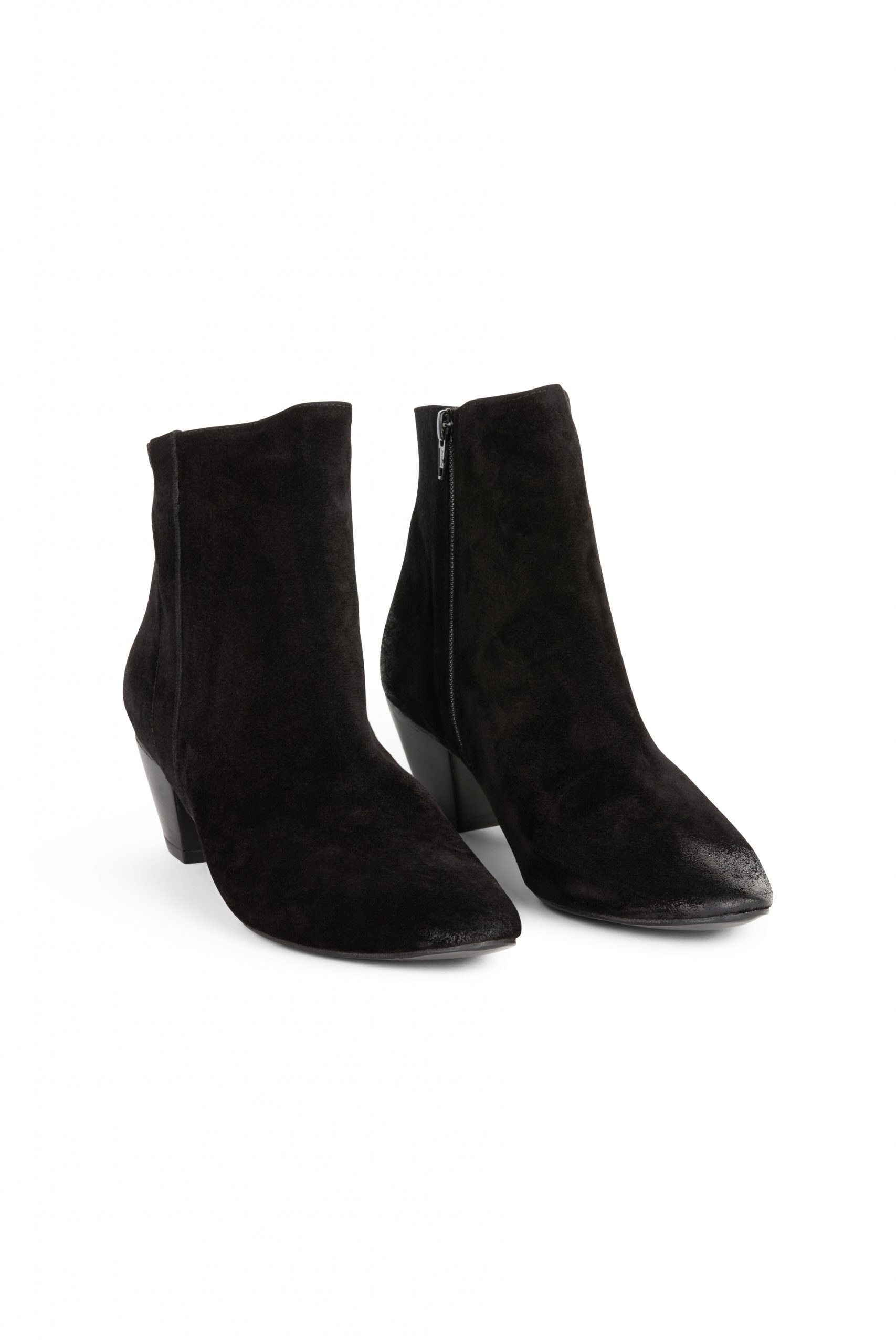 Stivaletti scamosciati in crosta nera invecchiata su punta e tallone di Kudetà, con zip laterale e tacco alto 55 cm. Realizzati a mano, sono comodissimi e resistenti, perfetti da indossare tutto il giorno.