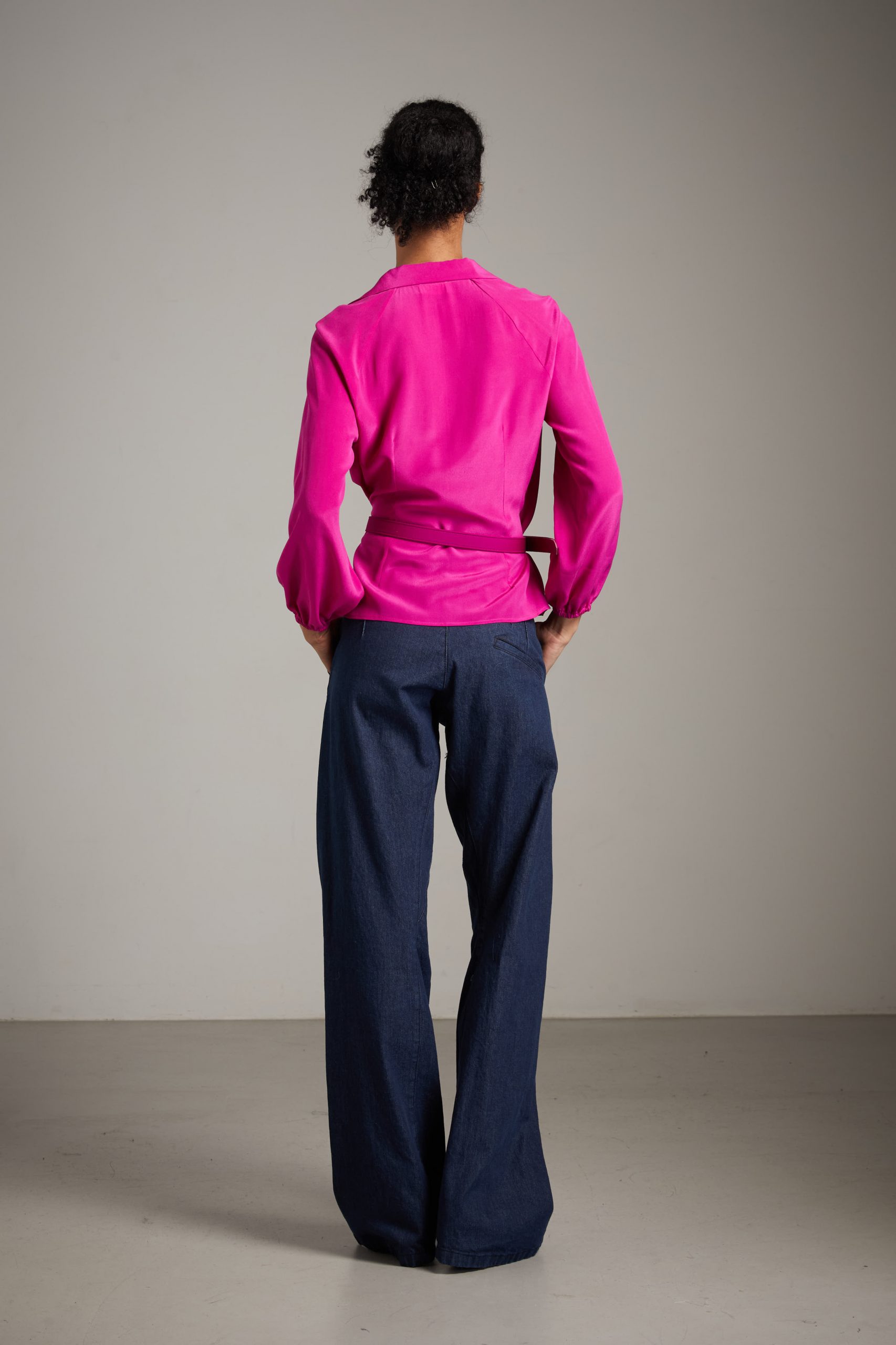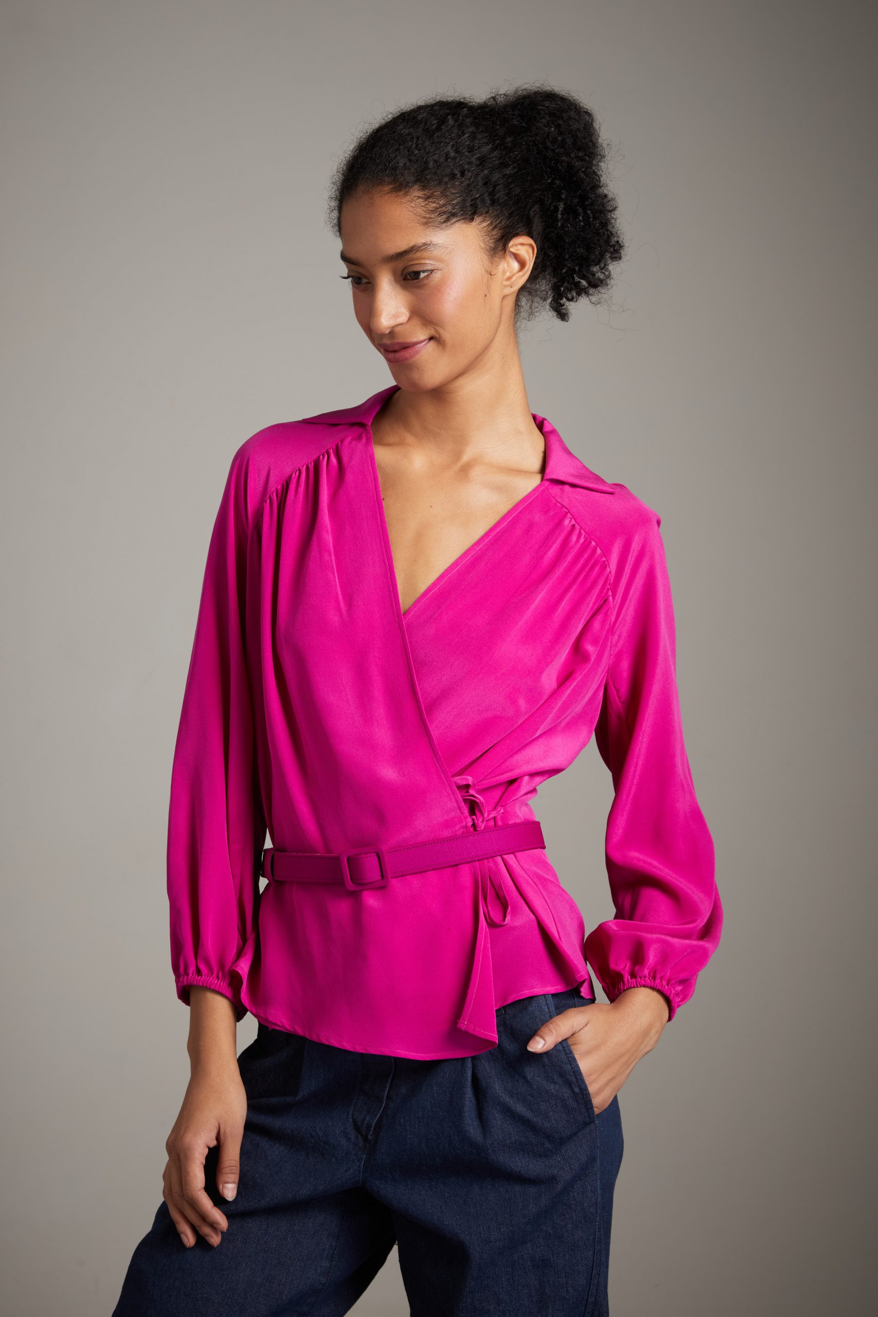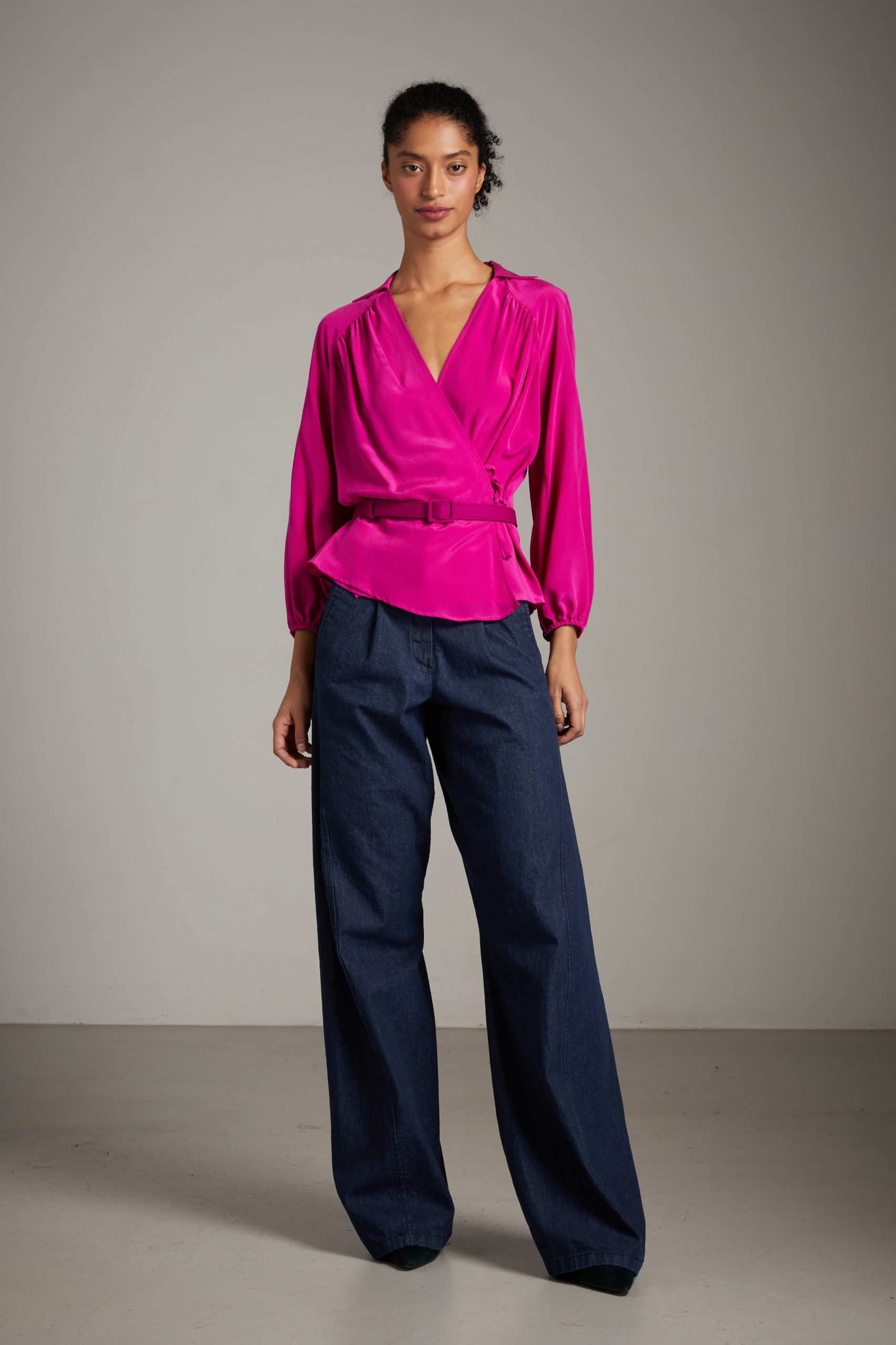Top Anita di Carla Saibene in seta crepe de chine ciclamino, un modello molto donante, con piccolo colletto, arriciato sulle spalle a maniche lunghe a sbuffo, incrociato e chiuso da piccoli laccetti.