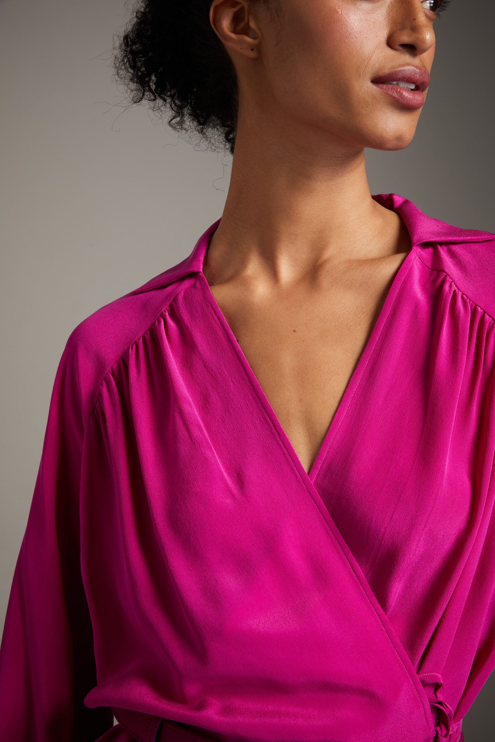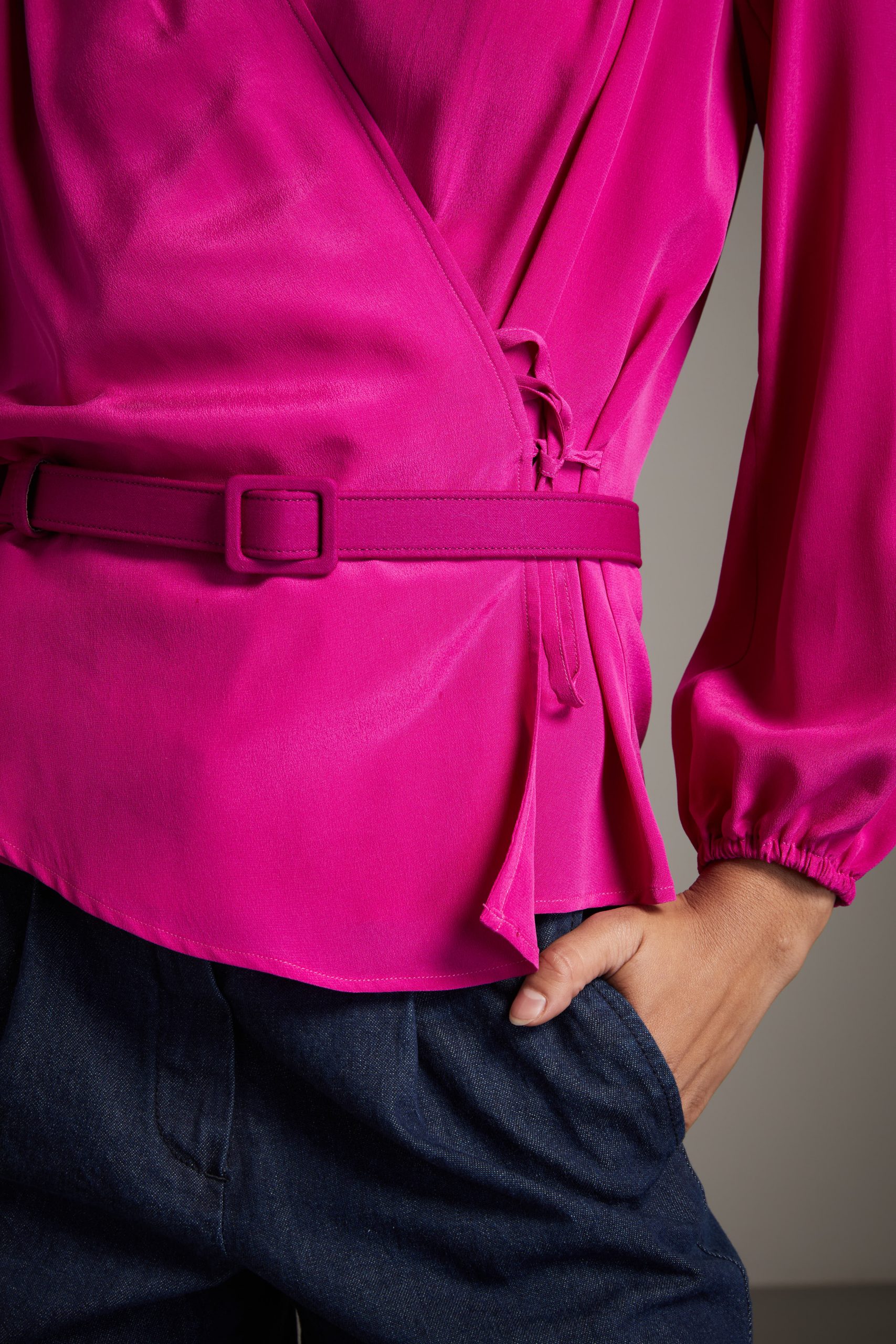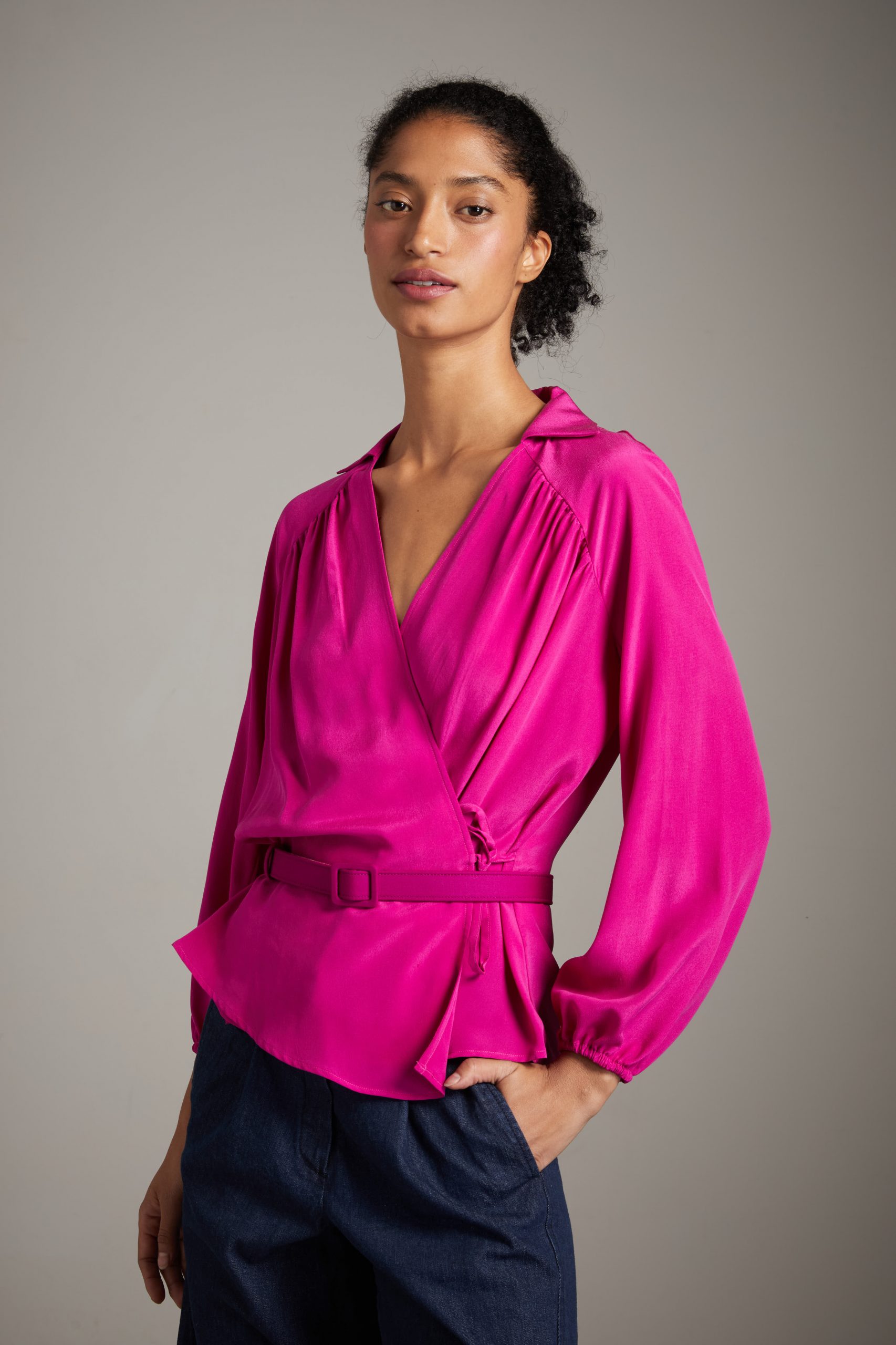 Top Anita di Carla Saibene in seta crepe de chine ciclamino, un modello molto donante, con piccolo colletto, arriciato sulle spalle a maniche lunghe a sbuffo, incrociato e chiuso da piccoli laccetti.