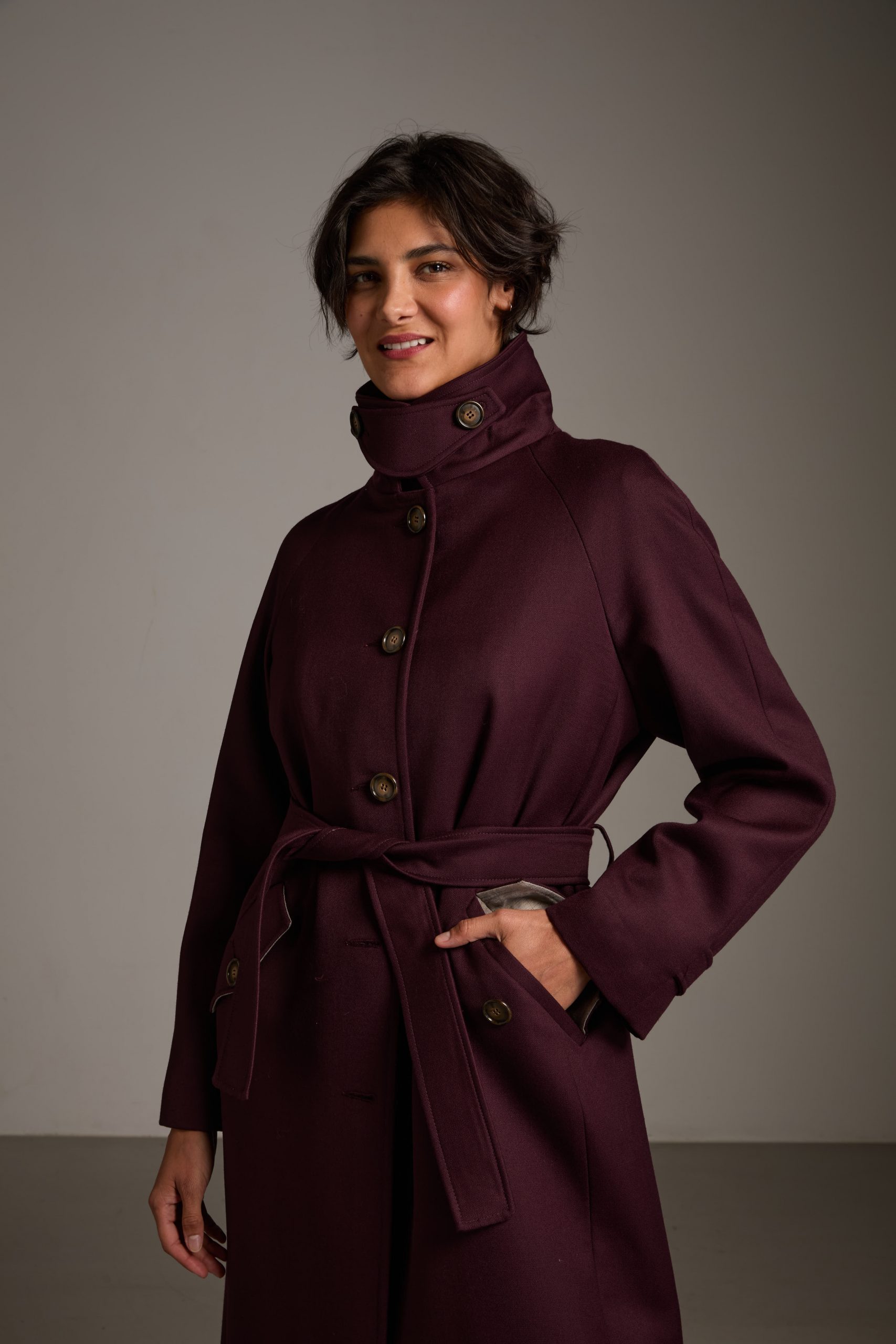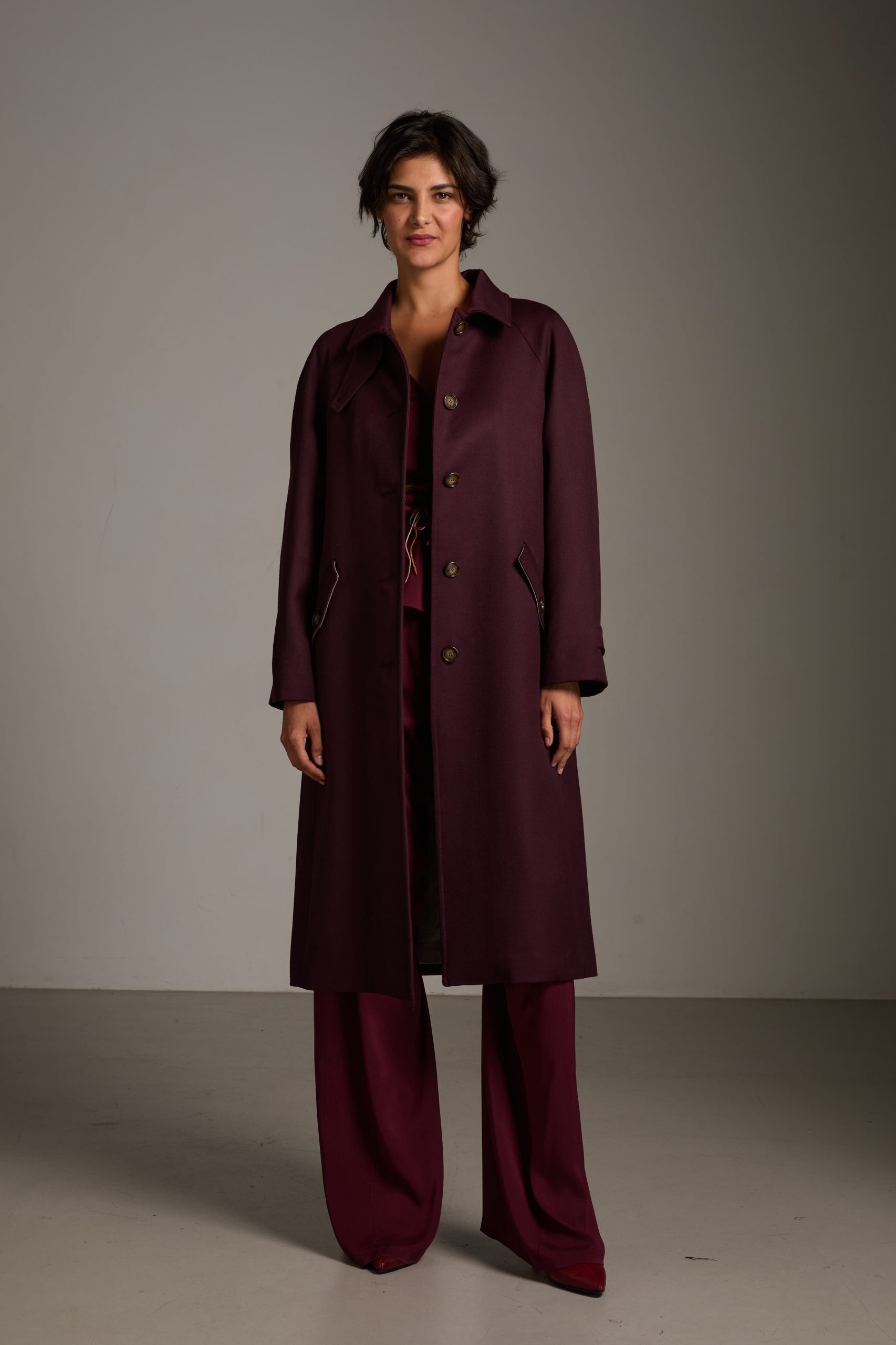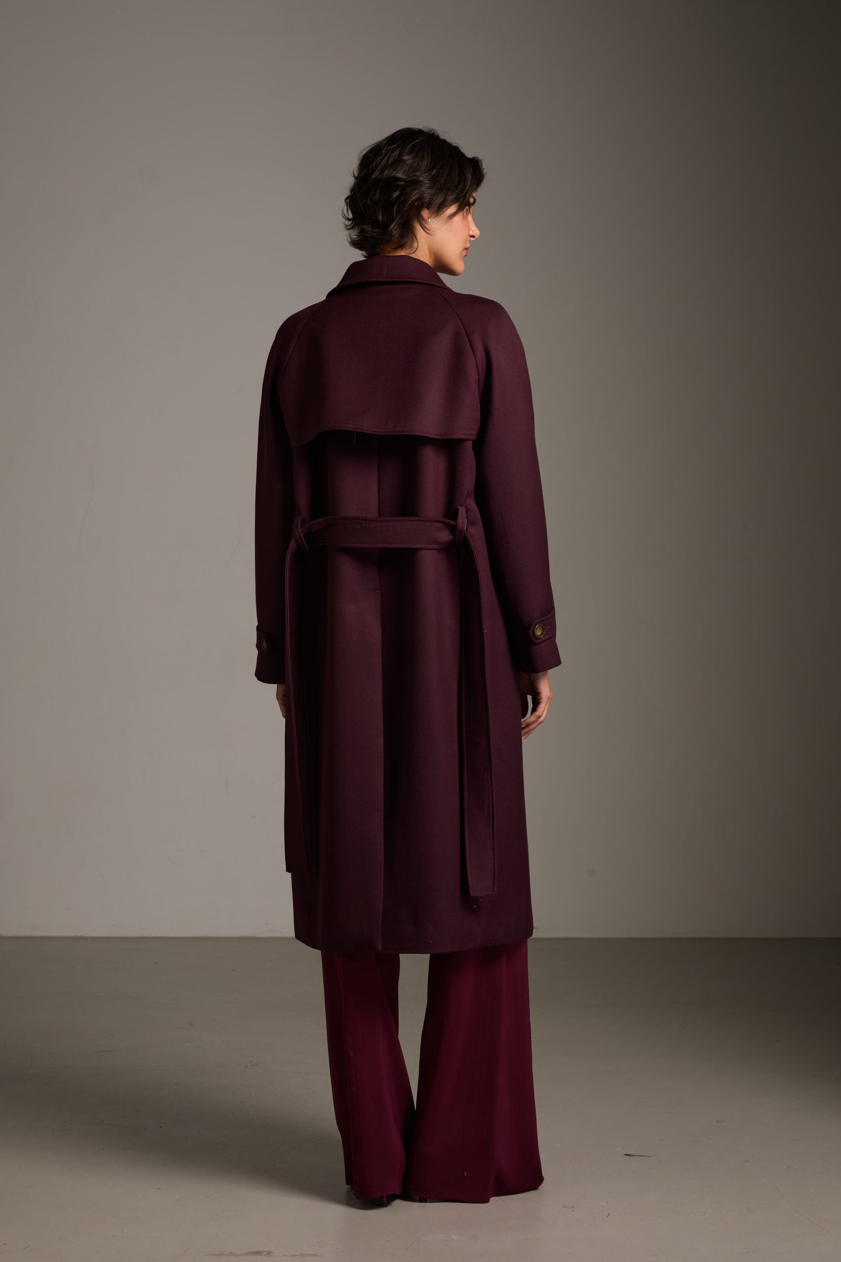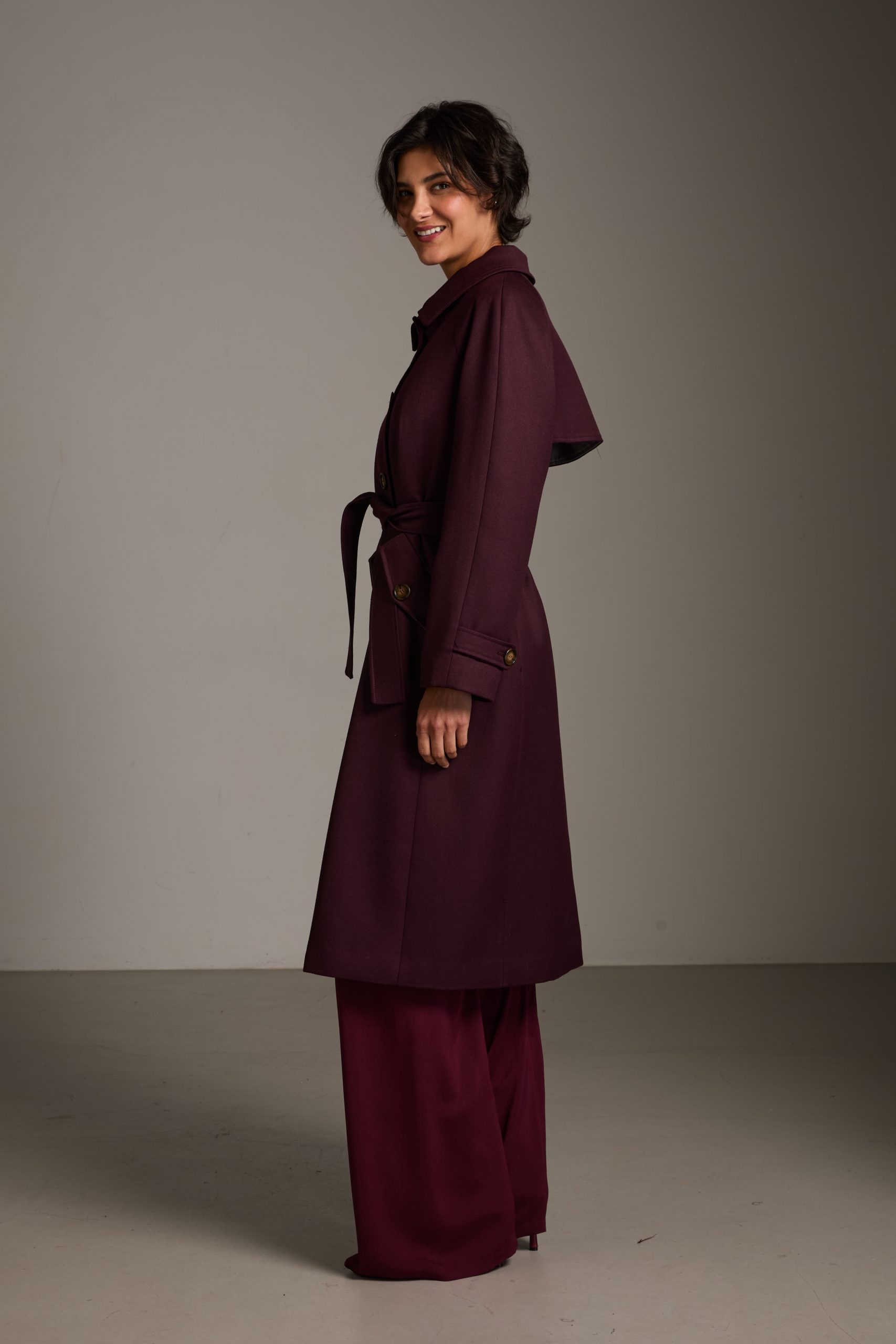Trench Valerie di Carla Saibene, in lana prugna, dalla linea dritta, con manica raglan, piccola mantellina e spacco alto sul retro. Il collo a doppio uso e la cintura che può essere annodata sia internamente che esternamente, sono studiati per rendere questo capo molto pratico e versatile