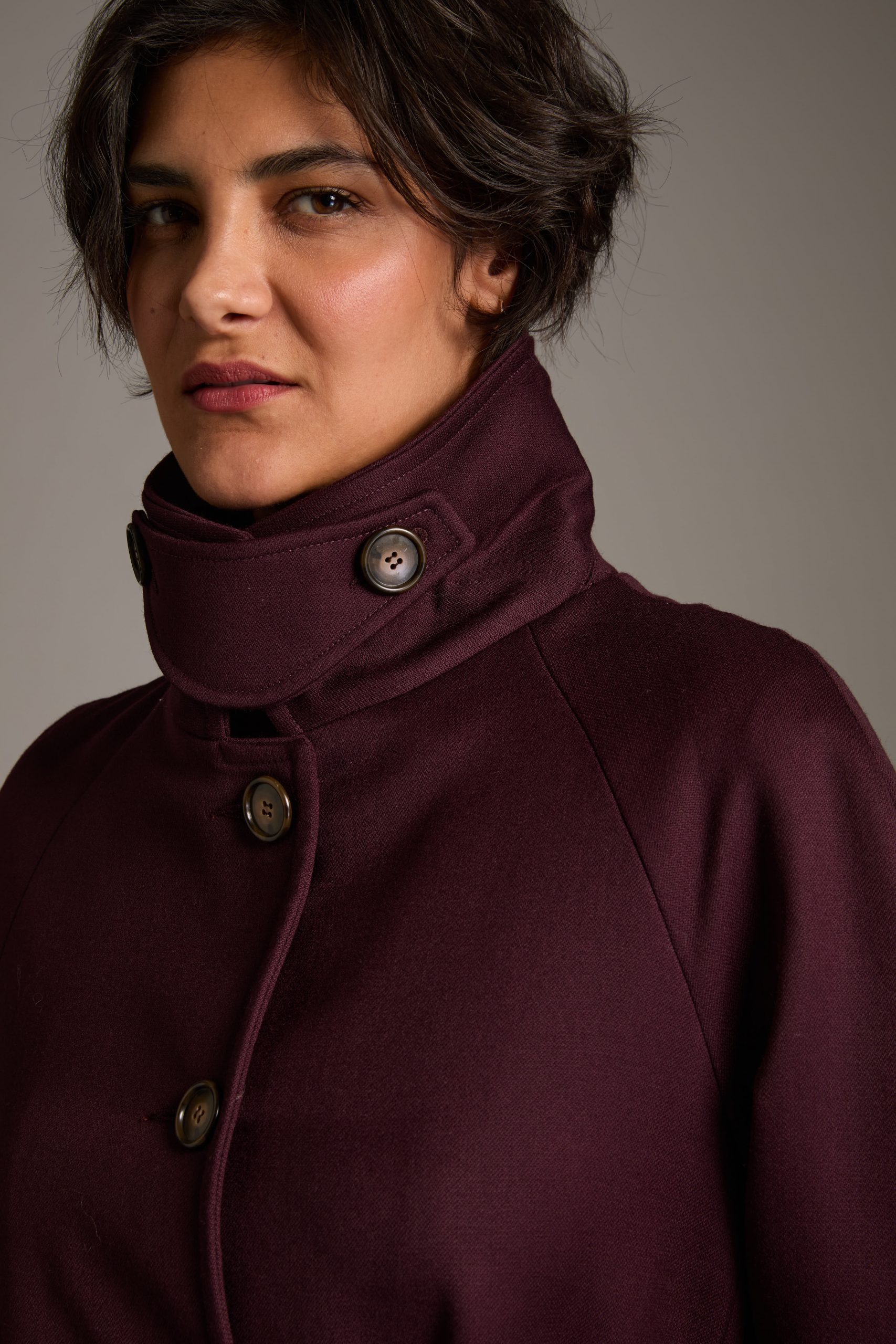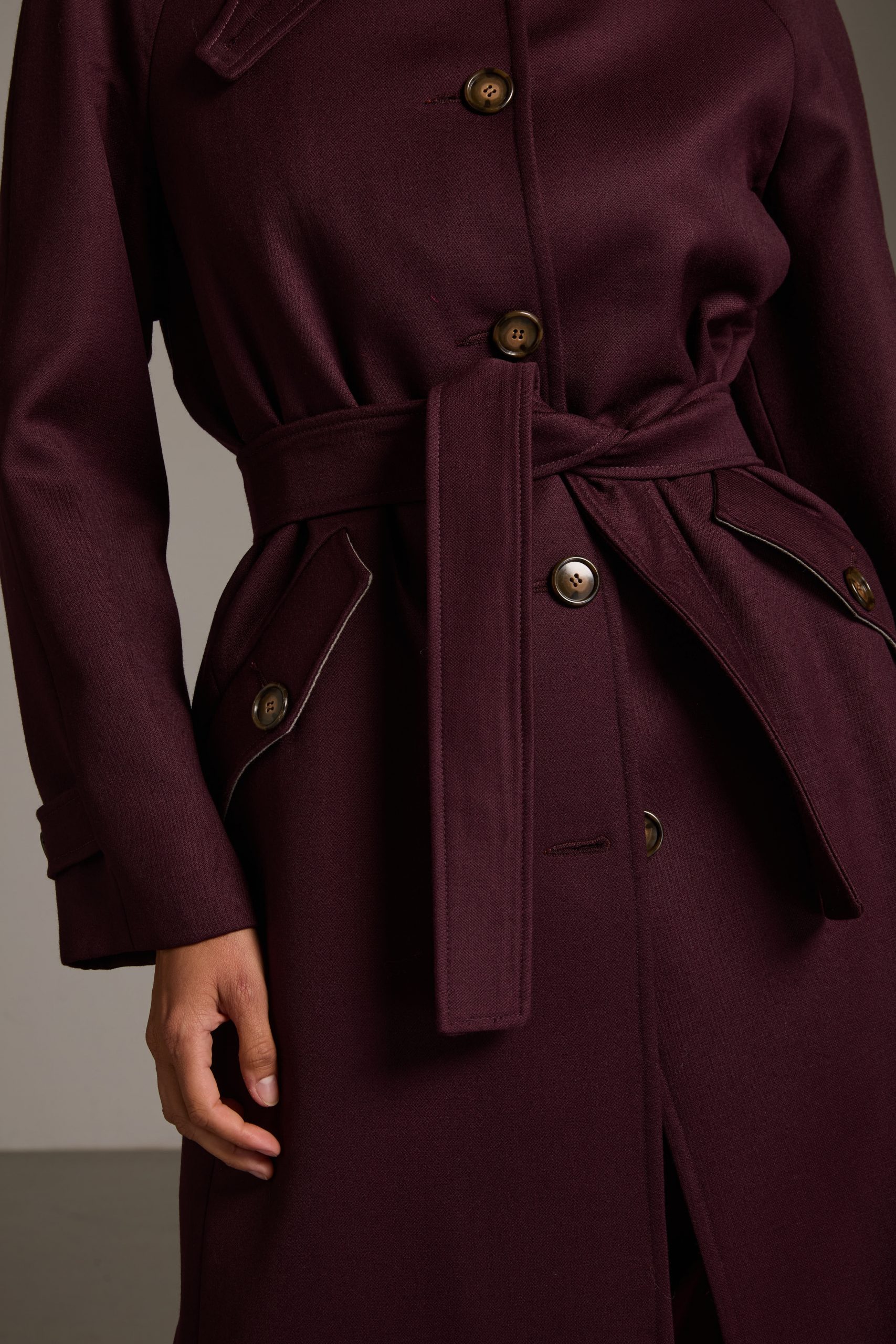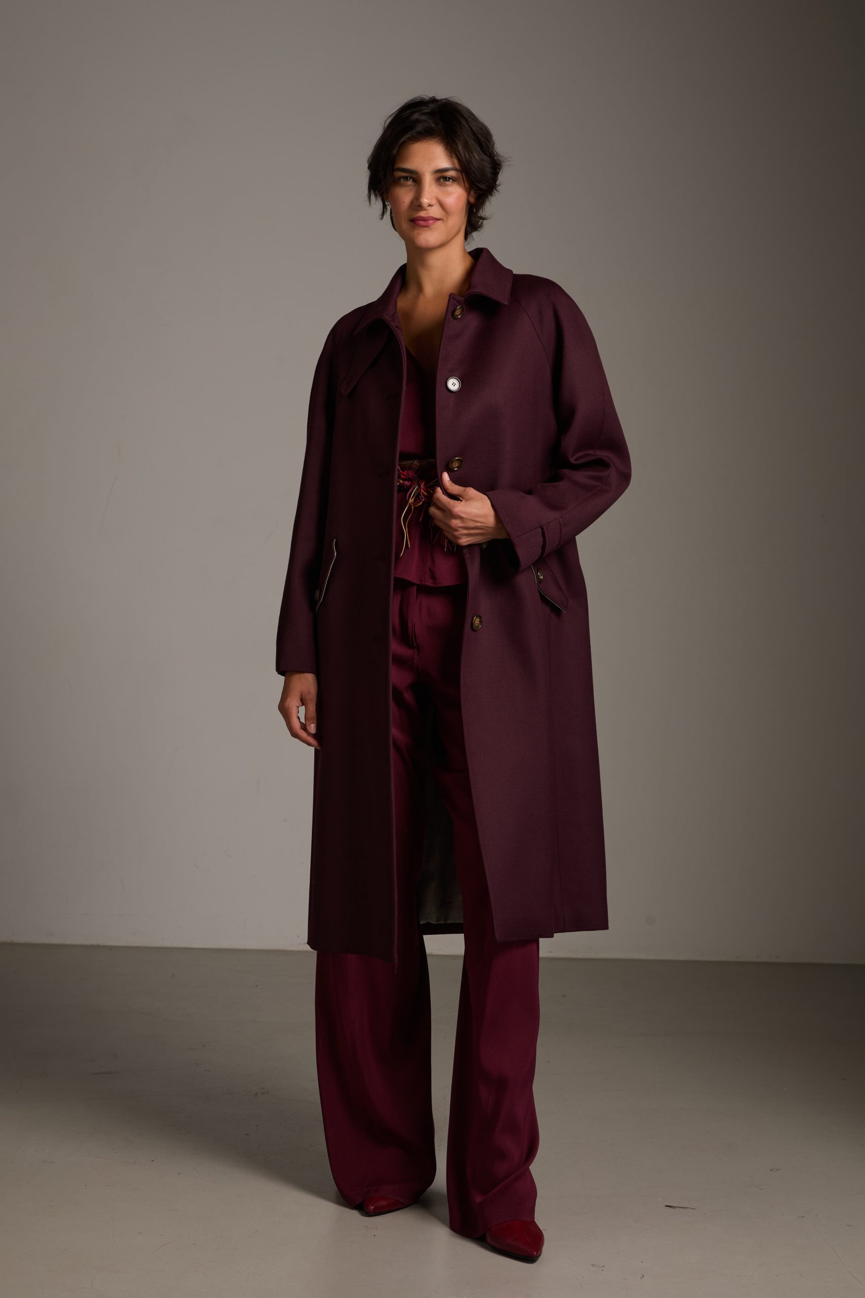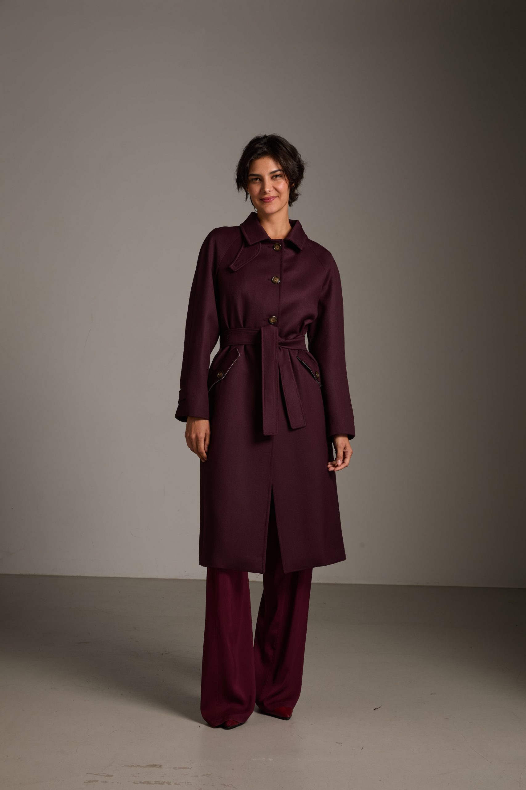 Trench Valerie di Carla Saibene, in lana prugna, dalla linea dritta, con manica raglan, piccola mantellina e spacco alto sul retro. Il collo a doppio uso e la cintura che può essere annodata sia internamente che esternamente, sono studiati per rendere questo capo molto pratico e versatile